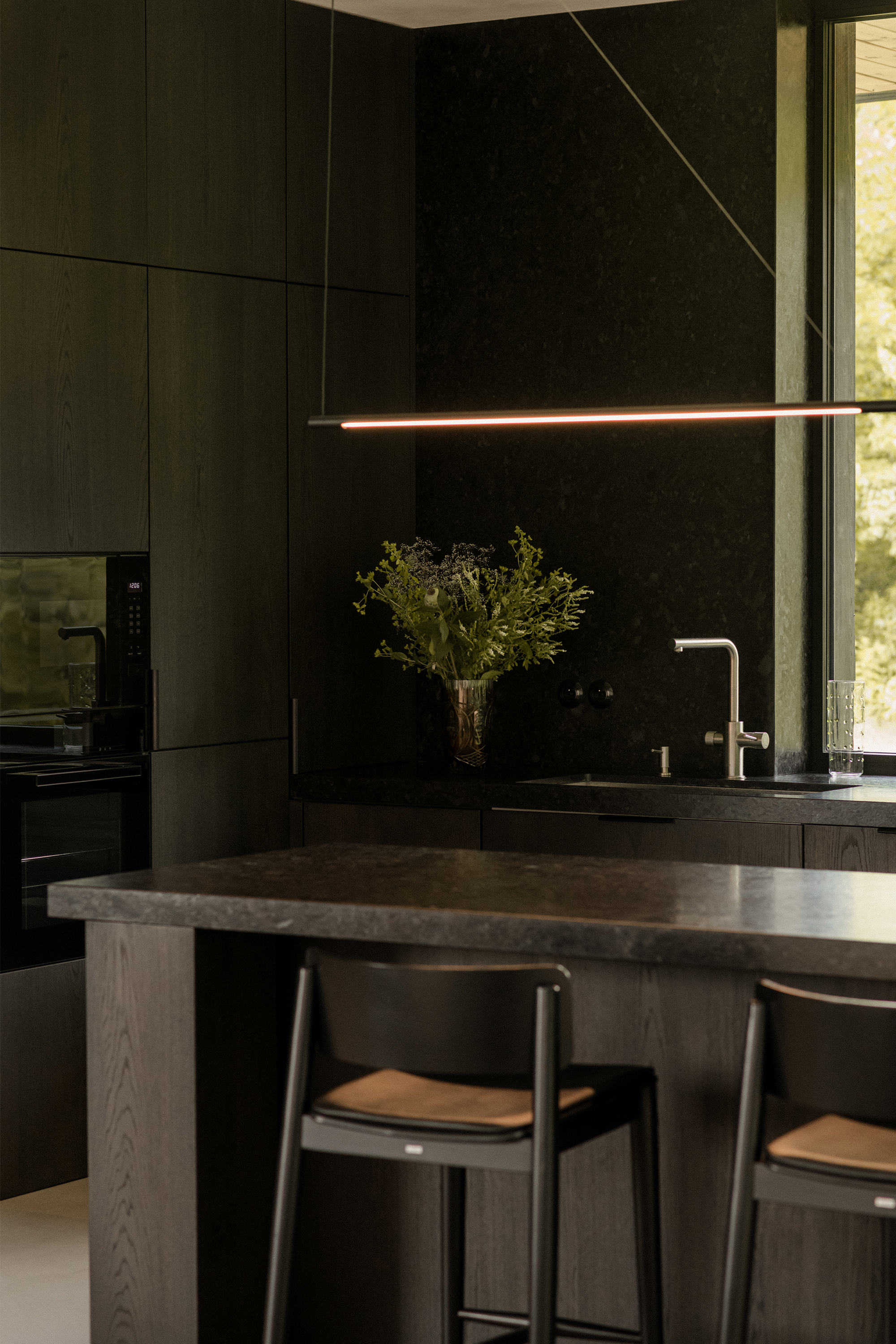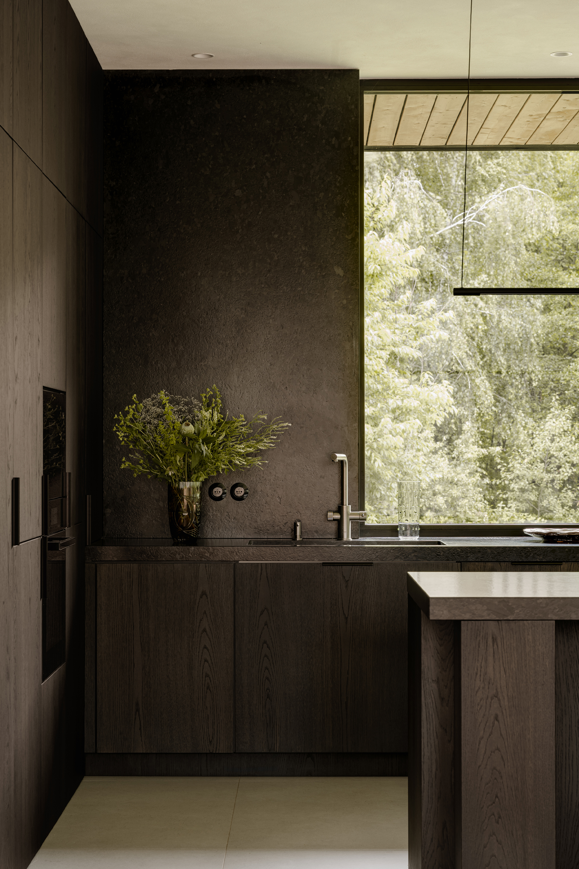 The material palette is based on natural and honest surfaces. The façade is clad in black timber burned in the shou sugi ban technique. Inside, dark stained oak continues this motif, complemented by lighter oak for floors and furniture, and natural clay plaster on walls and ceilings. Granite stone was used in the kitchen and naica quartzite in the bathrooms. The color scheme reflects calm natural tones of beige and light wood, contrasted with deep brown and black elements echoing the façade. These are complemented by earthy reds and rust tones, adding energy and character, particularly in furniture details and accessories.