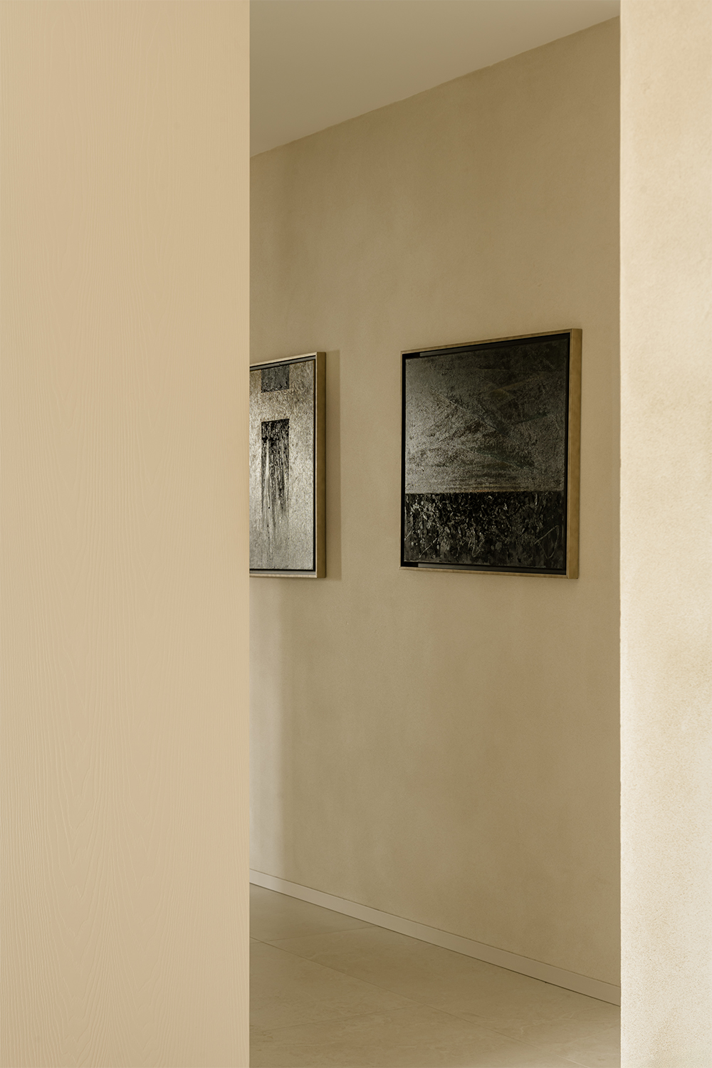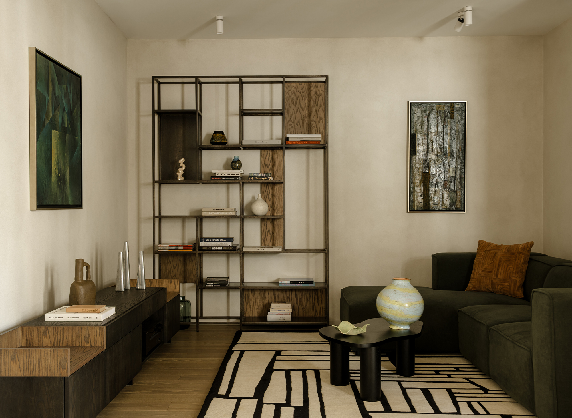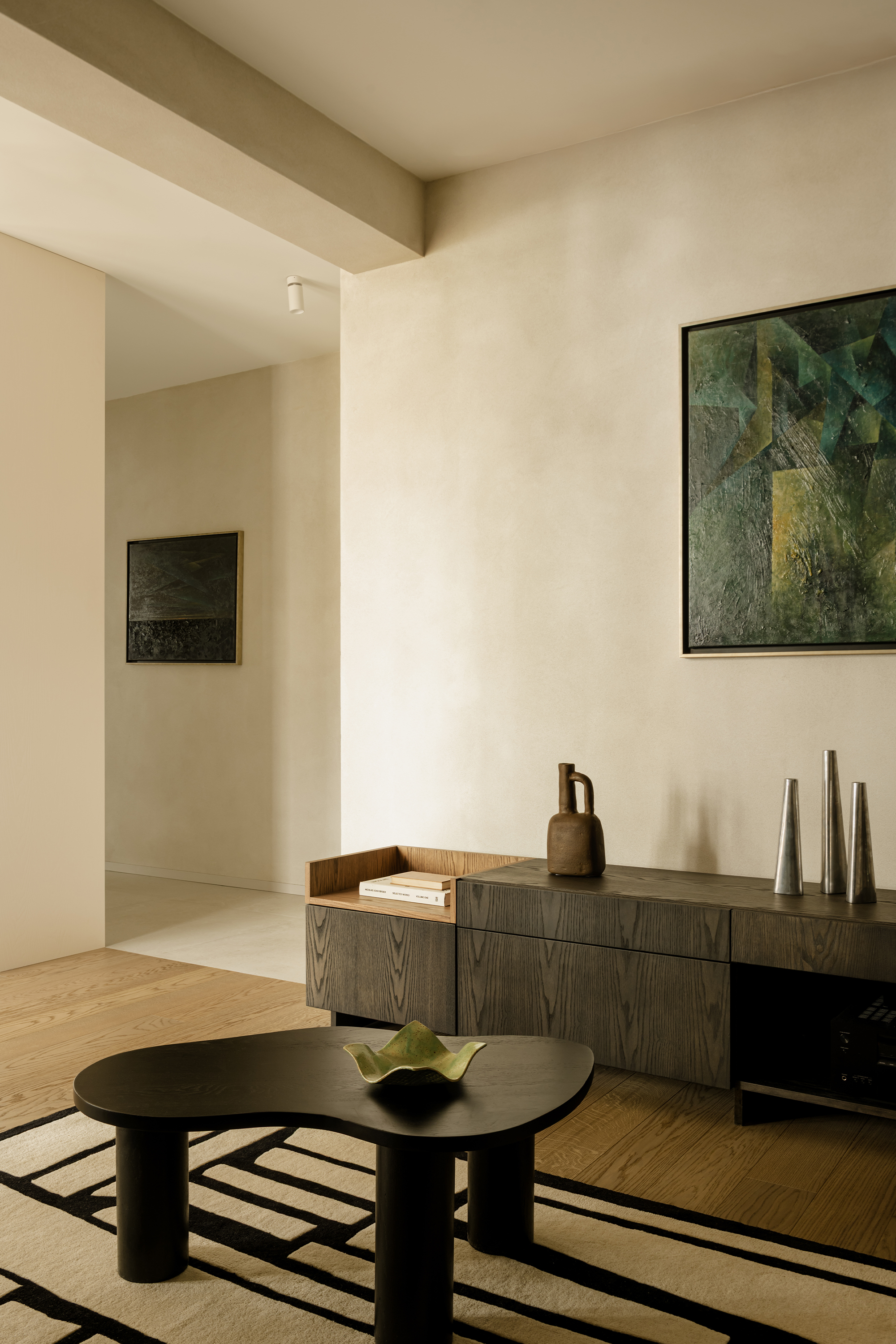 This 60 m² apartment near Nowy Kleparz in Kraków was designed for a close friend – painter Roman Kondratiuk. The goal was to create a comfortable living space that also works as a personal gallery, allowing the interior to complement his expressive art. Subtle contrasts in materials and colour help balance the artworks without dominating them.