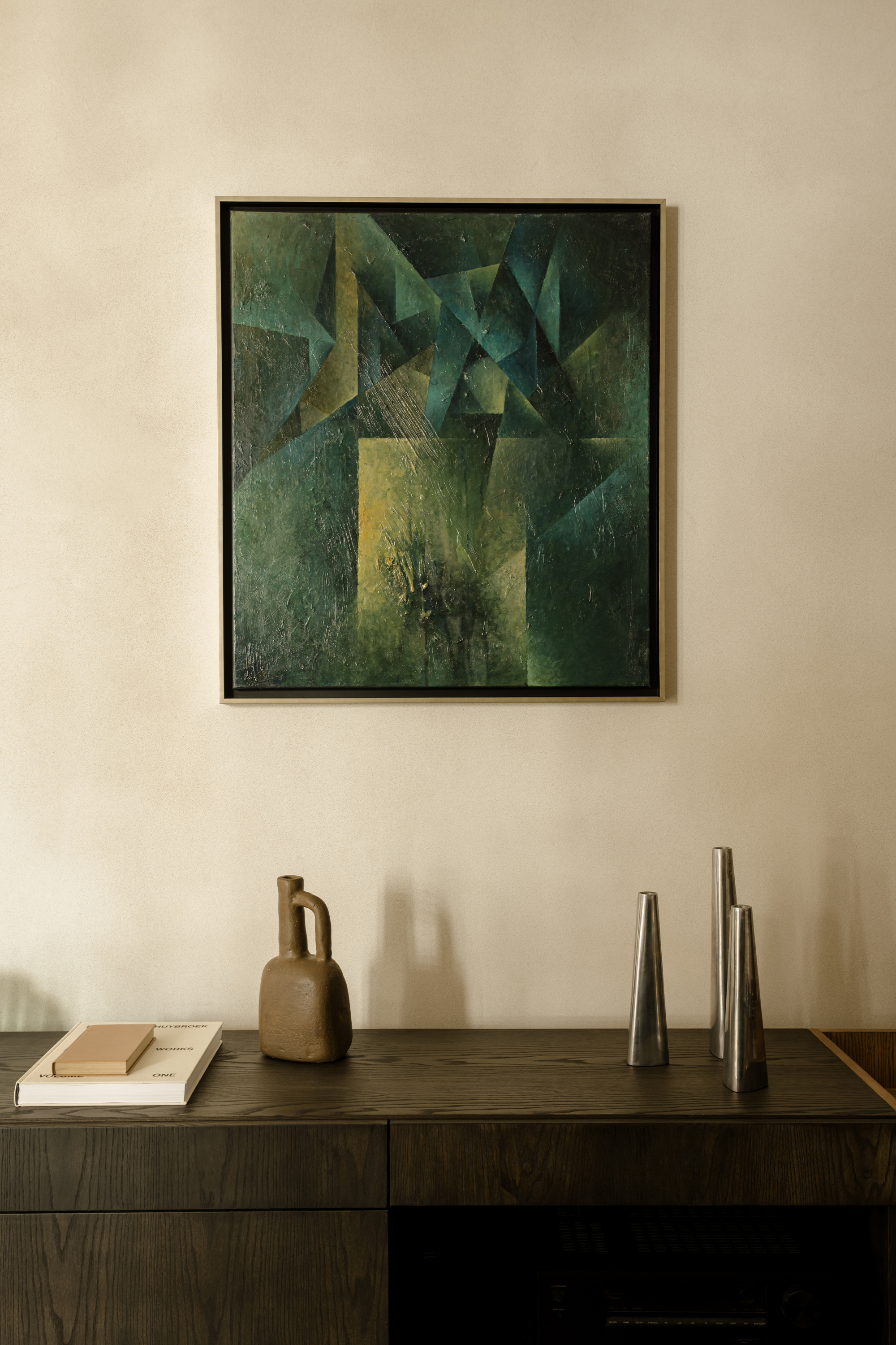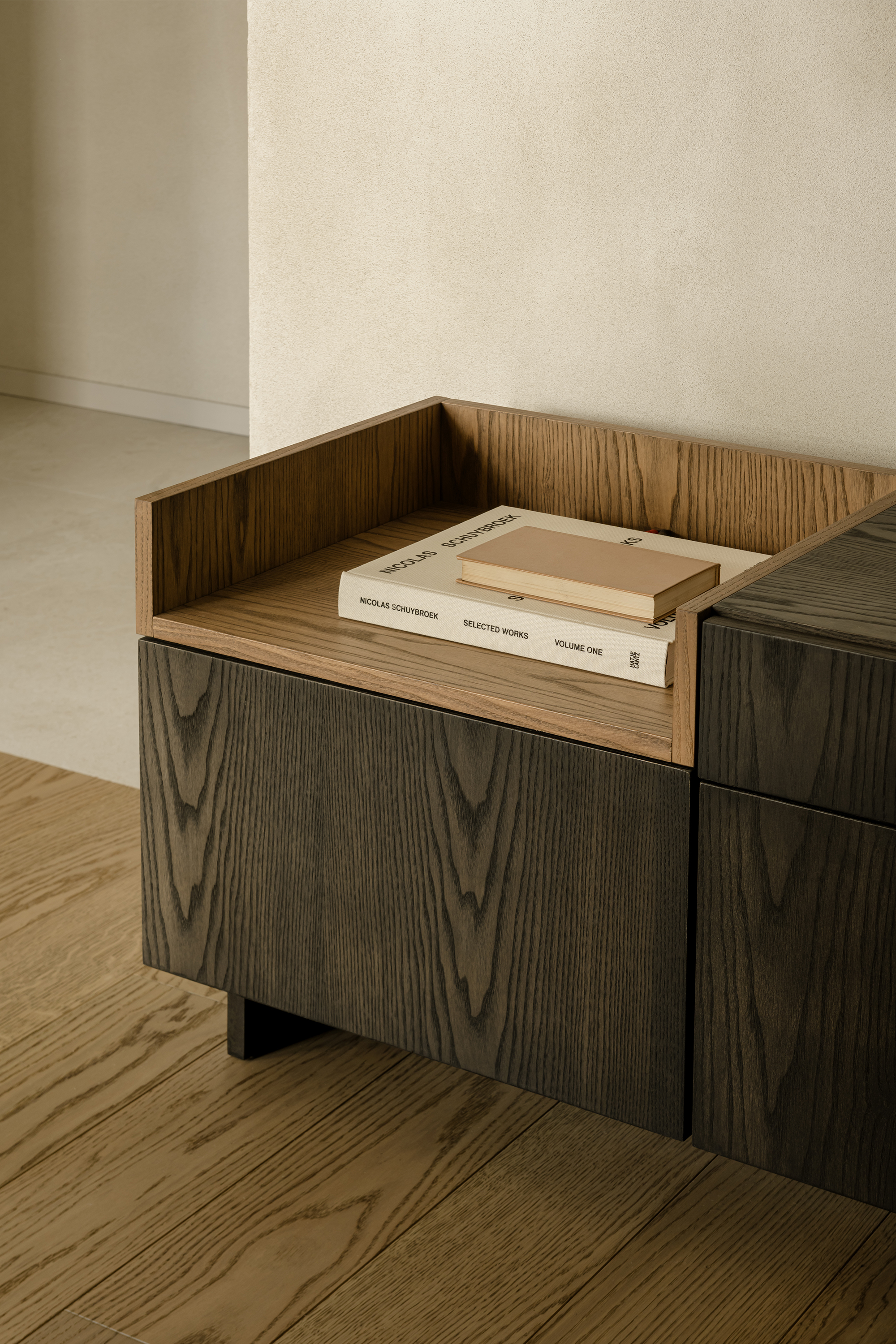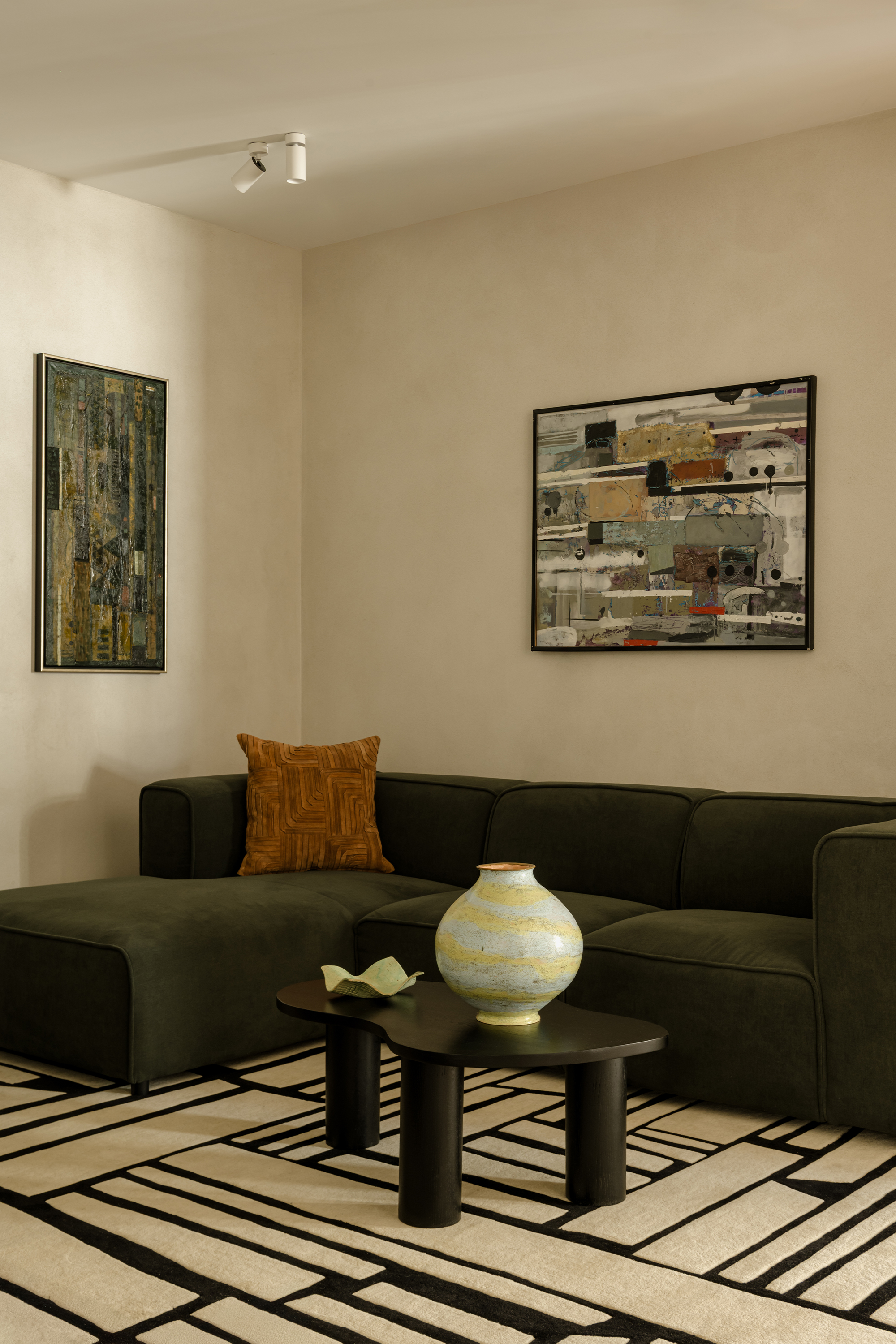 This 60 m² apartment near Nowy Kleparz in Kraków was designed for a close friend – painter Roman Kondratiuk. The goal was to create a comfortable living space that also works as a personal gallery, allowing the interior to complement his expressive art. Subtle contrasts in materials and colour help balance the artworks without dominating them.