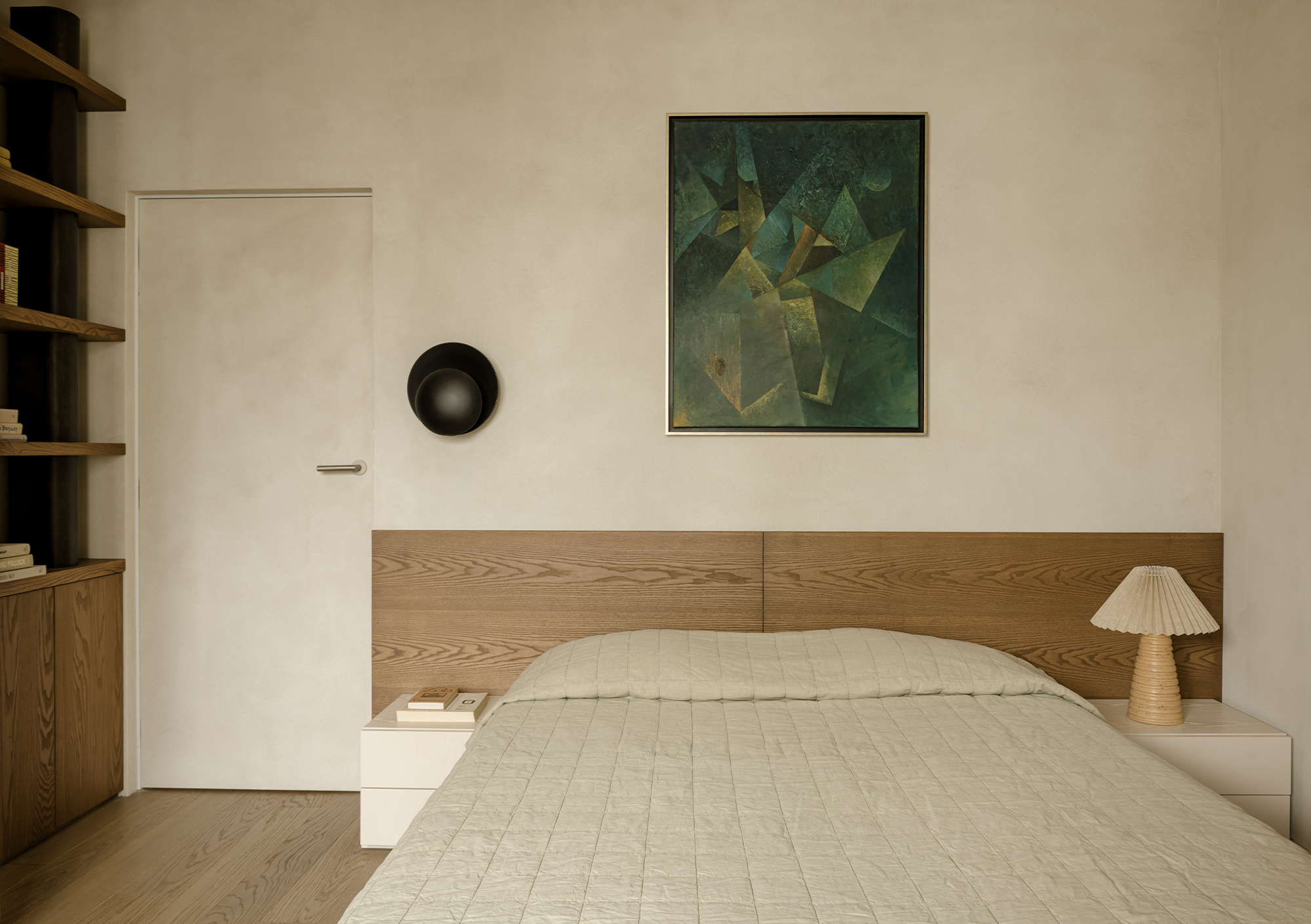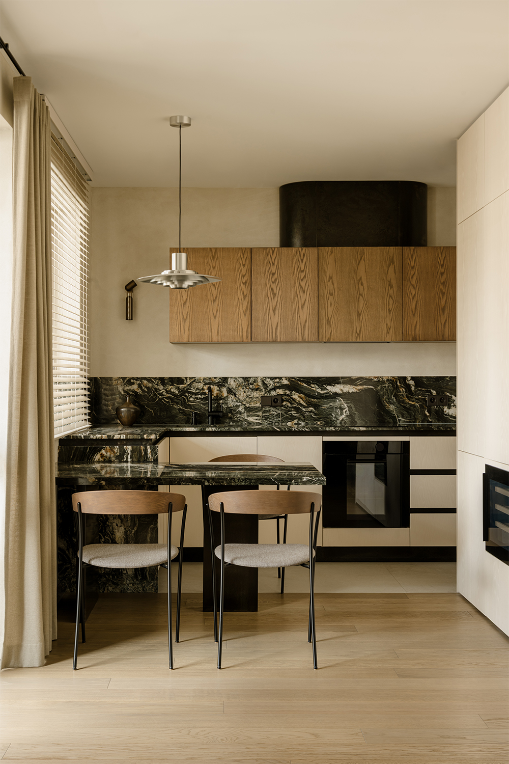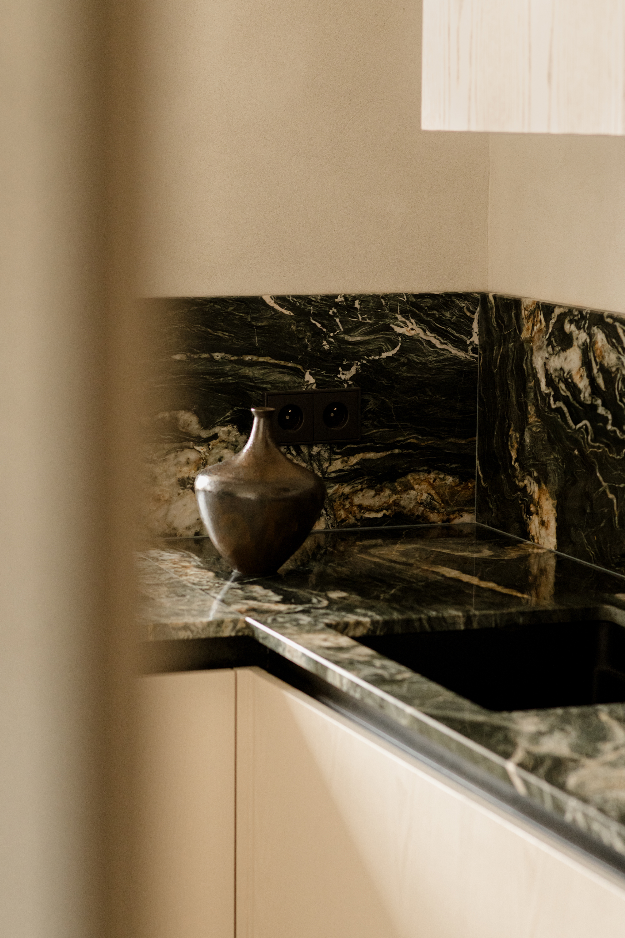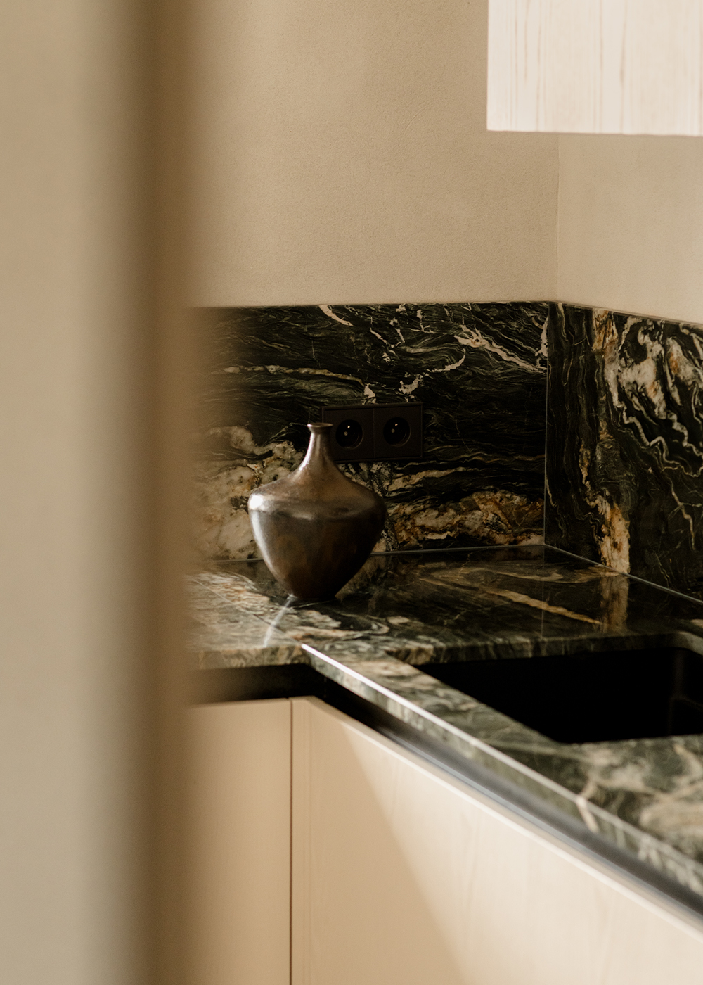 A Belvedere quartzite table, matching the kitchen countertops, acts as a central point of the day zone. Firek’s custom furniture is paired with selected Scandinavian pieces – a metal ceiling lamp by Jørgen Kastholm & Preben Juhl Fabricius (&Tradition) and New Works chairs. A rug from Tapis Atelier adds a distinctive black-and-white accent. Unique elements, such as a ceramic bedside lamp and a custom-shaped wall mirror, were made to order.