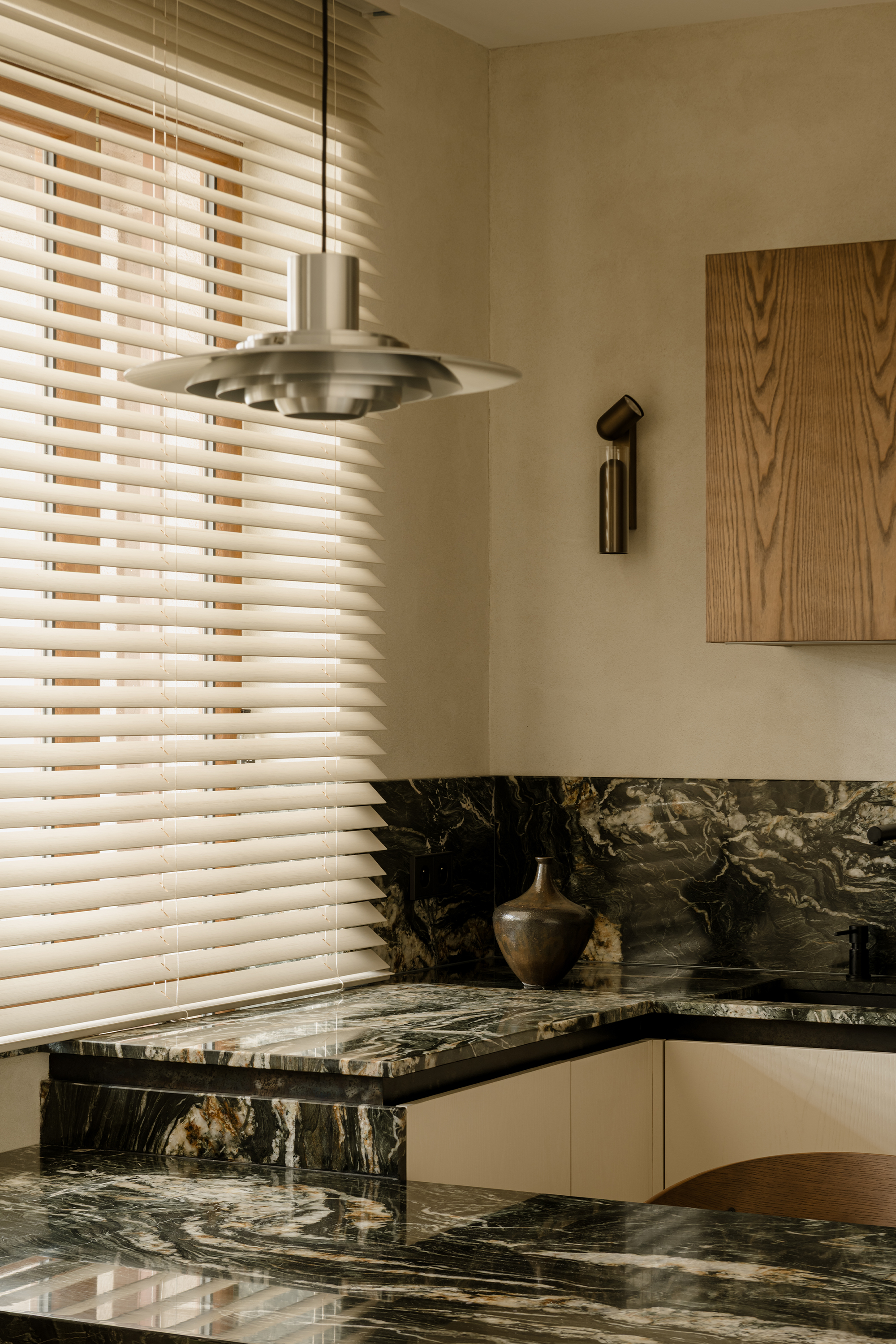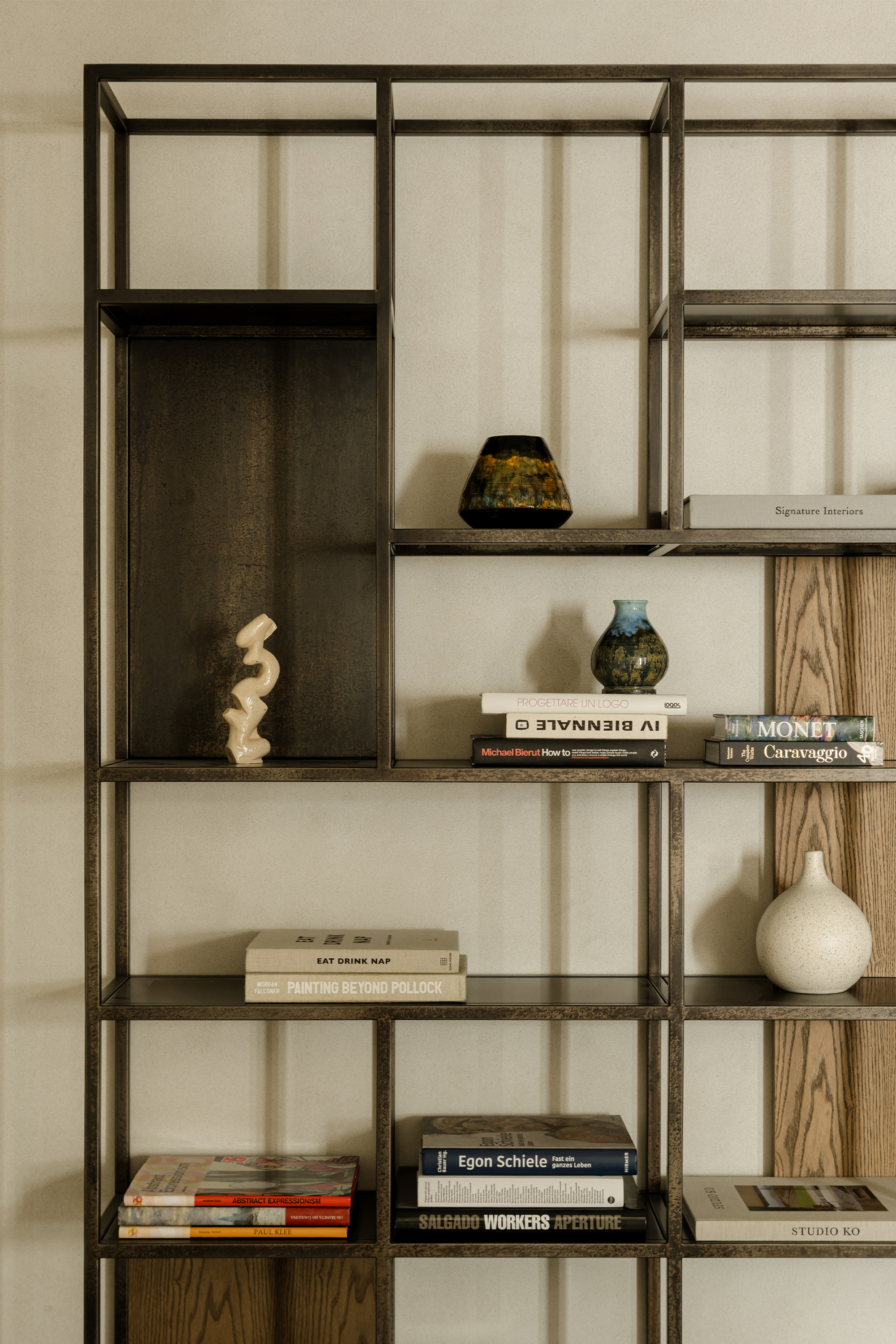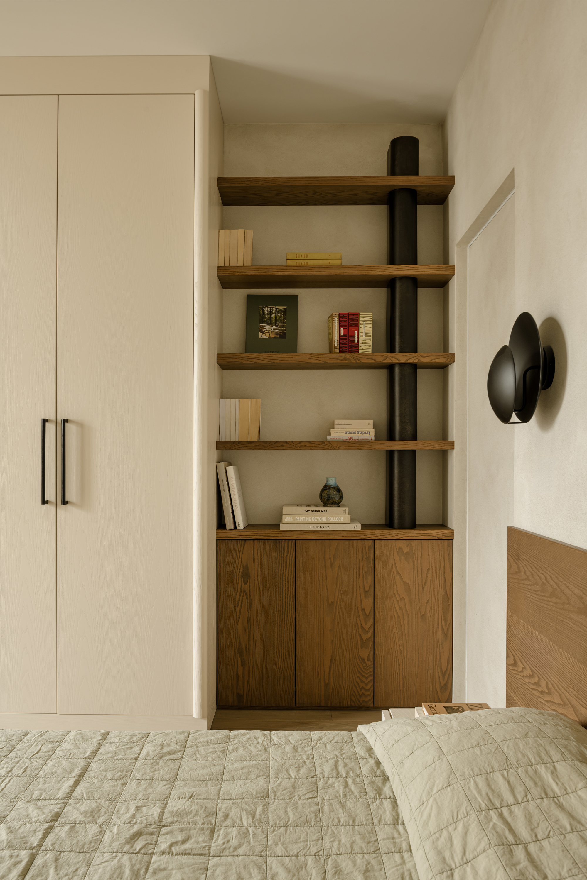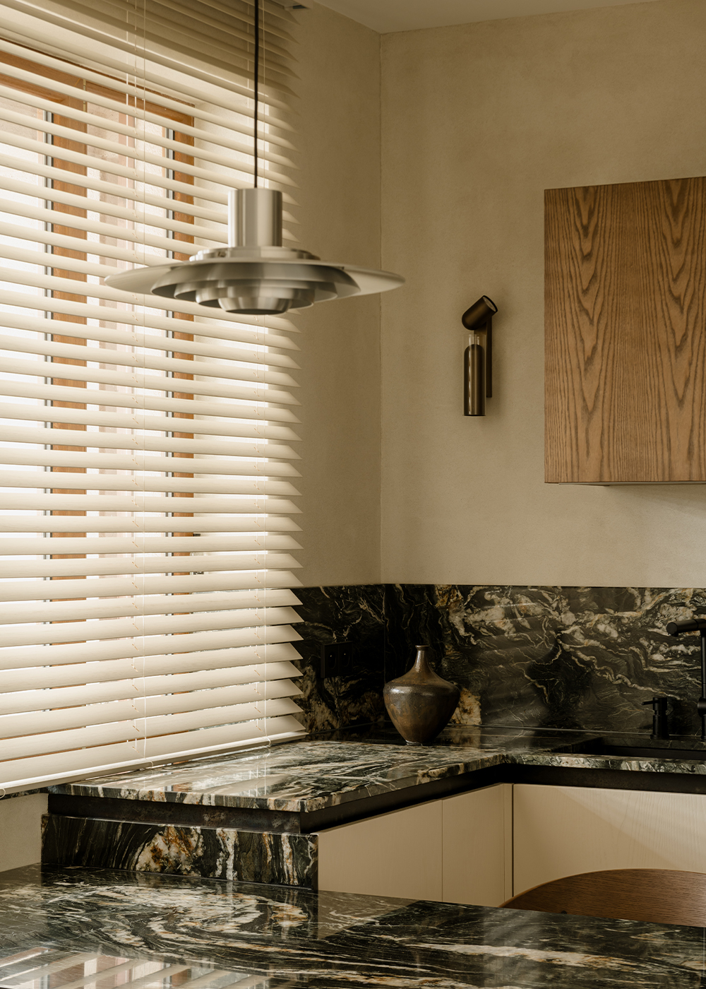 A Belvedere quartzite table, matching the kitchen countertops, acts as a central point of the day zone. Firek’s custom furniture is paired with selected Scandinavian pieces – a metal ceiling lamp by Jørgen Kastholm & Preben Juhl Fabricius (&Tradition) and New Works chairs. A rug from Tapis Atelier adds a distinctive black-and-white accent. Unique elements, such as a ceramic bedside lamp and a custom-shaped wall mirror, were made to order.