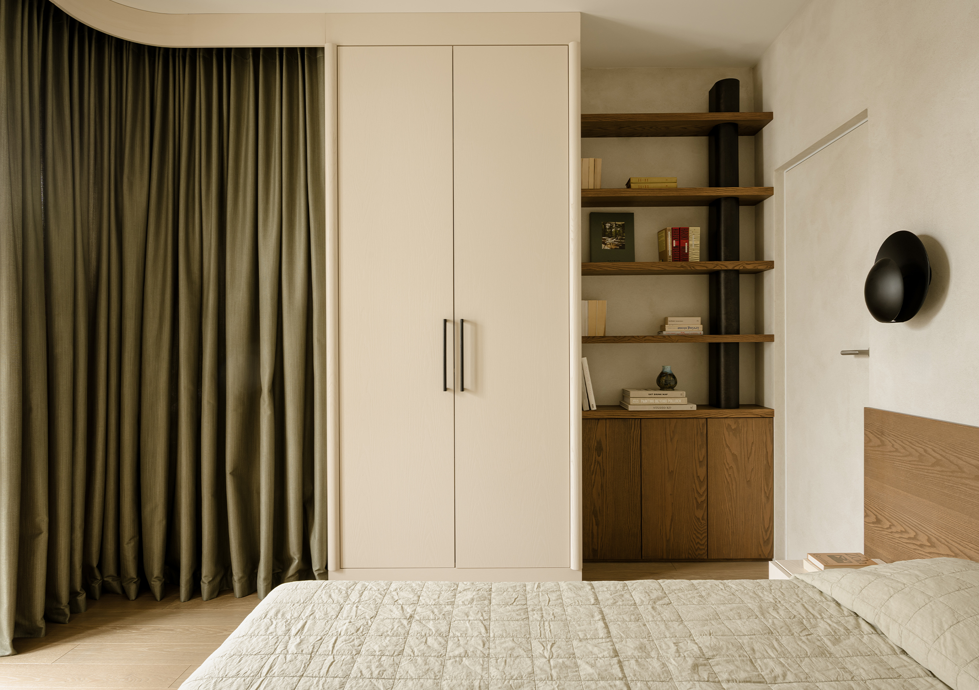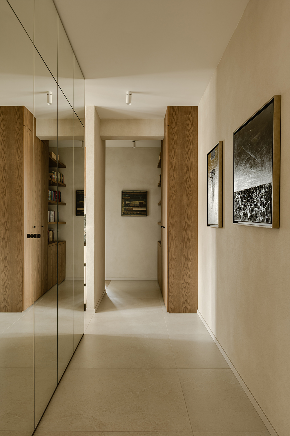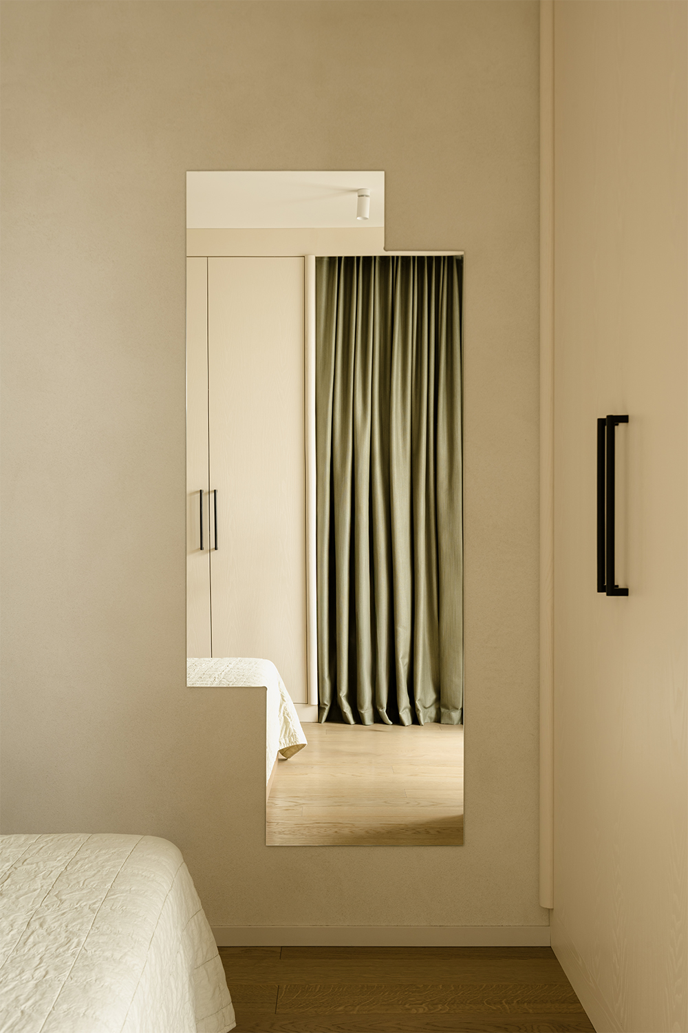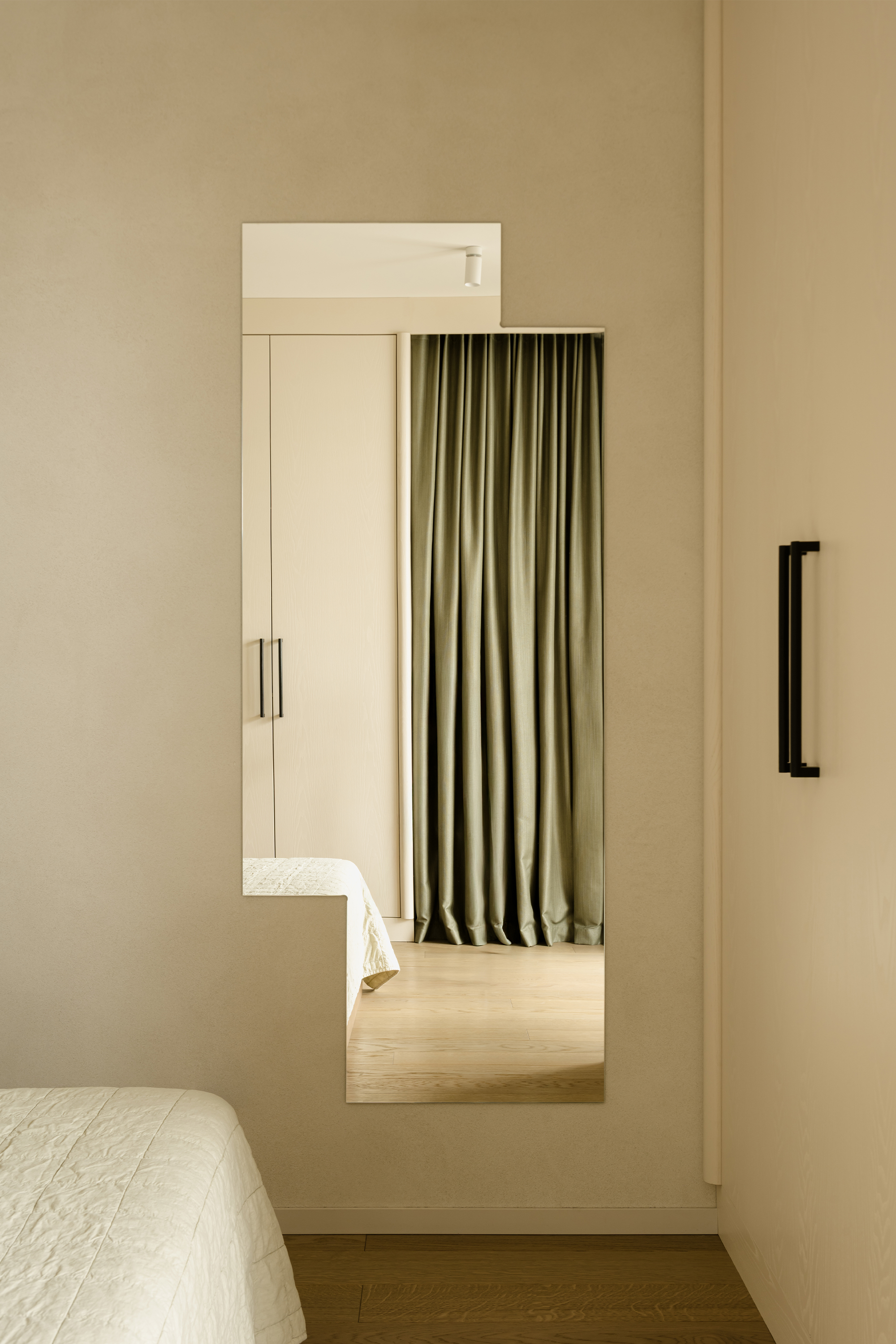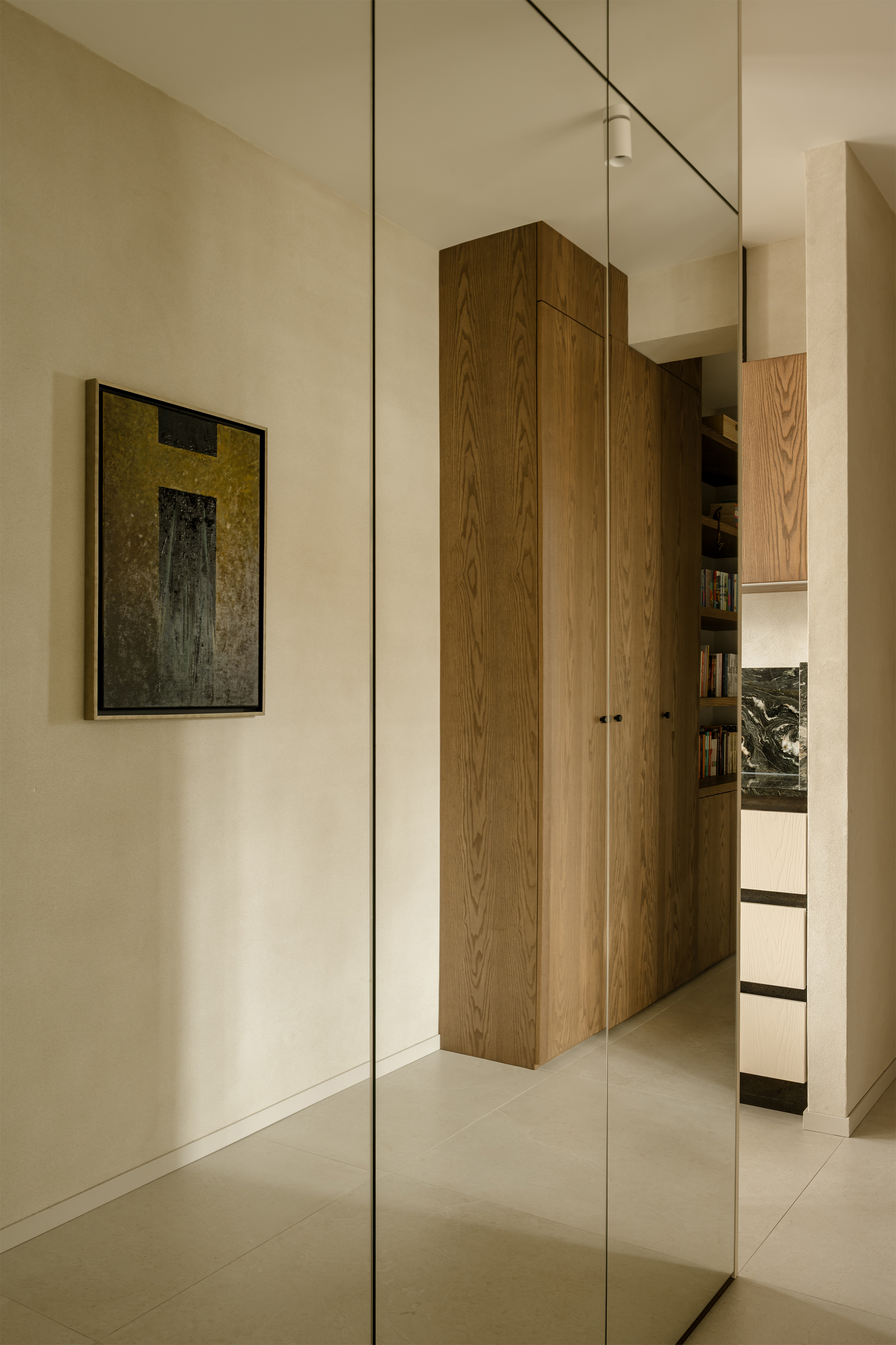 A long corridor linking the day and night zones features mirrored fronts that visually enlarge the space. In the bedroom, an olive arched curtain conceals a compact workspace for painting materials, accompanied by a wardrobe and a wooden shelf supported by a steel column.