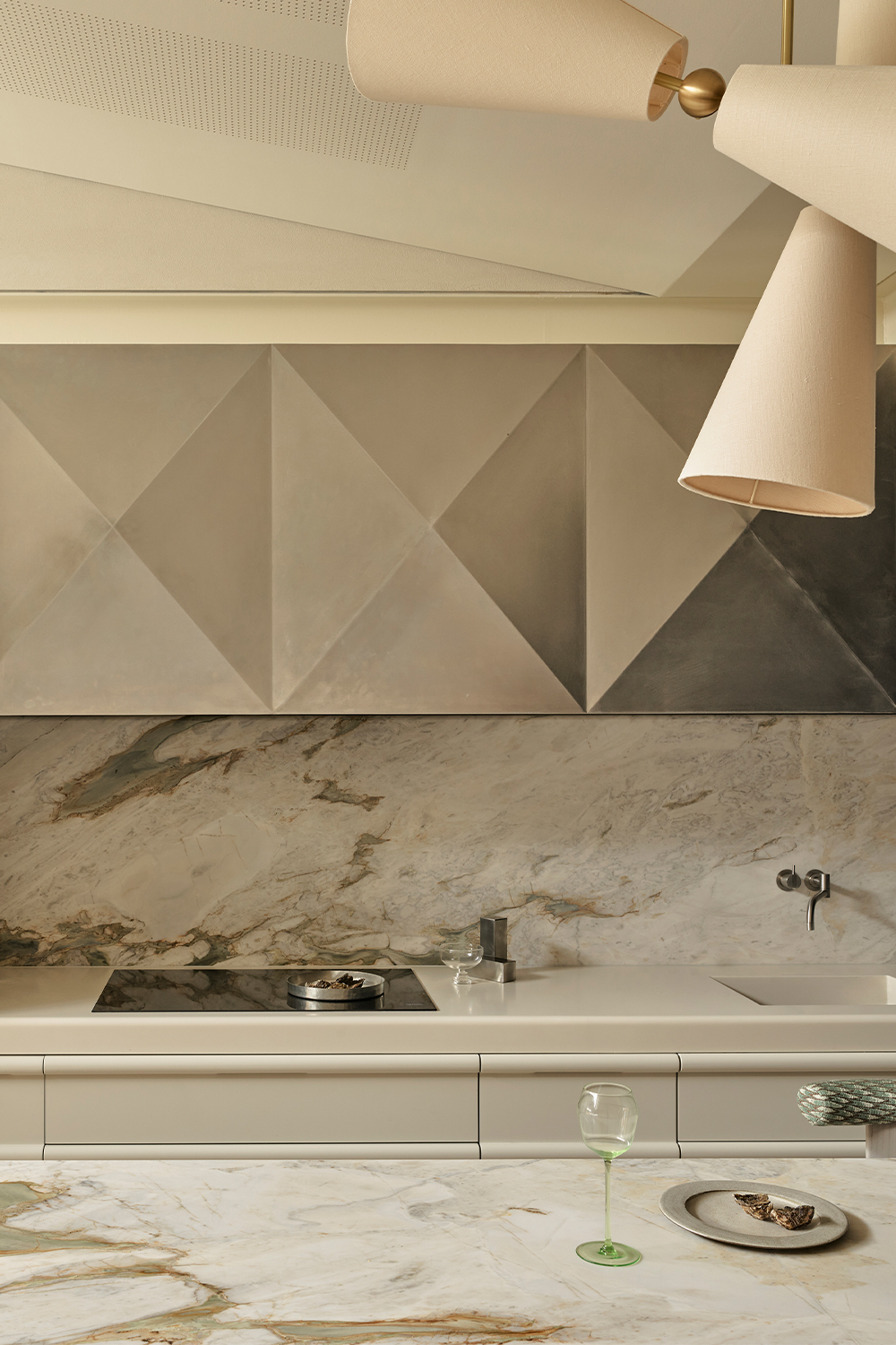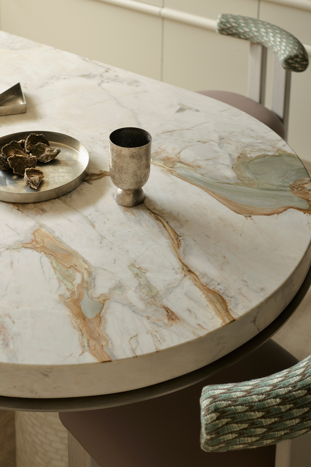 The layering of a diverse yet contained materials palette with a common textual expression of rustic yet refined was paramount. Tactility was amplified through the juxtaposition of naive materials; clay, grass weave, wool, limestone and oak, with the contradictory super futuristic finishes of sculpted, folded and forged metals expressed in equally soft organic form.