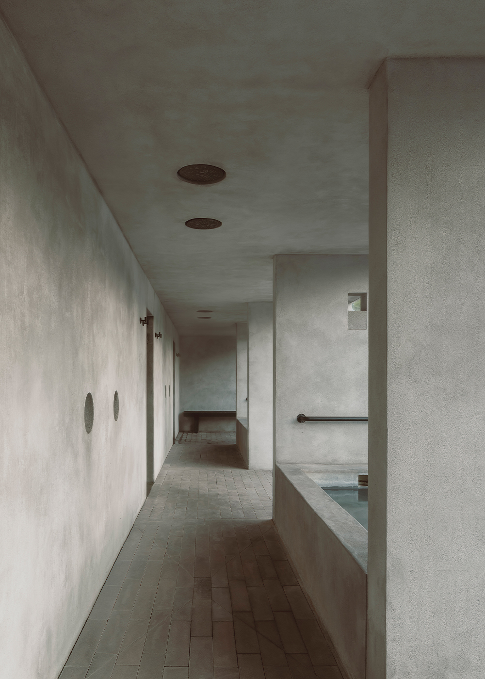 The northern zone gathers a series of steam rooms arranged linearly, like individual thermal cells, enclosed within thick walls that retain heat. Preceding these rooms, an open-air pavilion acts as a threshold and transition between outside and inside: it contains cold plunge pools and showers, where the abrupt change in temperature activates the body. This pavilion also establishes an entry rhythm that brings order and pause to the experience.