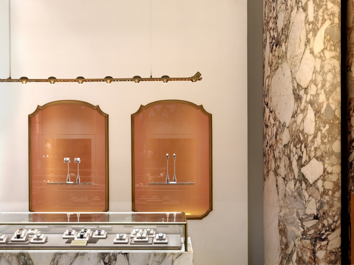 The same goes for other design elements throughout. For instance, since Bulgari is quintessentially Italian, Marino again looked to the country’s modernist architecture and furnishings for inspiration. For furniture and lighting, he dove into the postwar period, examining work by Gio Ponti, Piero Portaluppi, and Carlo Scarpa. In fact, several of the era’s signature pieces are here. A ’50’s Osvaldo Borsani table in pink marble and mahogany, for example, functions as a display surface in the main jewelry salon, where the central vitrines are anchored by massive bronze bases. A pair of Ponti’s exuberant chandeliers, also bronze, hang from the shallow vault around the salon’s 18-foot ceiling.
