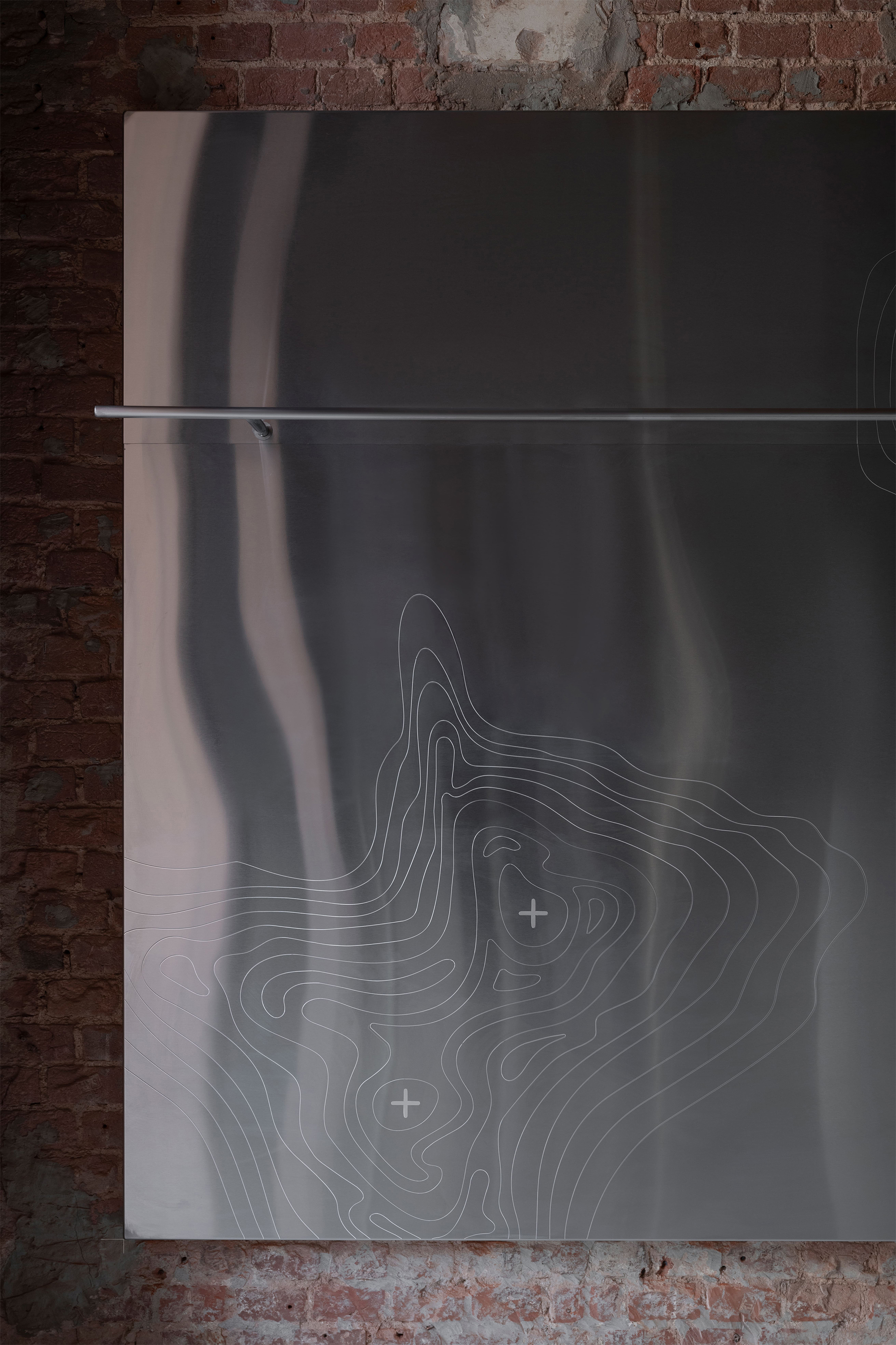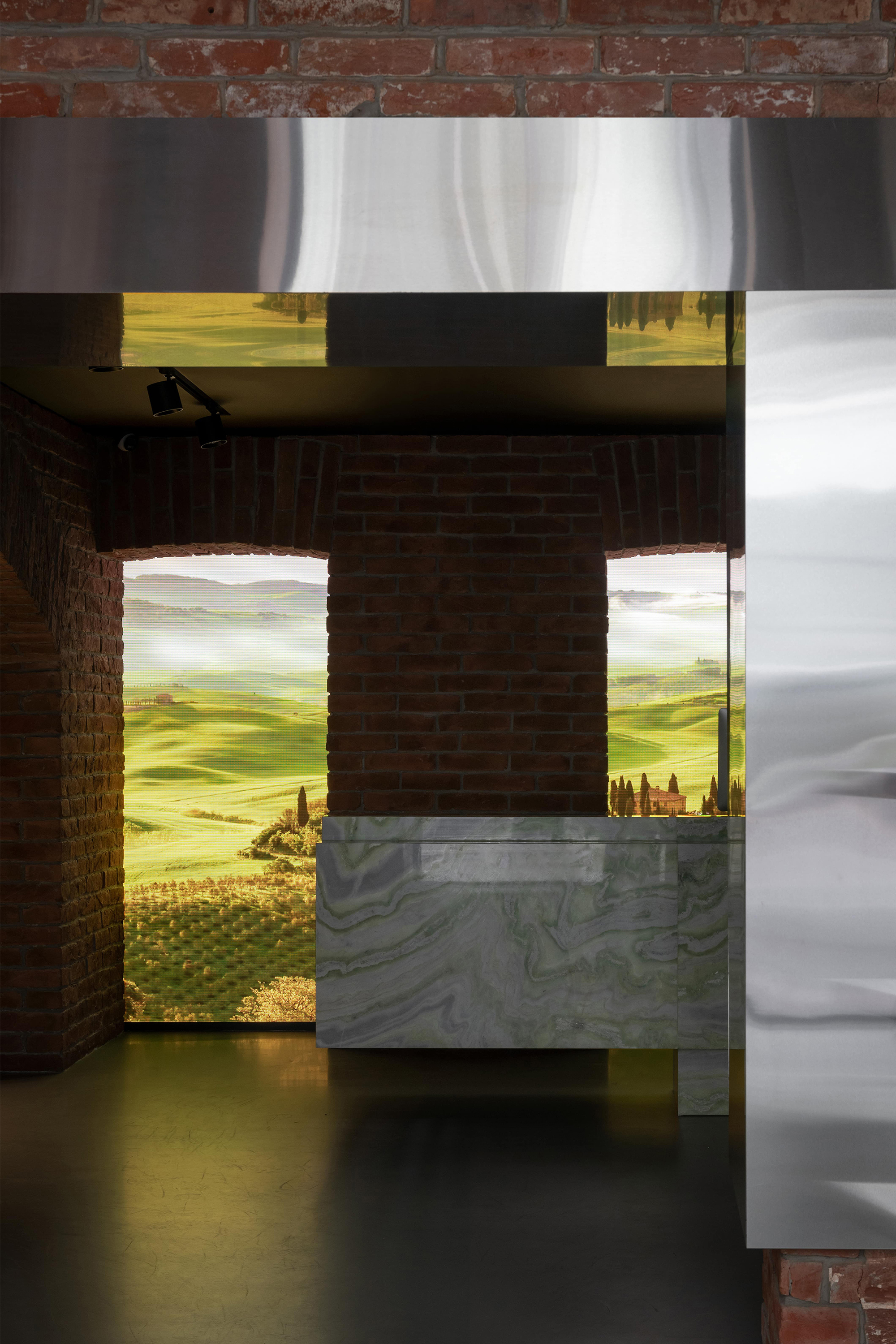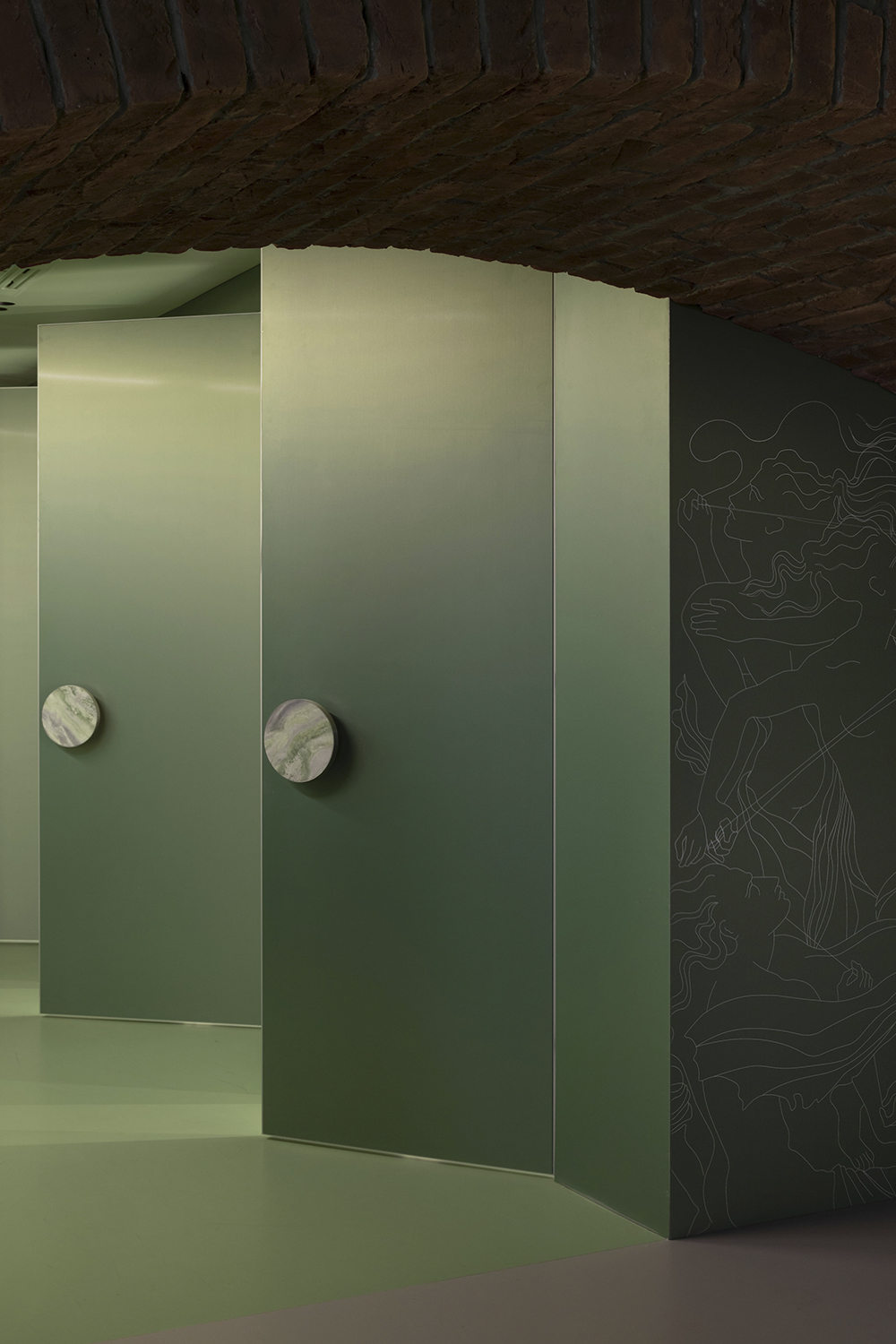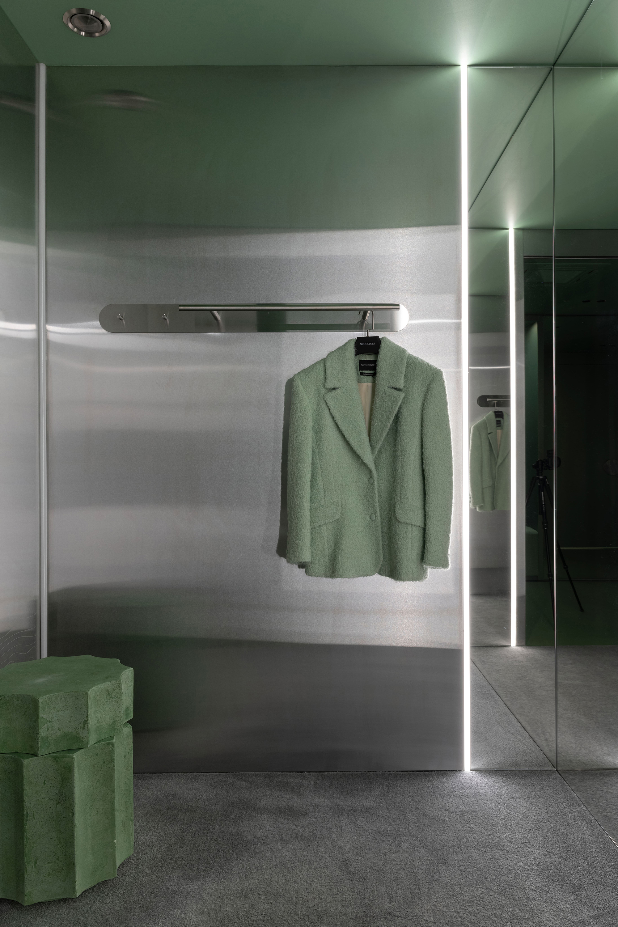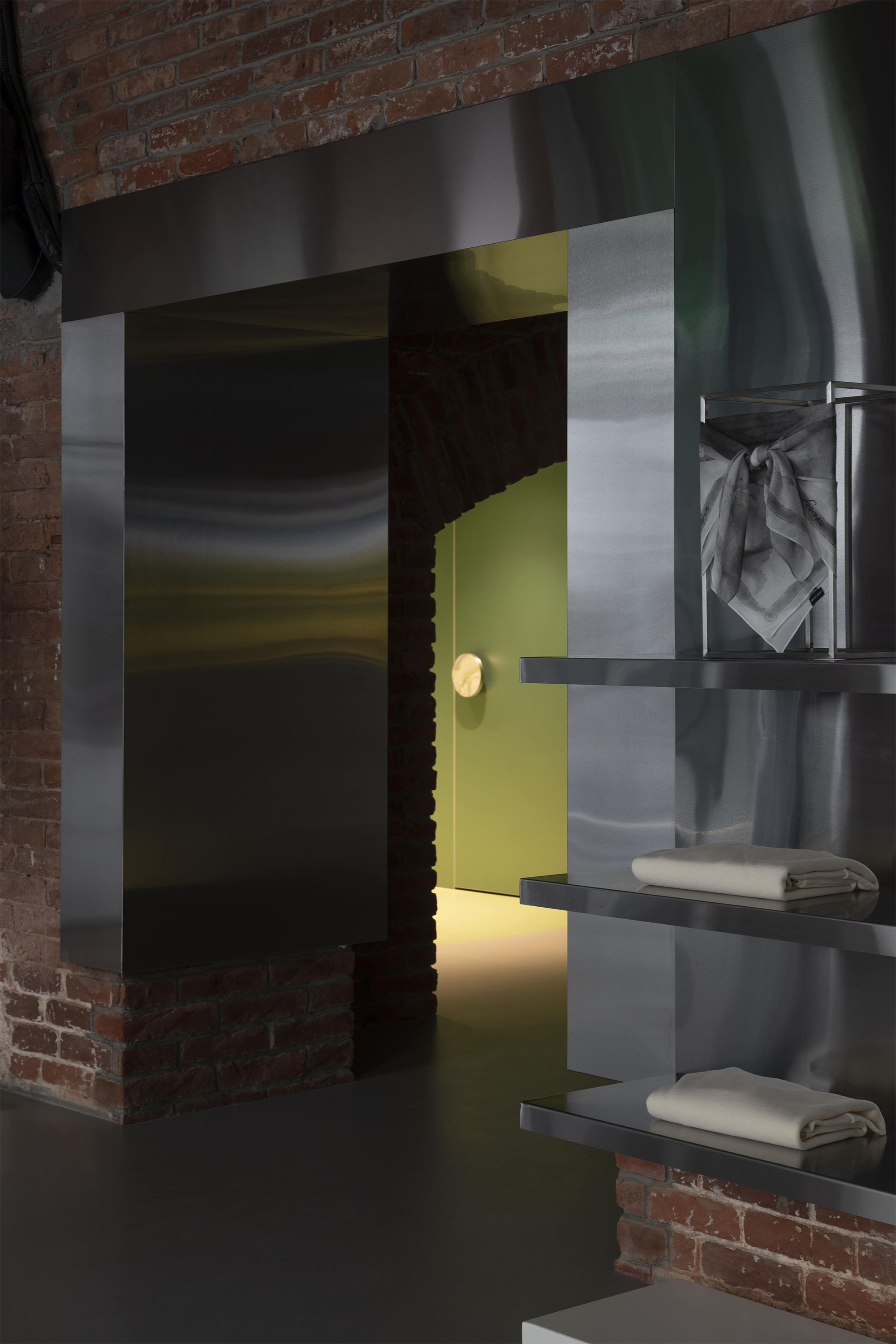 Stainless steel. As opposed to textured bricks, we went for clean technological and modern materials that add a contemporary and futuristic feel. Stainless steel with its reflective brushed surface and sophisticated bright green colour (repeated in natural onyx) - locally form separate functional areas.