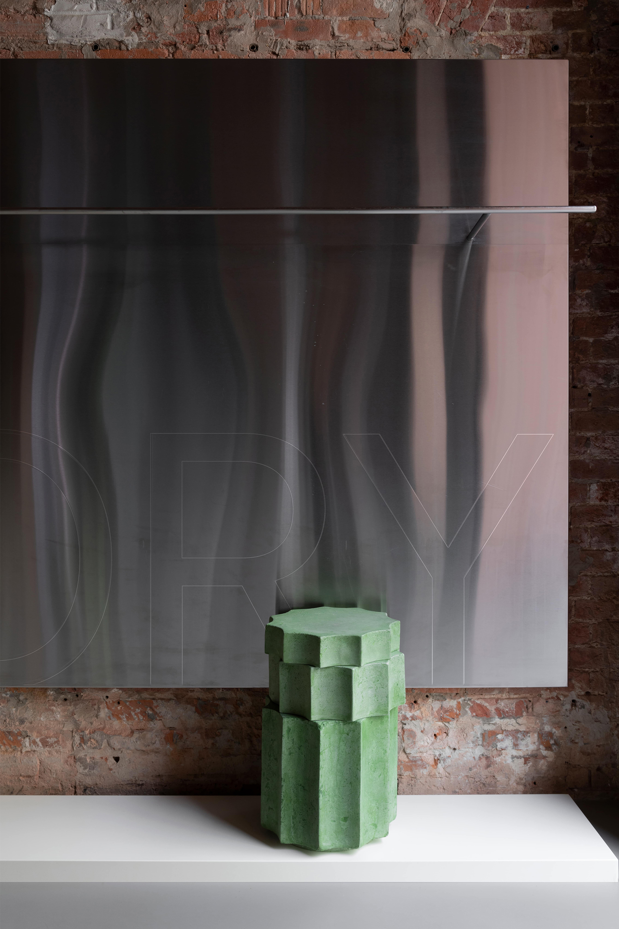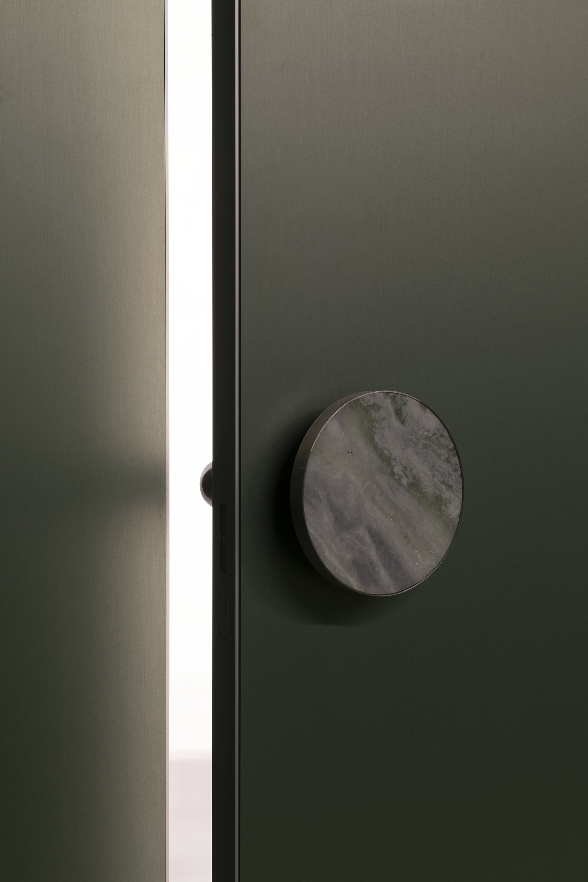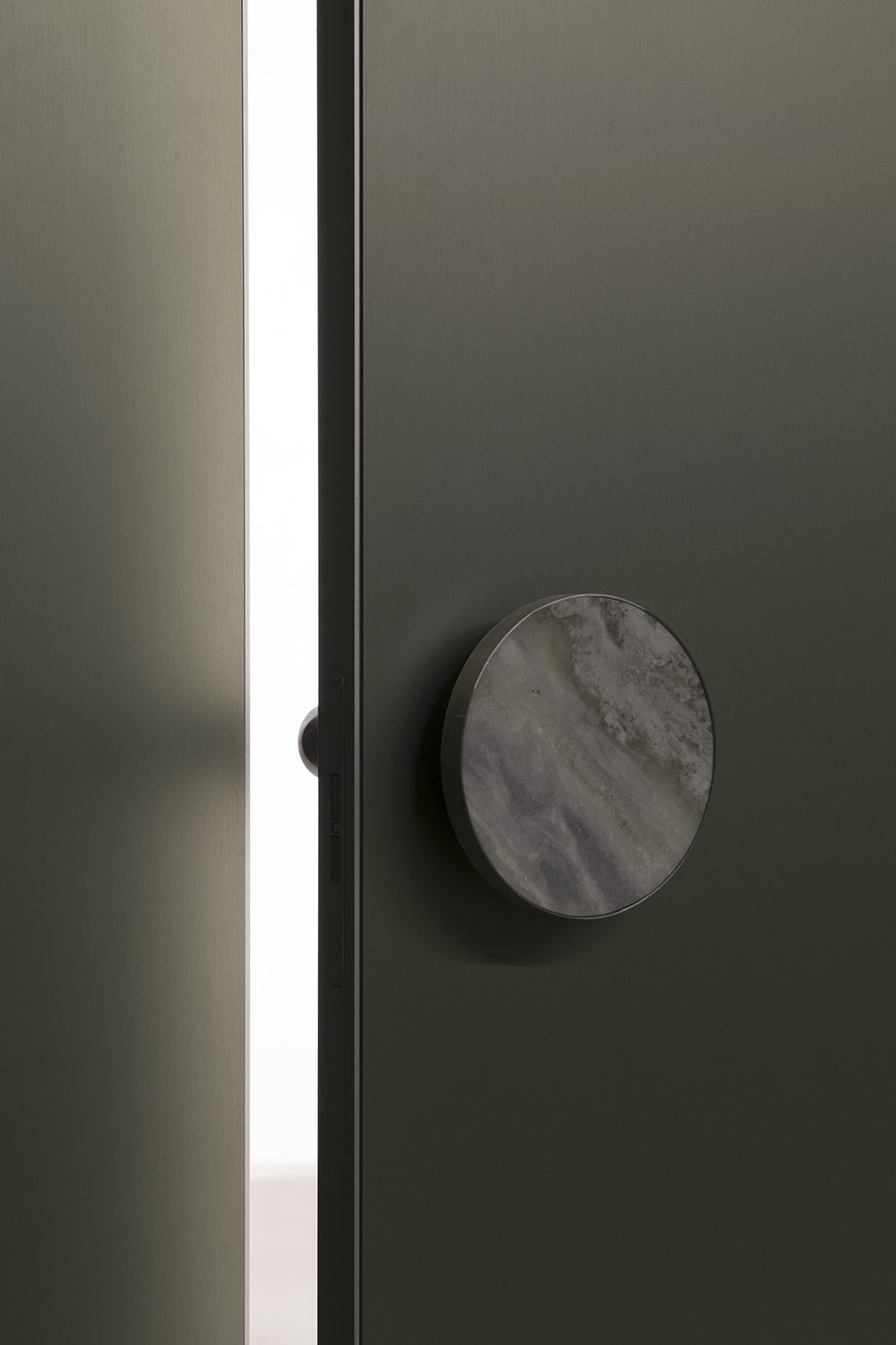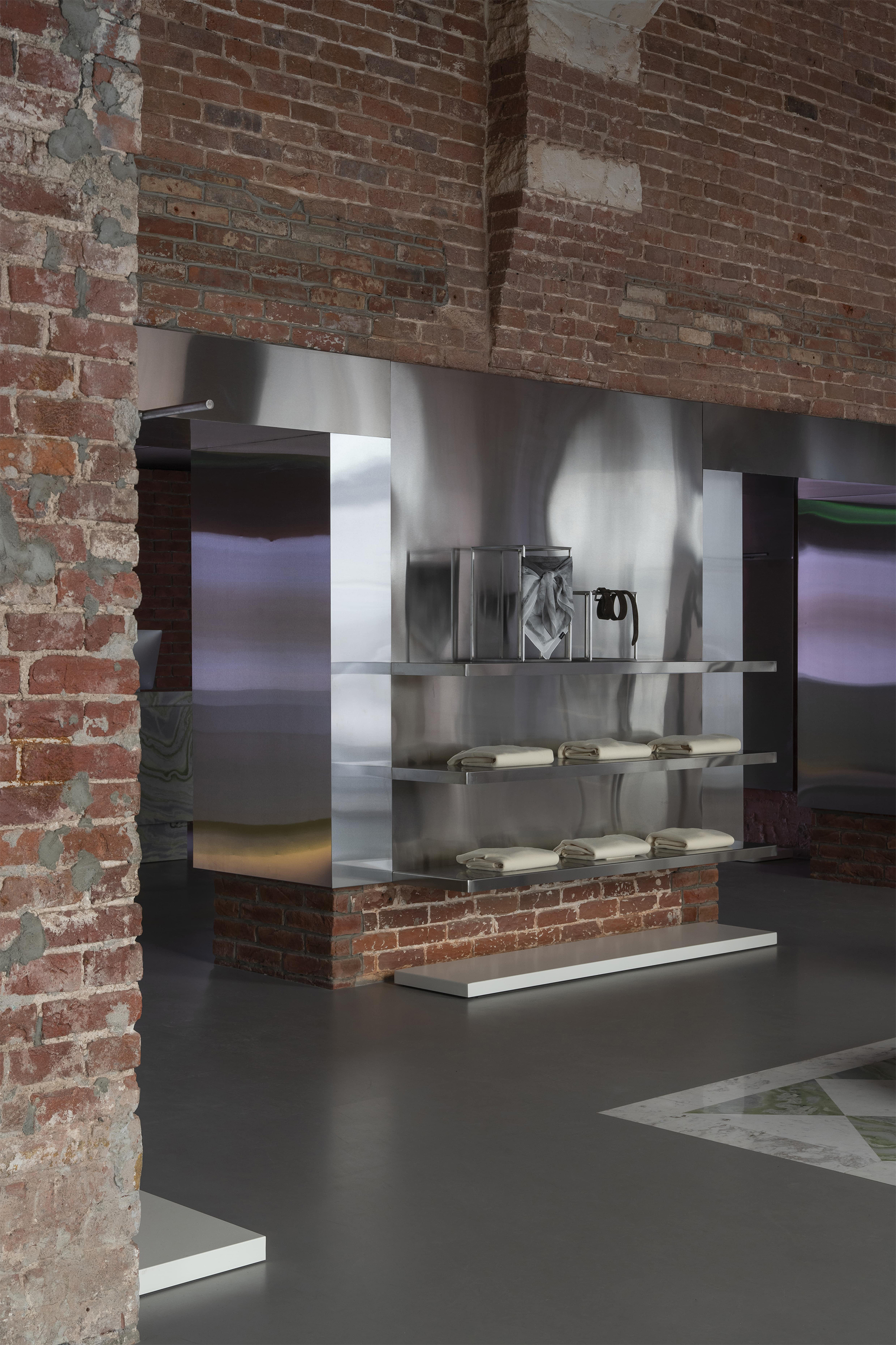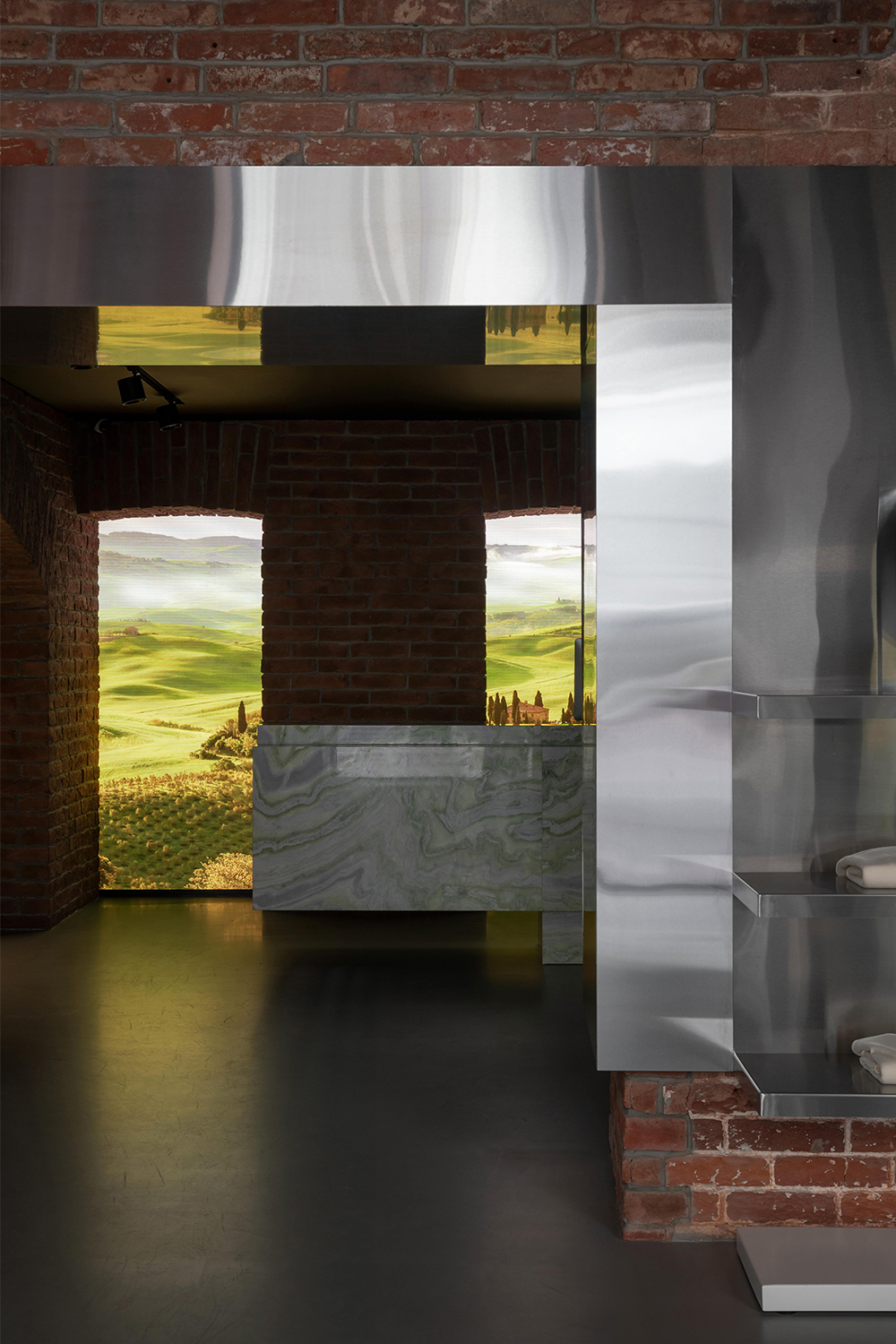 Stainless steel. As opposed to textured bricks, we went for clean technological and modern materials that add a contemporary and futuristic feel. Stainless steel with its reflective brushed surface and sophisticated bright green colour (repeated in natural onyx) - locally form separate functional areas.