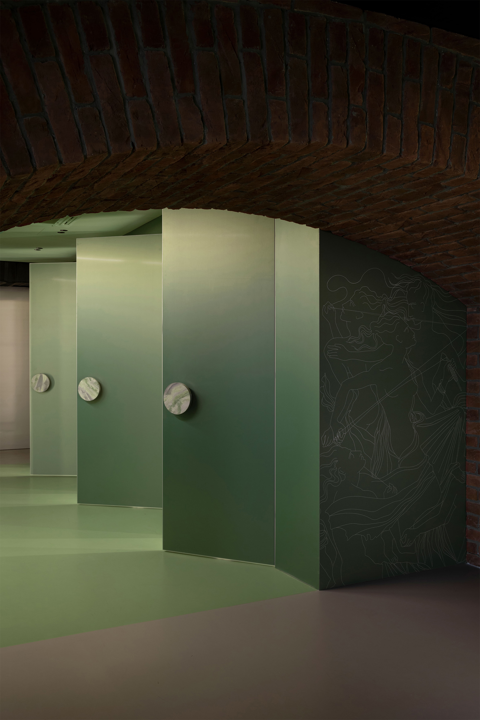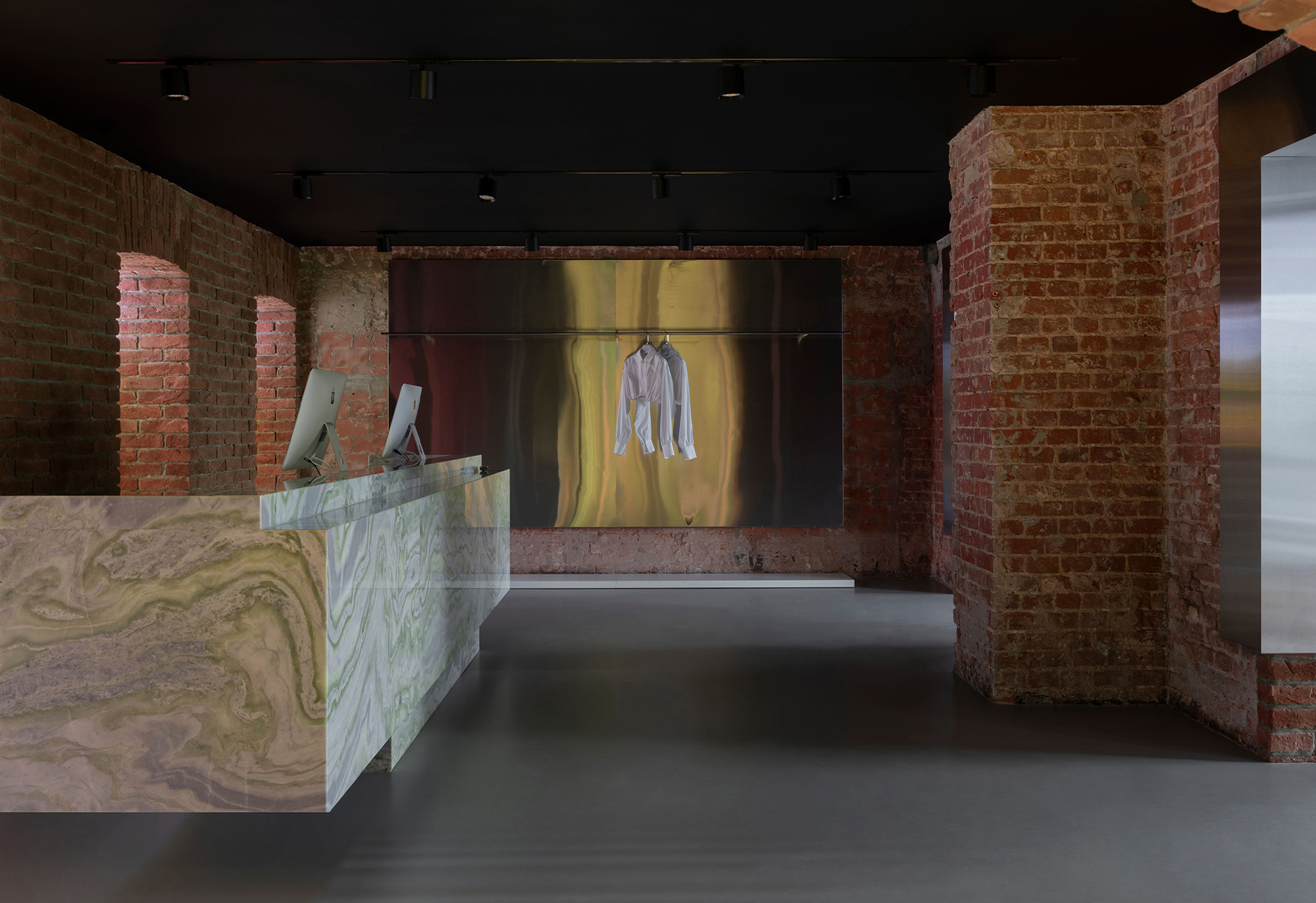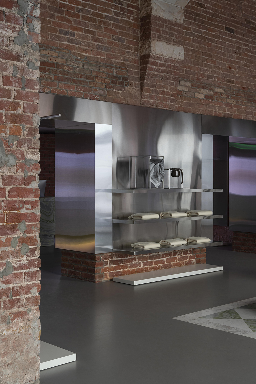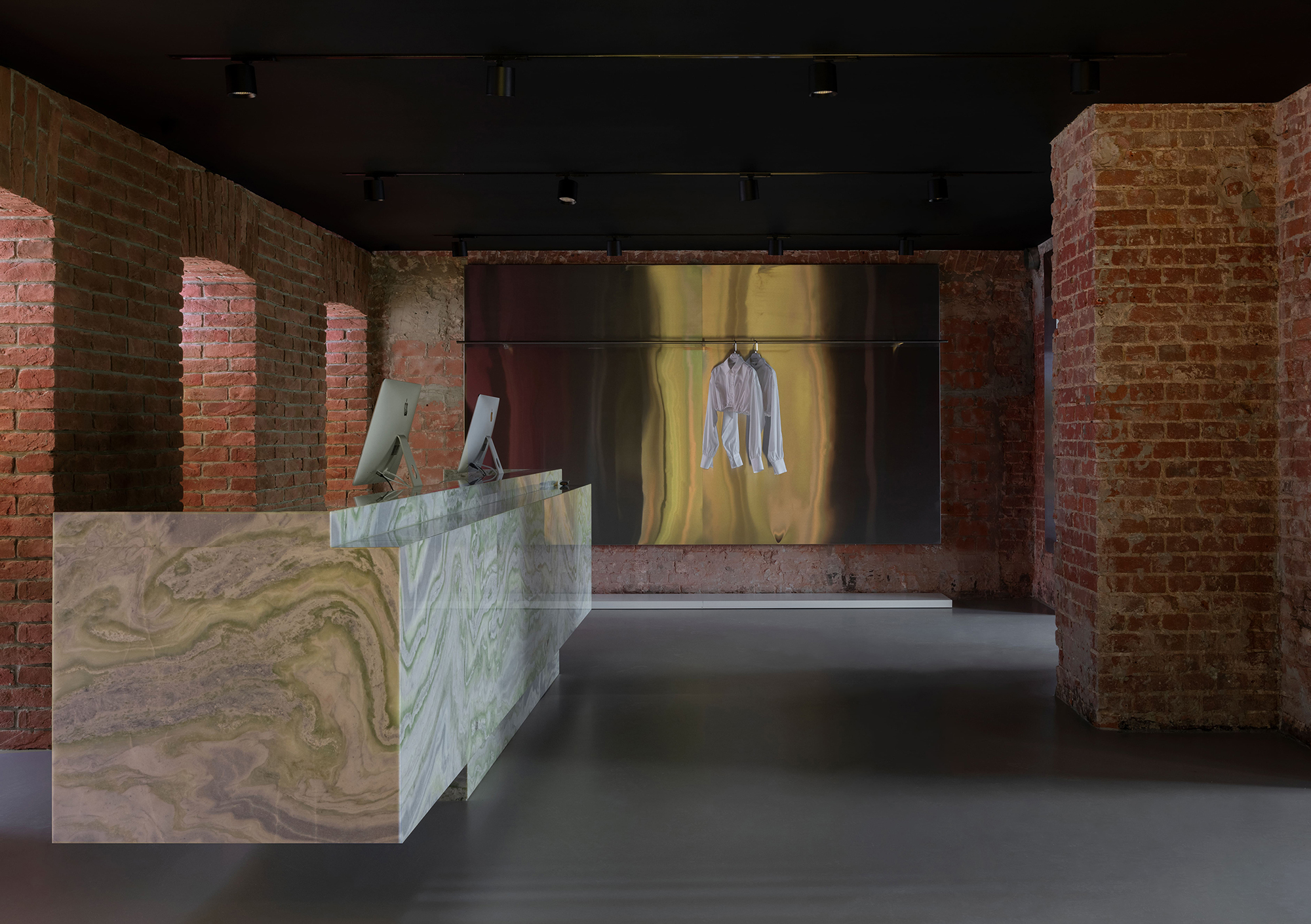 Brick. The main material of the project forming the architecture of the space and a reference to the historical heritage. We tried to tidy it up as much as possible without compromising the integrity of the vaults and walls. An honest approach to the material, the brick is over 120 years old, it is important to show its ‘history’, its cracks and time imprints. We tried to preserve the historic masonry as much as possible. We added double-sided tyre tracks: one part shines into the ceiling to illuminate the brick vaults and the texture of the brick. The other part on the retail equipment.