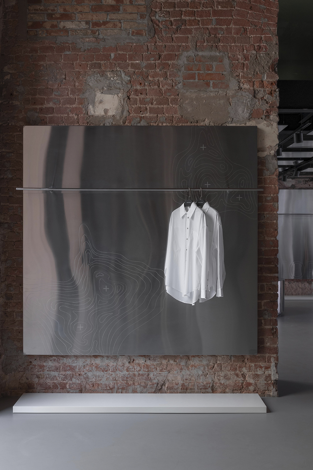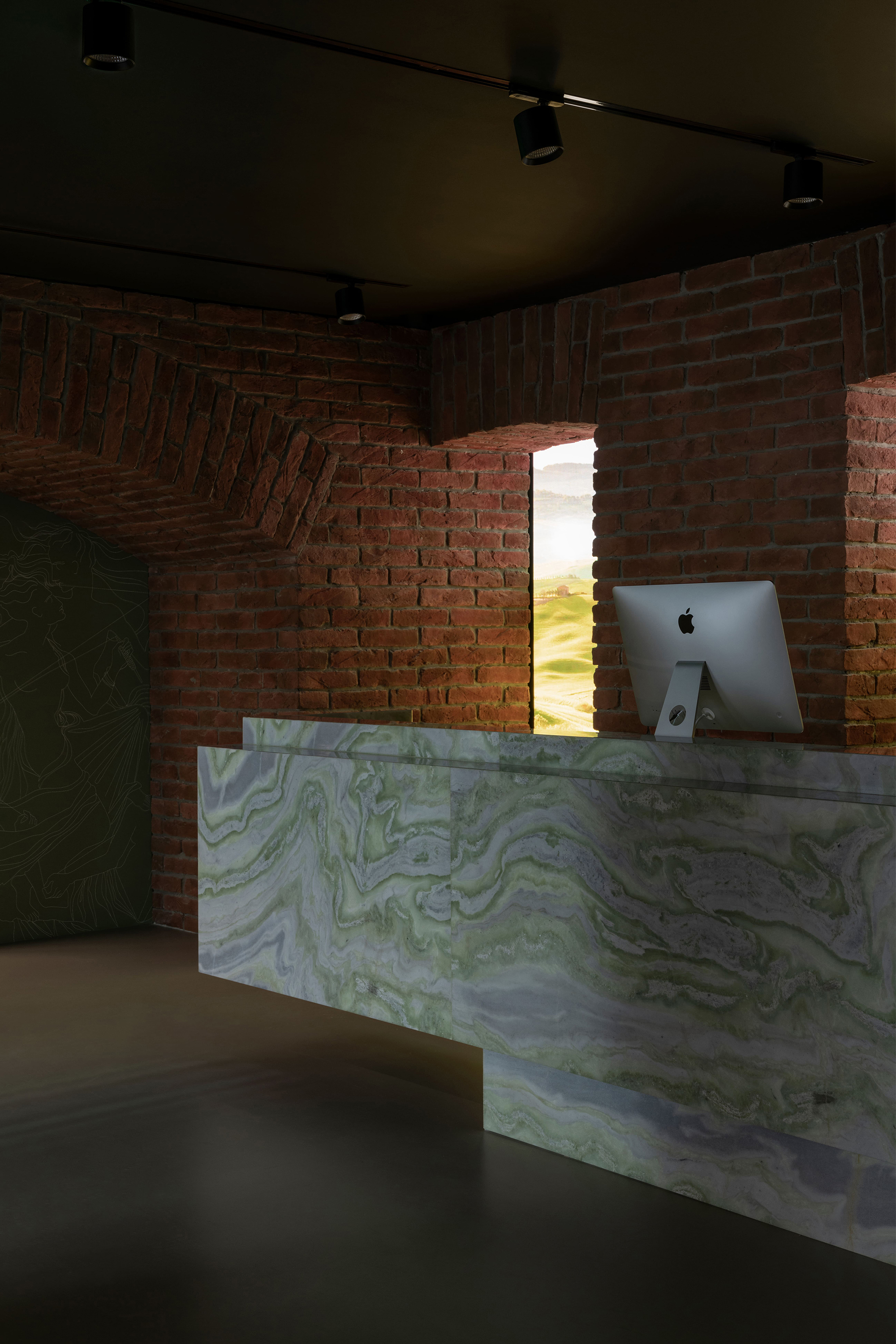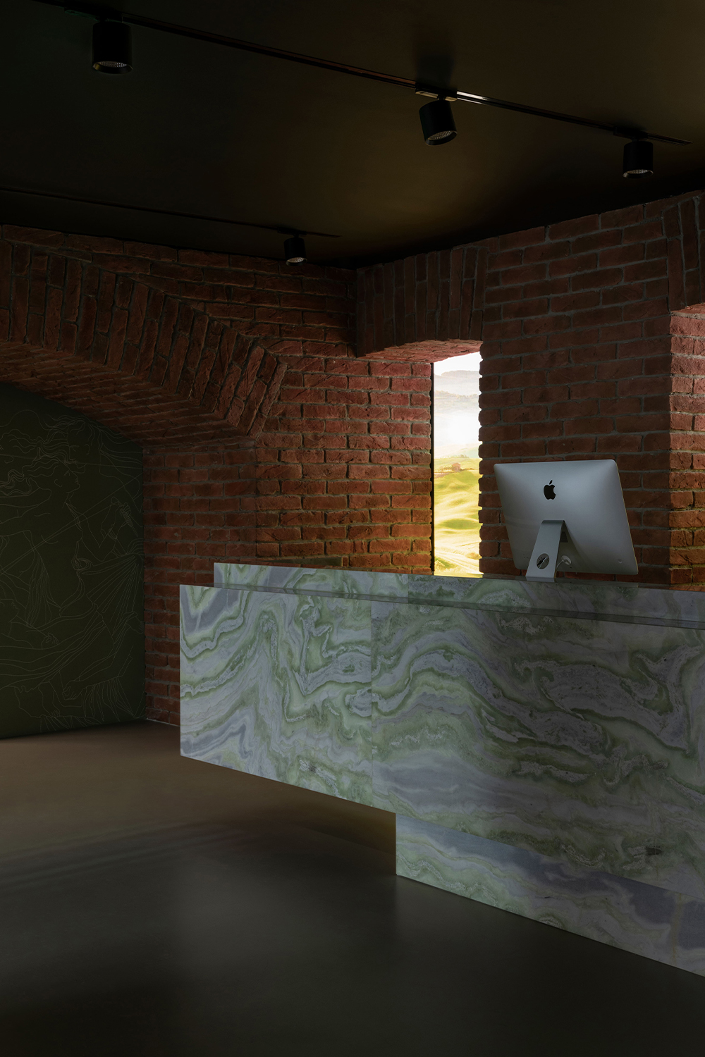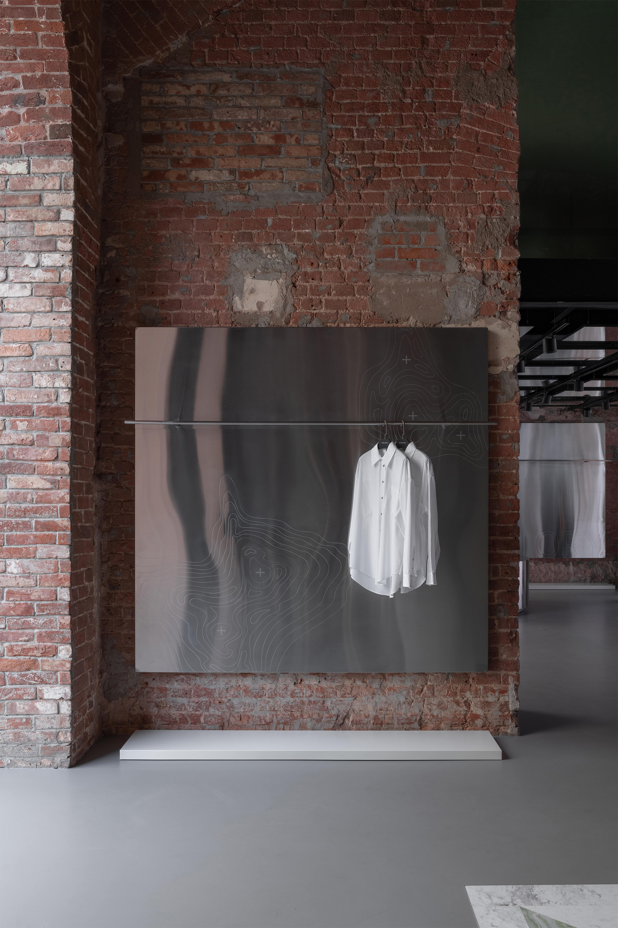 Brick. The main material of the project forming the architecture of the space and a reference to the historical heritage. We tried to tidy it up as much as possible without compromising the integrity of the vaults and walls. An honest approach to the material, the brick is over 120 years old, it is important to show its ‘history’, its cracks and time imprints. We tried to preserve the historic masonry as much as possible. We added double-sided tyre tracks: one part shines into the ceiling to illuminate the brick vaults and the texture of the brick. The other part on the retail equipment.