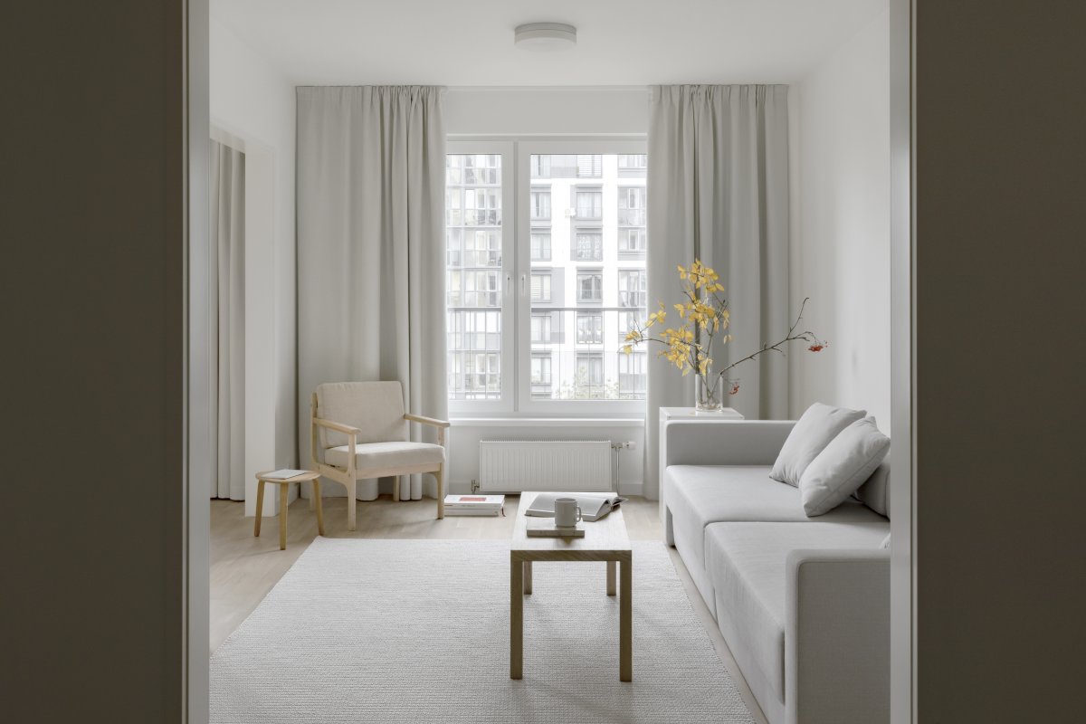 The building is located in a new suburb on the outskirts of Minsk, and unlike the new building, the interior of the apartment is restricted by the existing building structure. In addition to the open kitchen and expanded bathroom, Radical Passive also focused on updating the space by introducing new colours, materials and furniture.