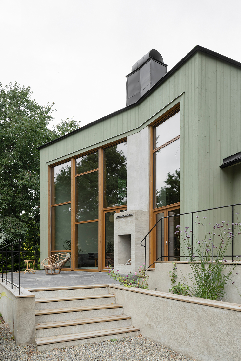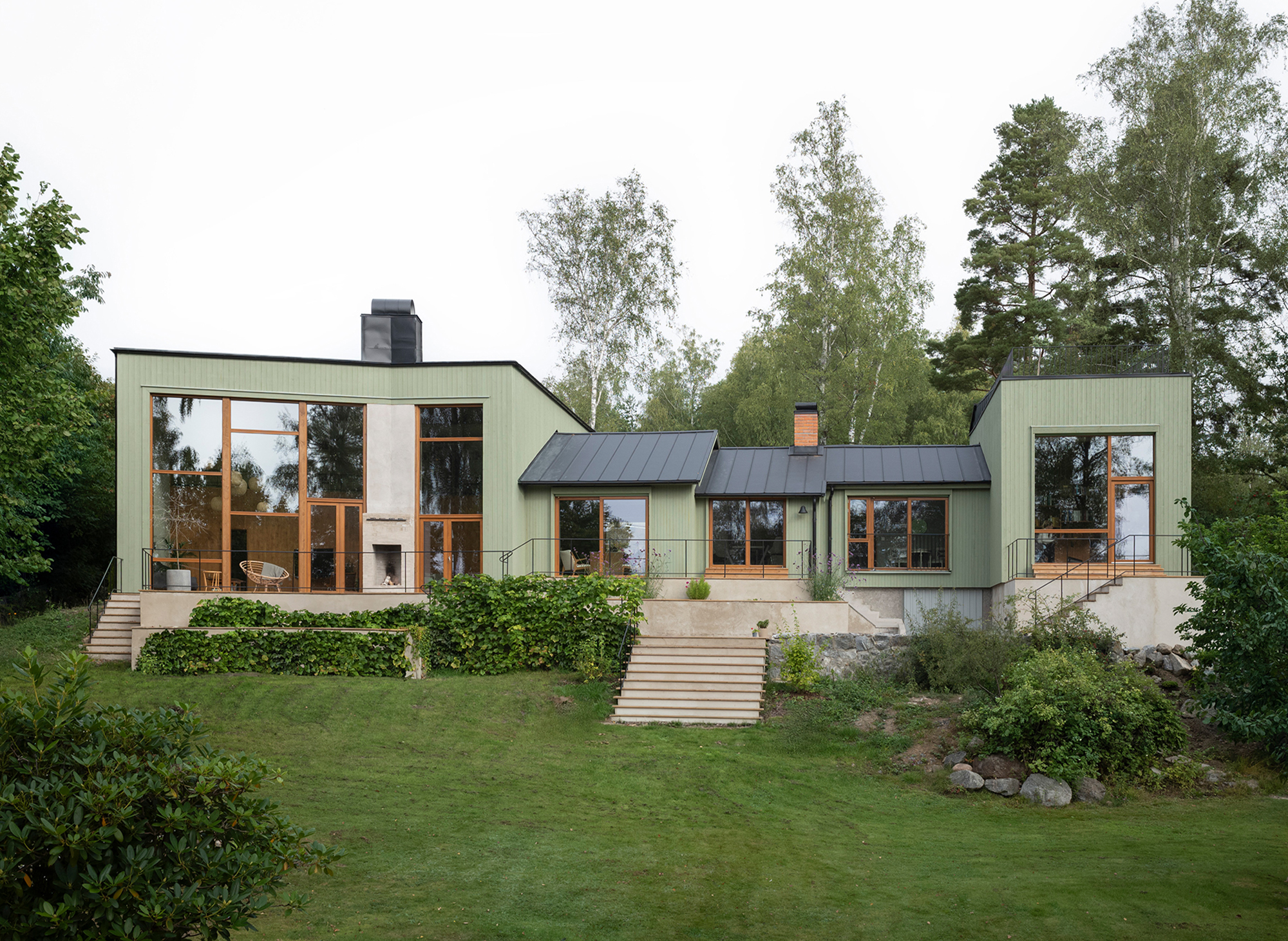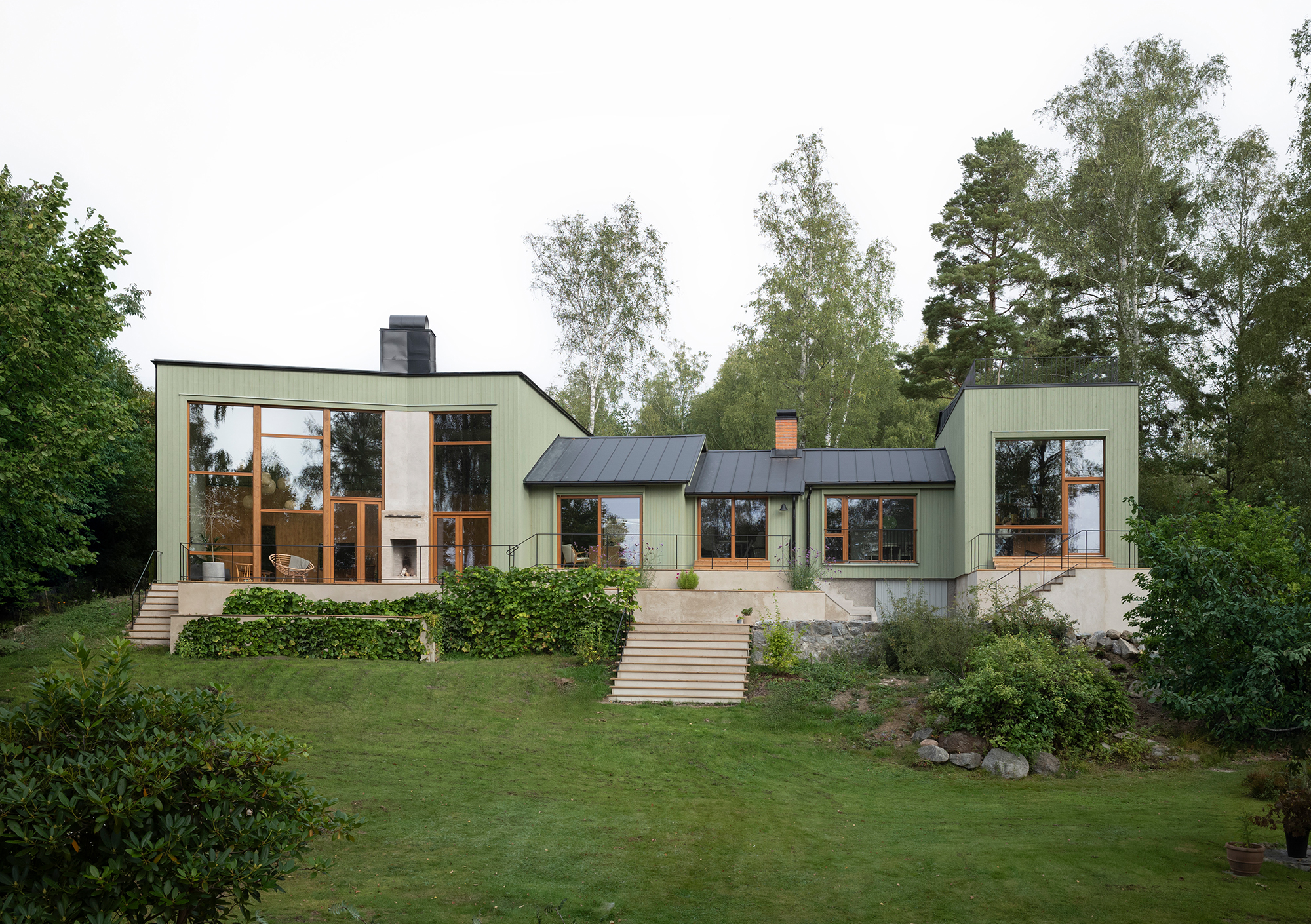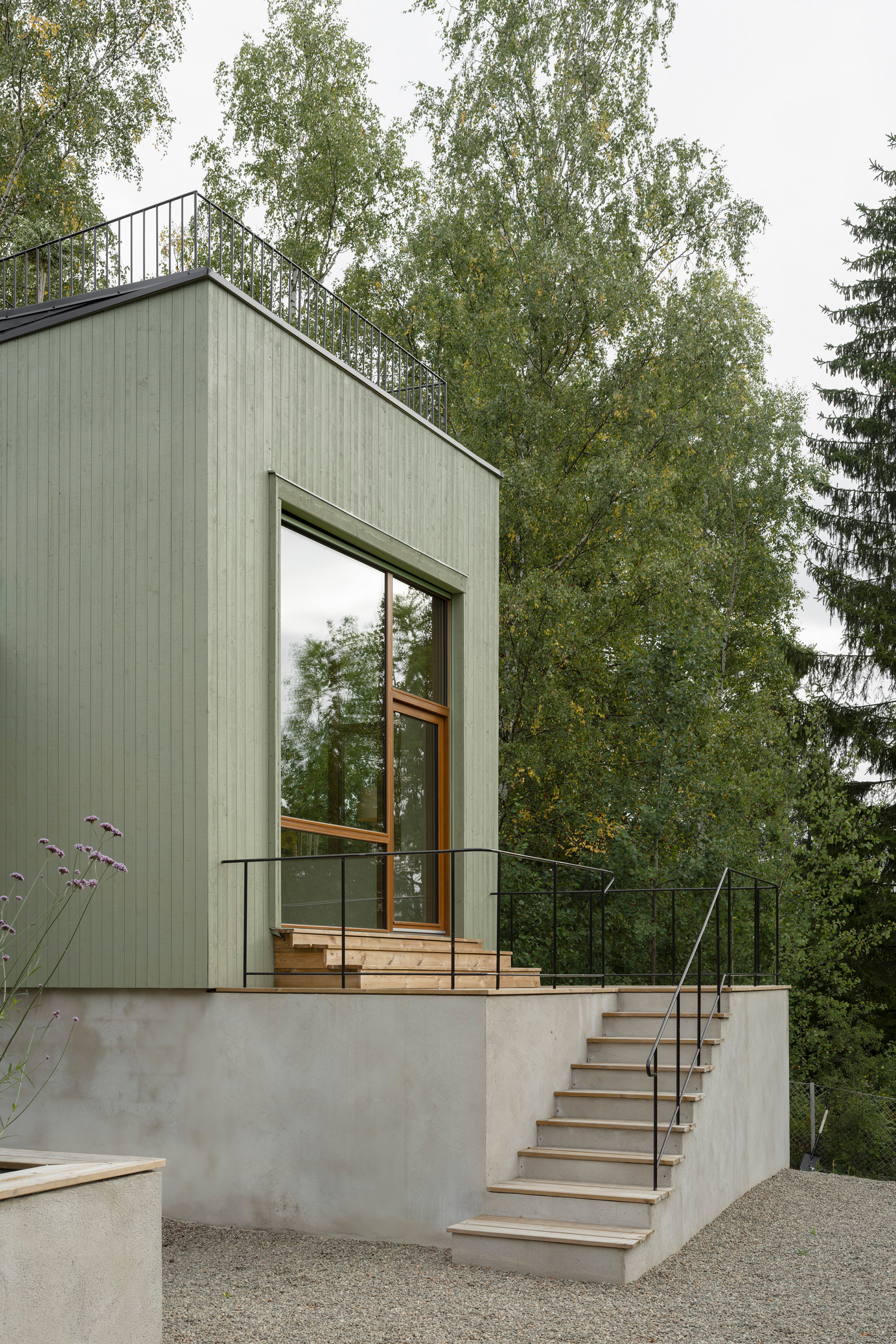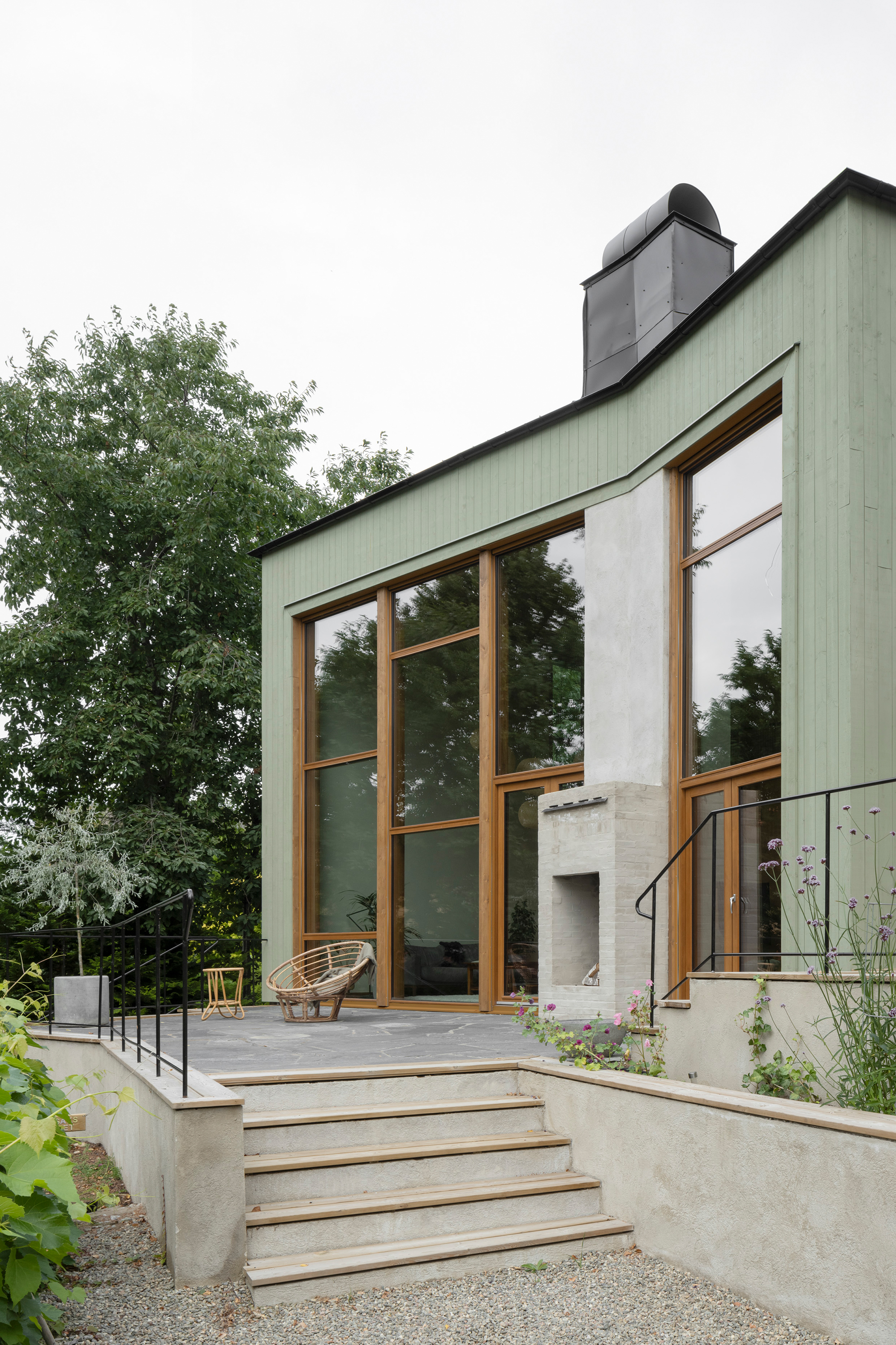 Externally, the building's five volumes are all clad in green-painted spruce panelling. The panel width varies between the volumes, with narrower panels on the smaller volumes and wider panels on the larger ones. The choice of this green, mild treatment aims to unify the five volumes into a more cohesive whole. A series of terraces has been arranged in front of the house to bridge the height differences between the house and the garden and at the same time create outdoor areas that connect more directly to the interior. A chimney with both an indoor and outdoor fireplace is integrated into the facade glazing of the living room, further enhancing and activating the relationship between the house and the garden.