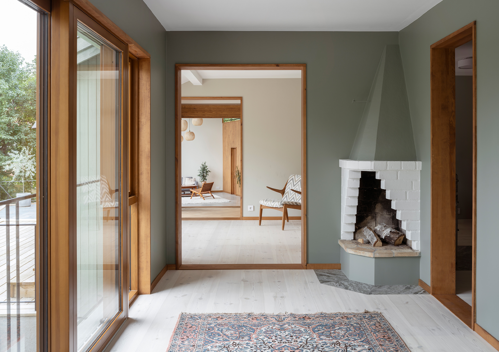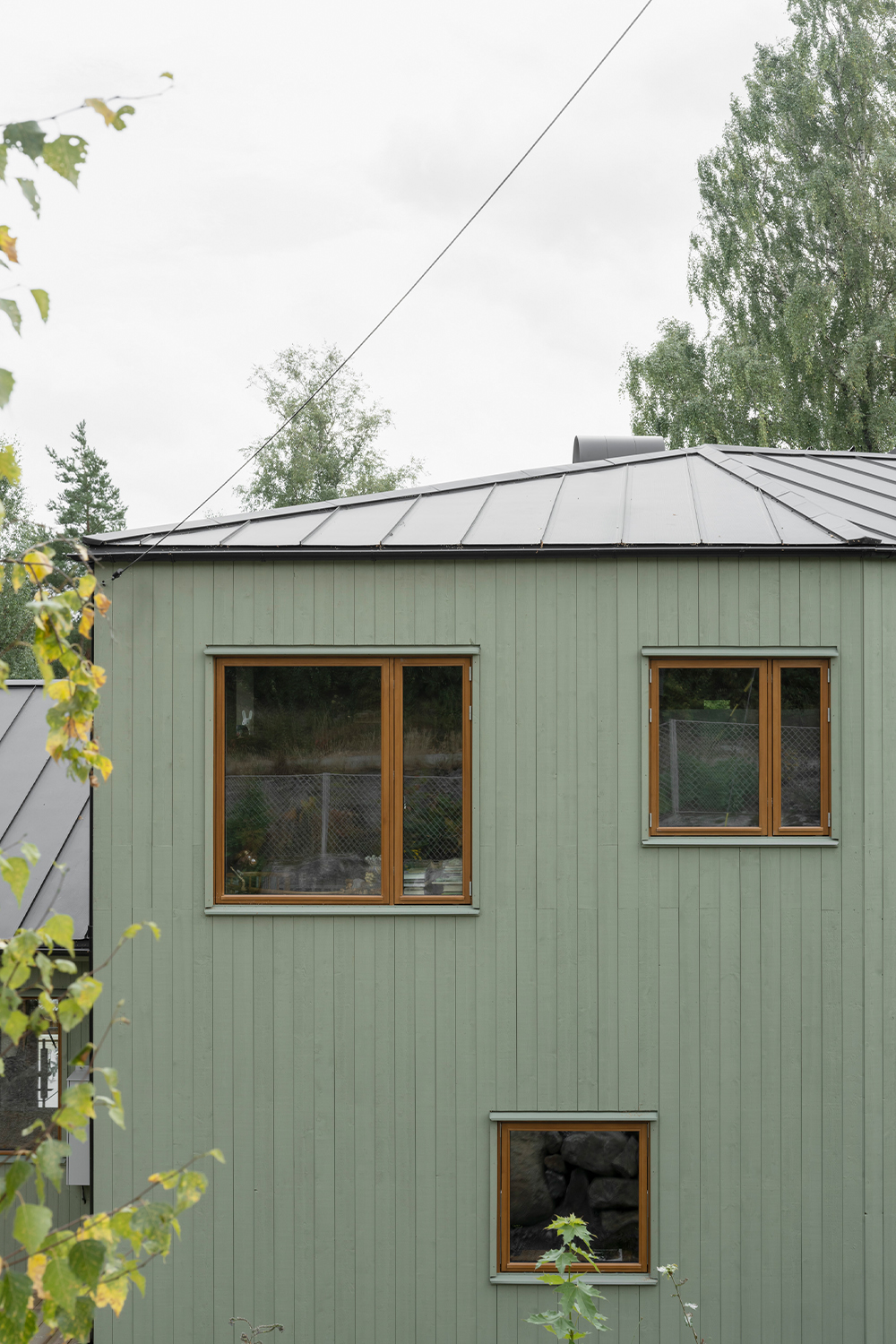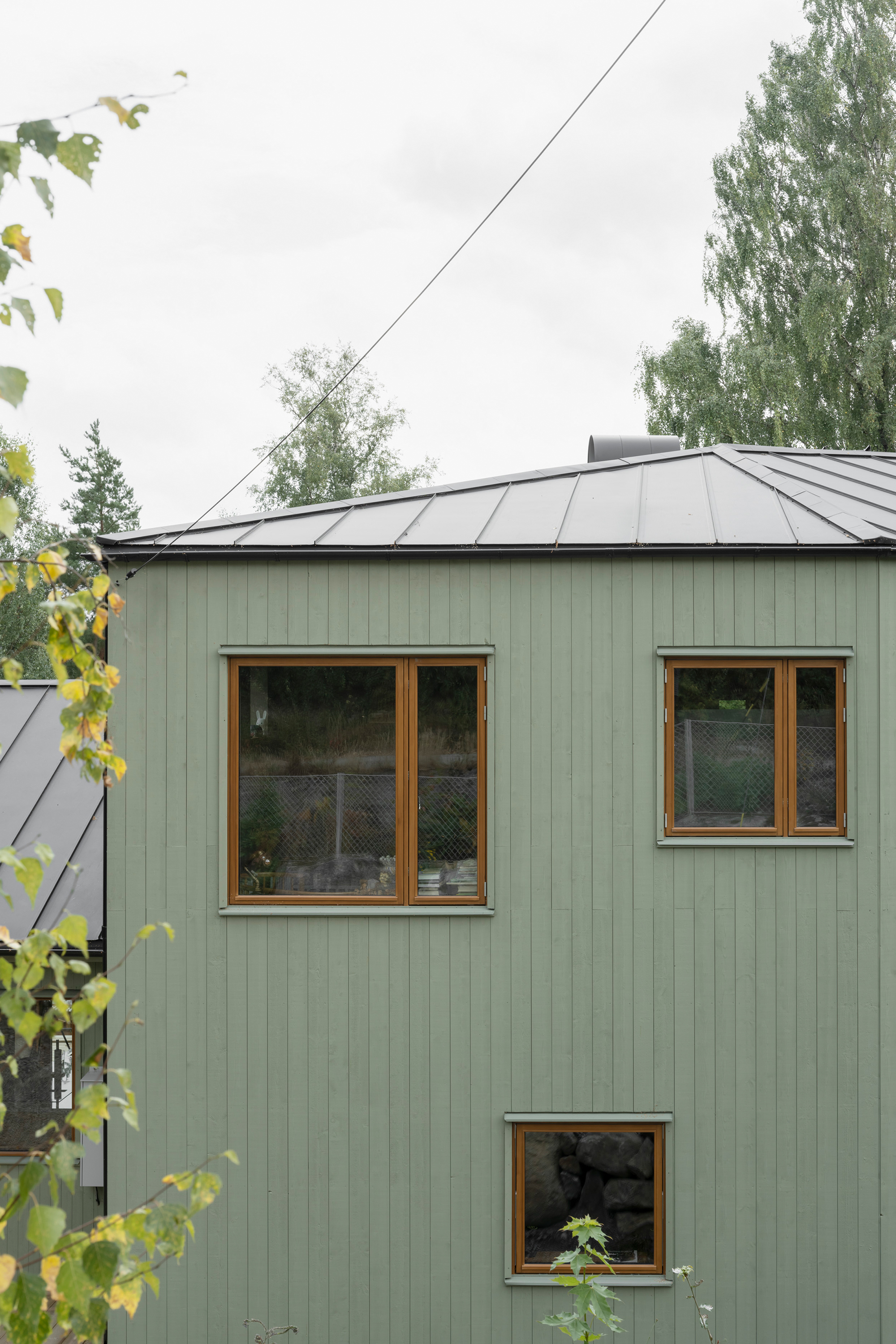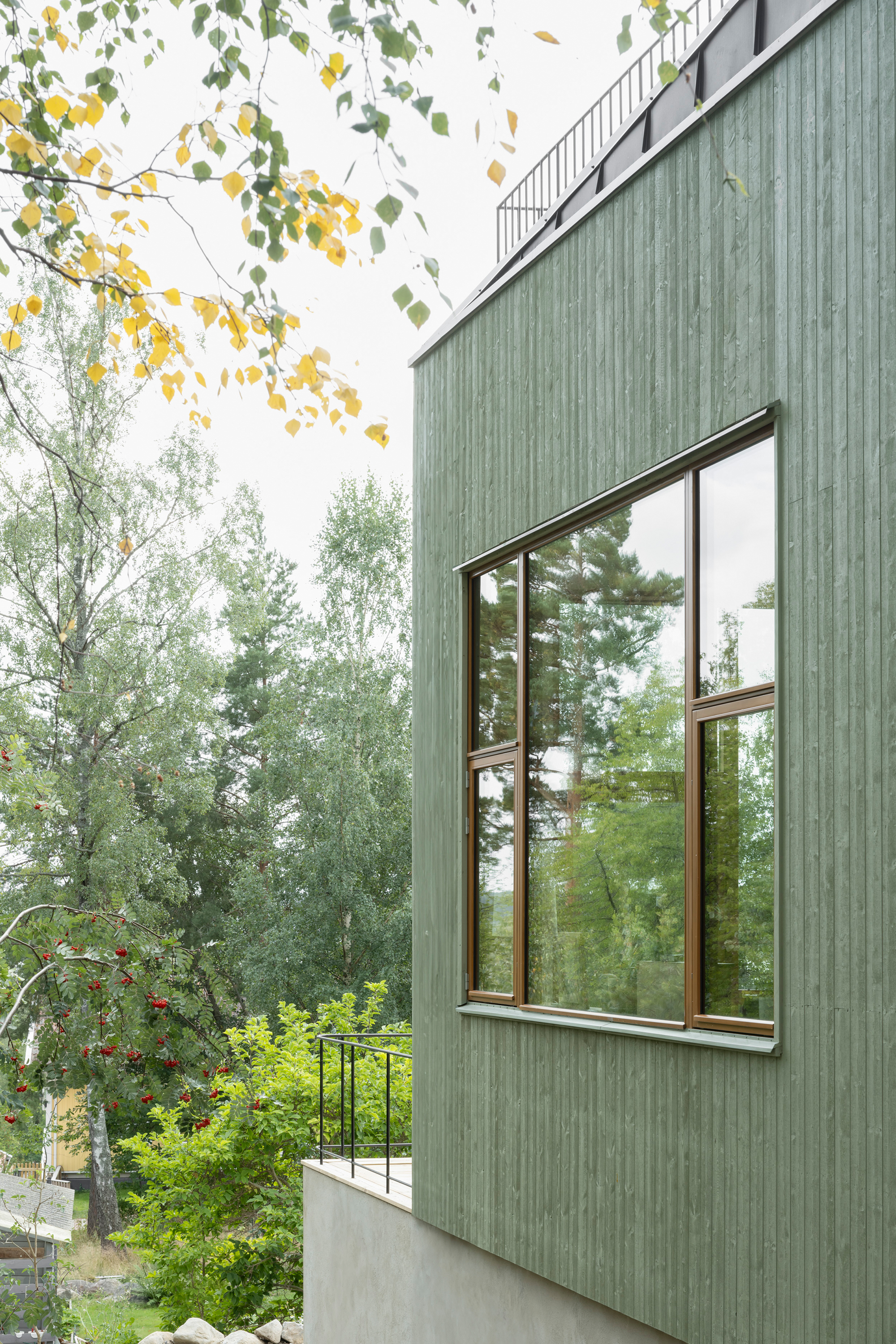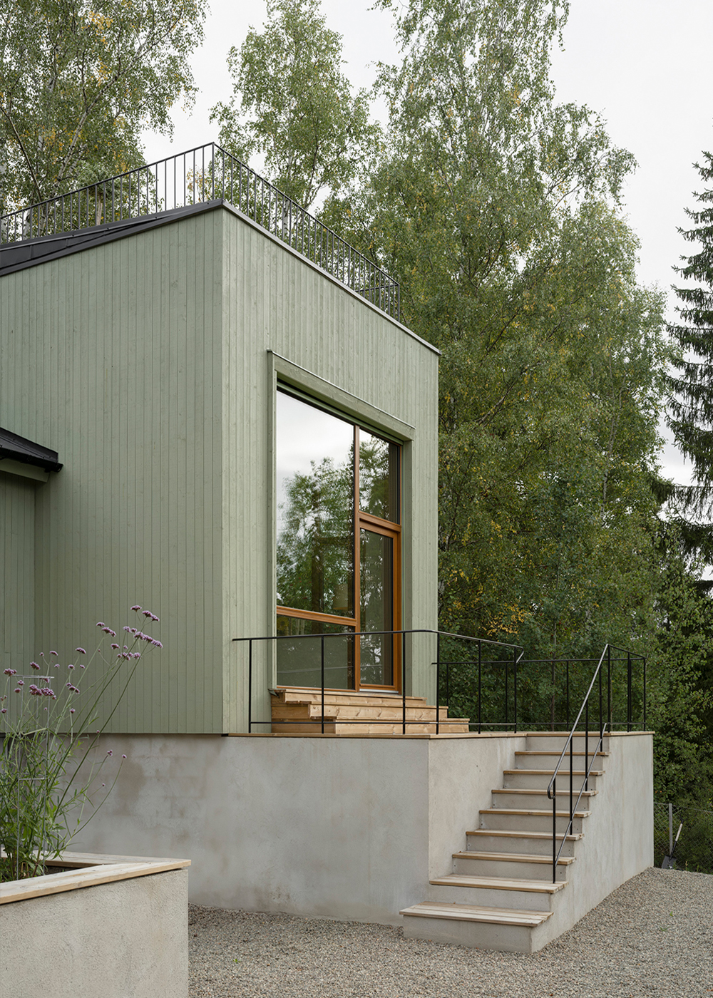 Externally, the building's five volumes are all clad in green-painted spruce panelling. The panel width varies between the volumes, with narrower panels on the smaller volumes and wider panels on the larger ones. The choice of this green, mild treatment aims to unify the five volumes into a more cohesive whole. A series of terraces has been arranged in front of the house to bridge the height differences between the house and the garden and at the same time create outdoor areas that connect more directly to the interior. A chimney with both an indoor and outdoor fireplace is integrated into the facade glazing of the living room, further enhancing and activating the relationship between the house and the garden.