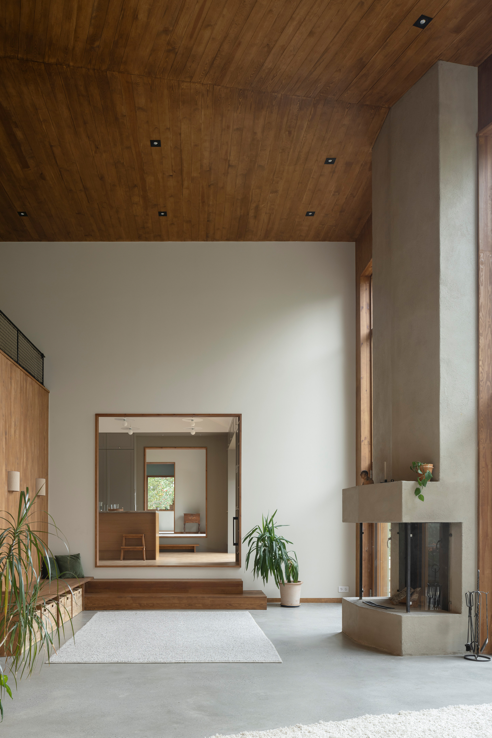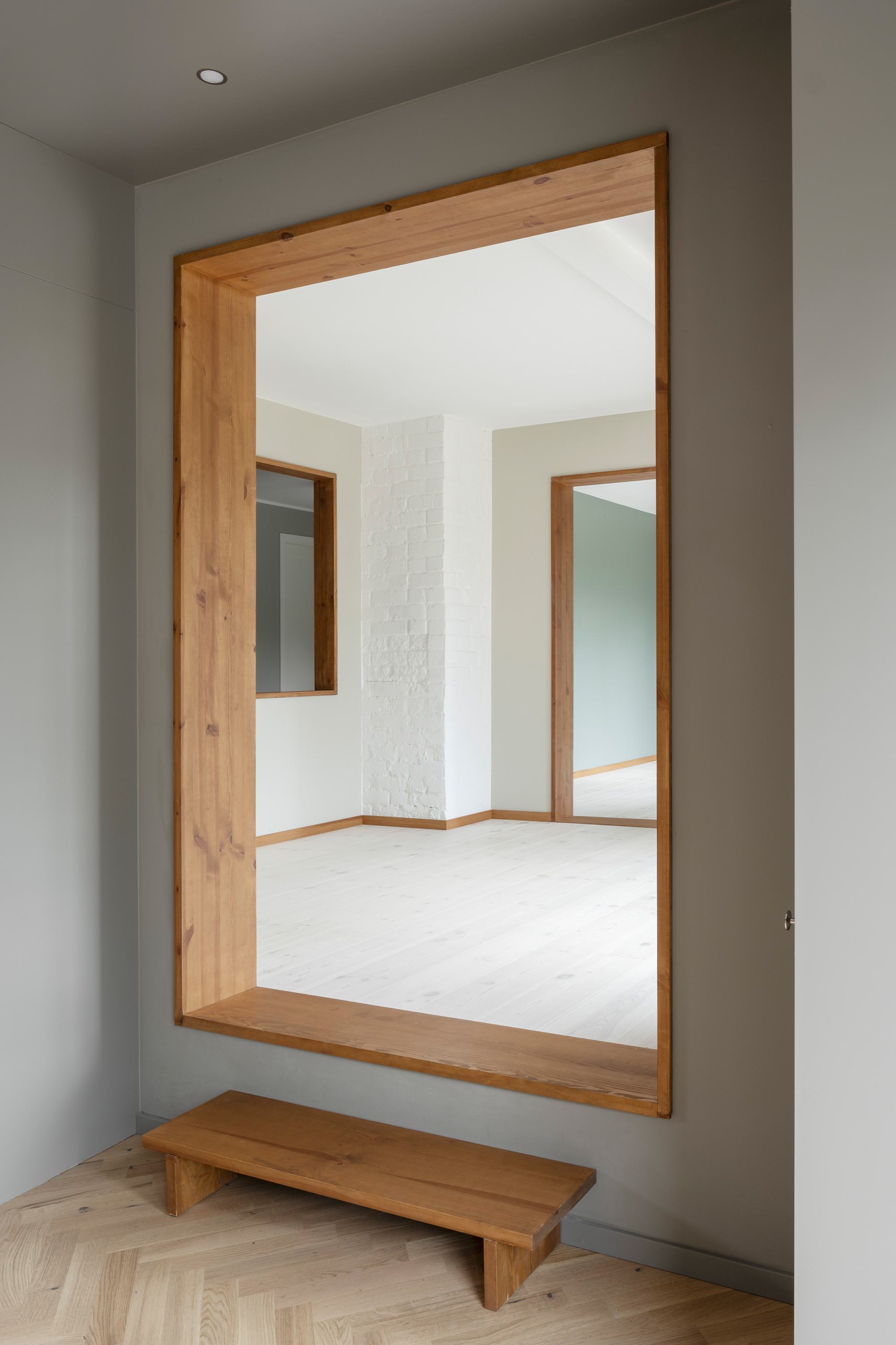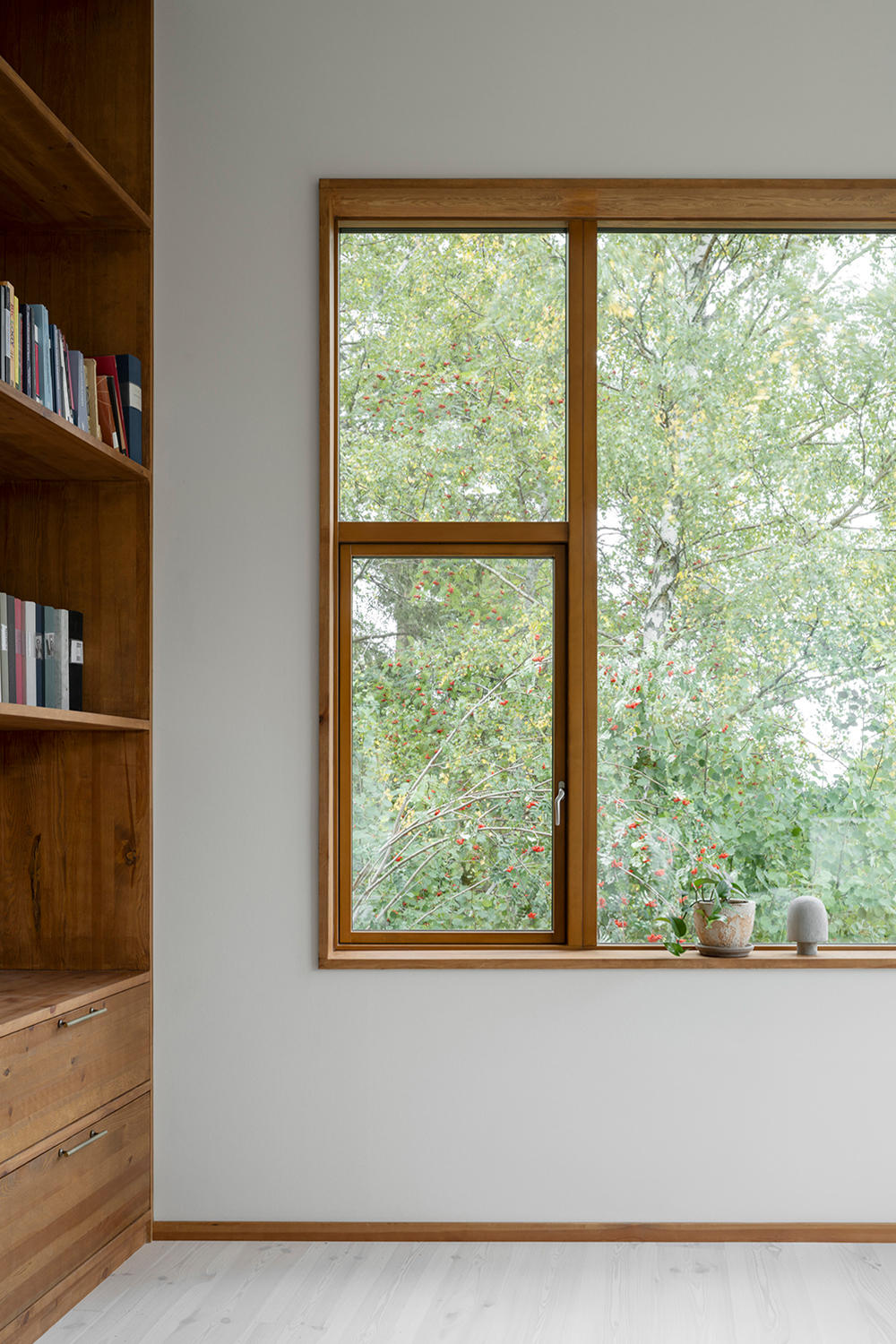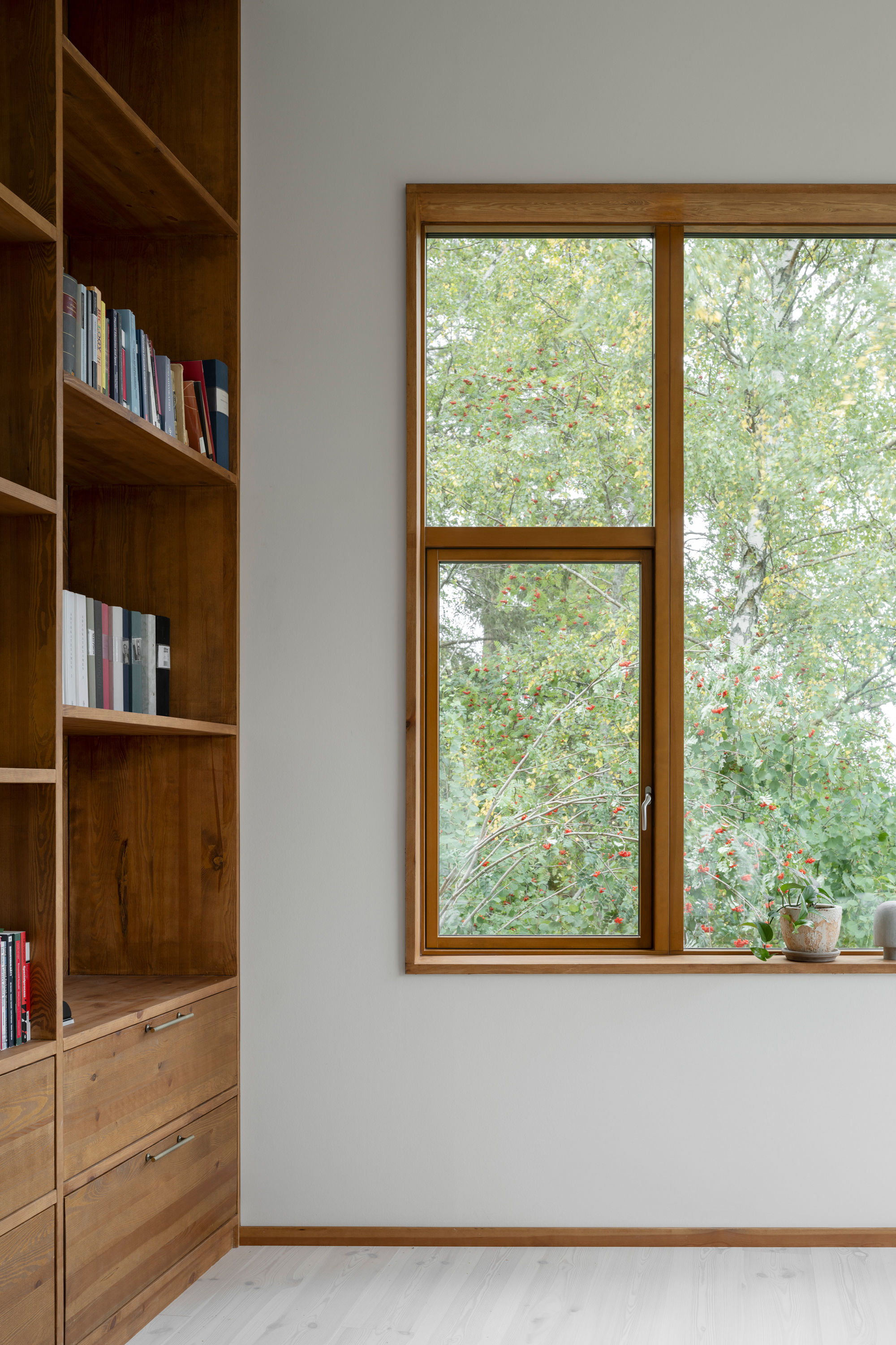 Along the garden side, the layout features an enfilade with large windows towards the garden, running from the double-height living room in the west, through the existing building with its more intimate rooms, and concluding towards east in the combined office/dining room overlooking the adjacent forest. This characteristic of 'rooms in a lane' is emphasized in the interior through the use of stained knot-free pine for mouldings, wall openings, and thresholds – a contrast to the adjacent wall and floor materials. The same stained pine is used as wall- and ceiling panelling in the double-height living room. Together with pine window frames – used consistently throughout the house – this lends the living room warmth as a contrast to the room’s polished concrete floor.