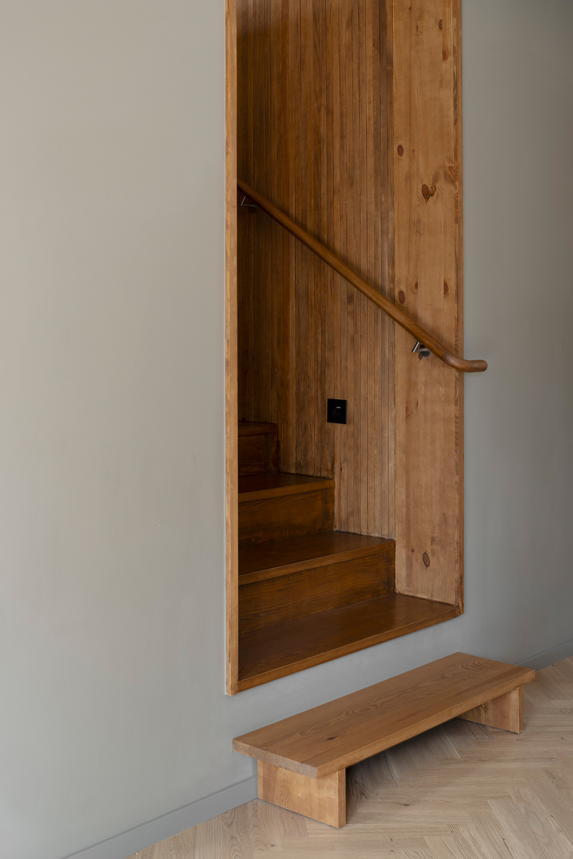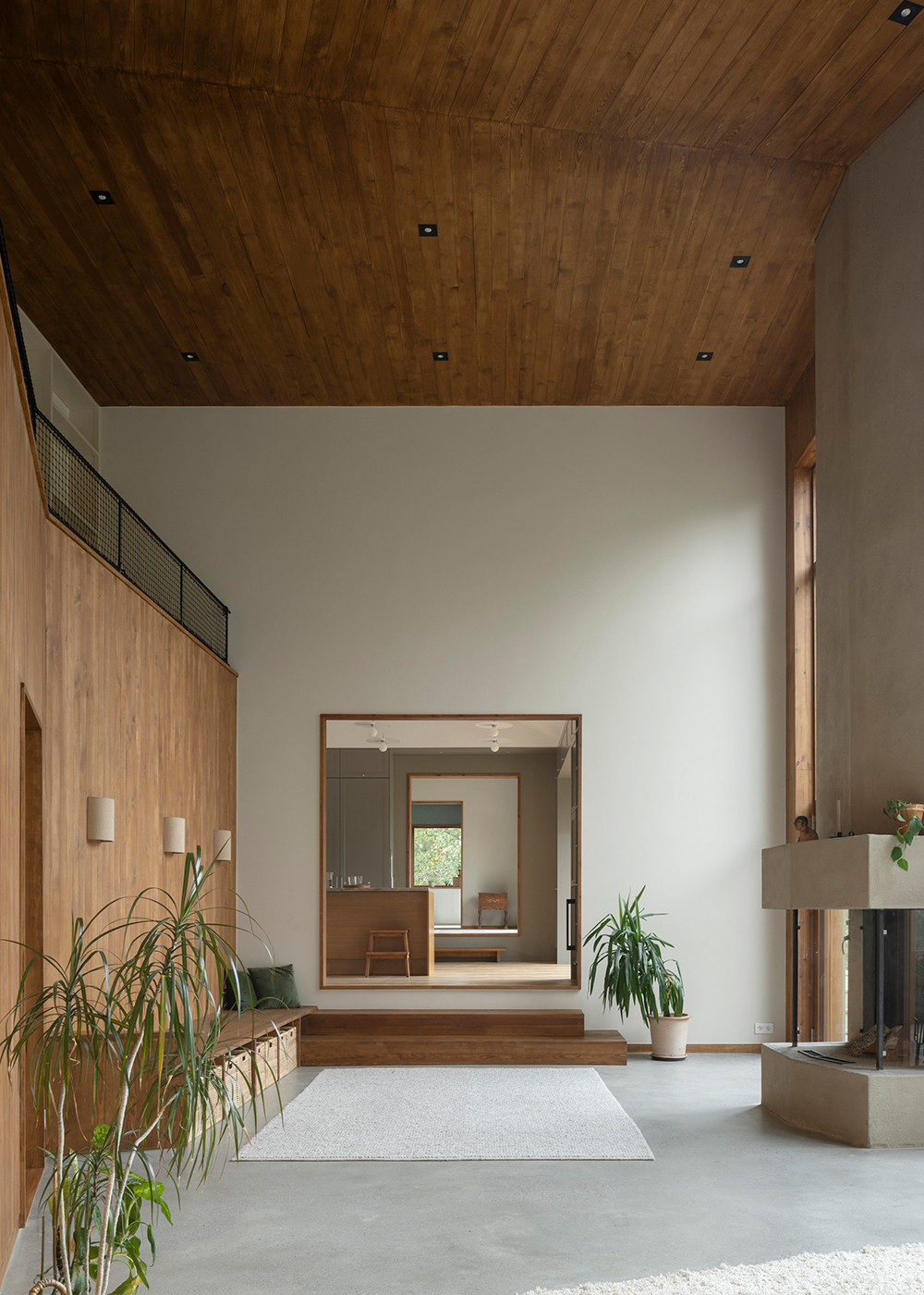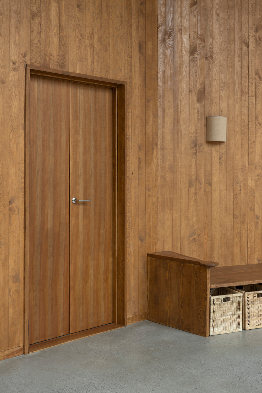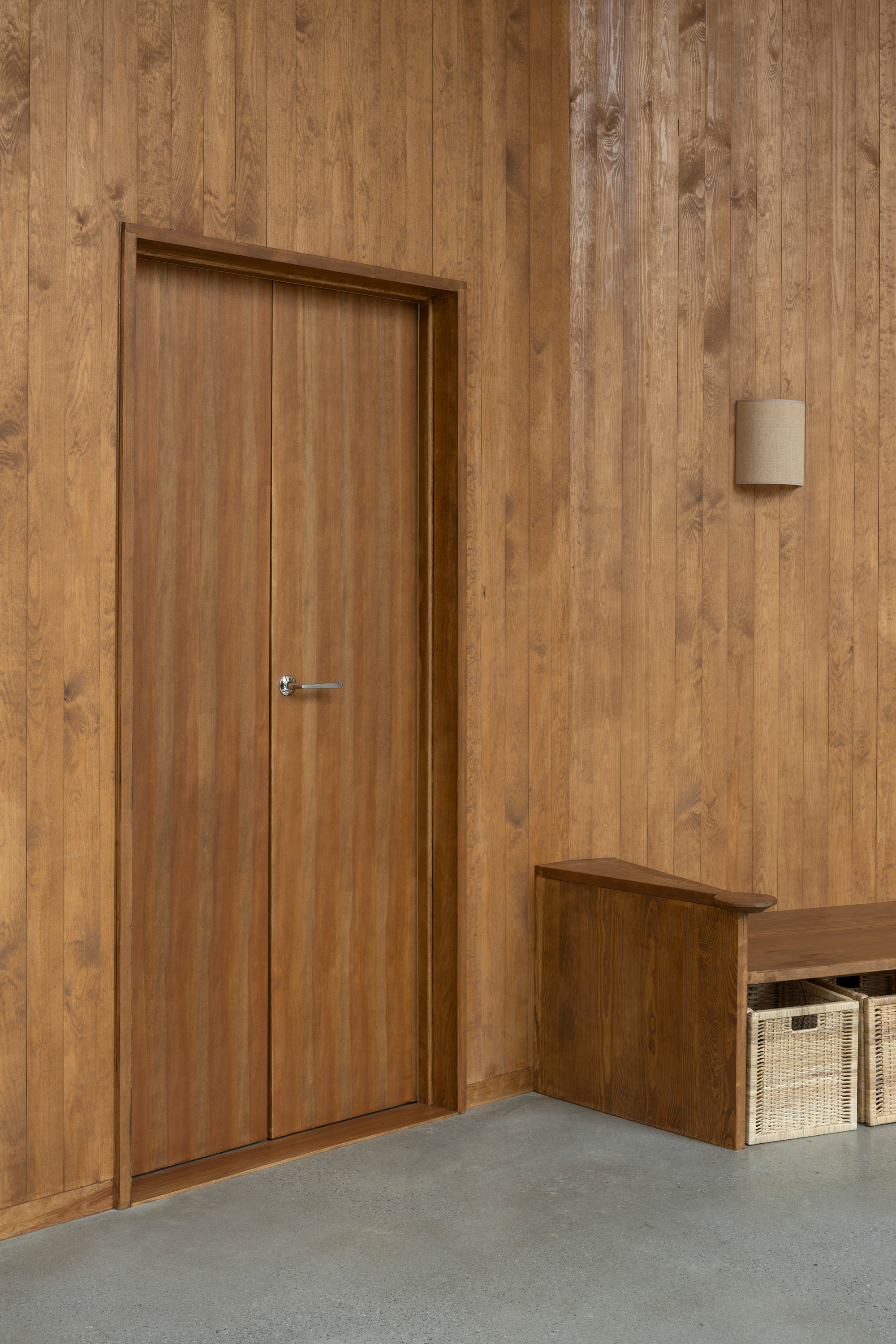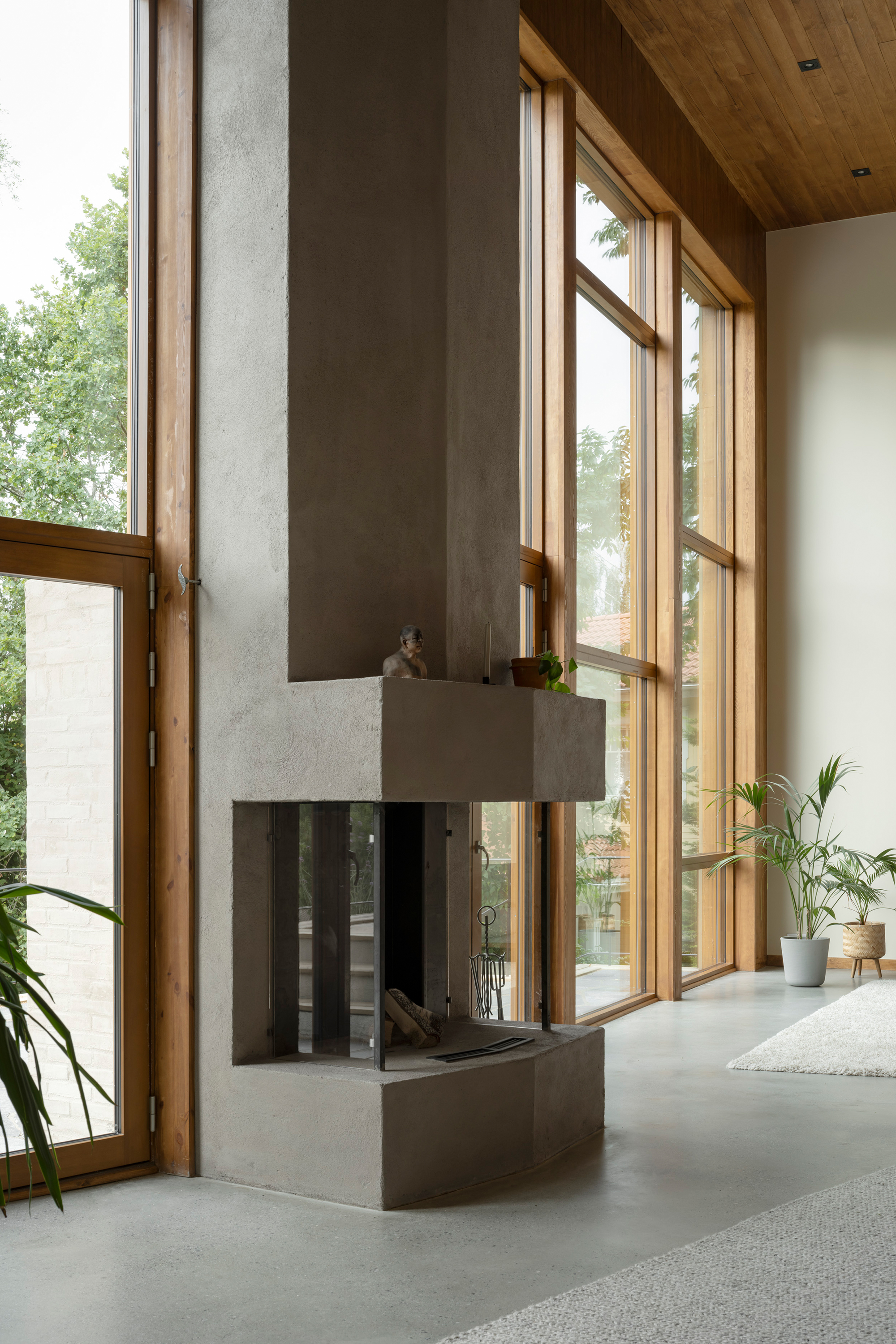 Along the garden side, the layout features an enfilade with large windows towards the garden, running from the double-height living room in the west, through the existing building with its more intimate rooms, and concluding towards east in the combined office/dining room overlooking the adjacent forest. This characteristic of 'rooms in a lane' is emphasized in the interior through the use of stained knot-free pine for mouldings, wall openings, and thresholds – a contrast to the adjacent wall and floor materials. The same stained pine is used as wall- and ceiling panelling in the double-height living room. Together with pine window frames – used consistently throughout the house – this lends the living room warmth as a contrast to the room’s polished concrete floor.
