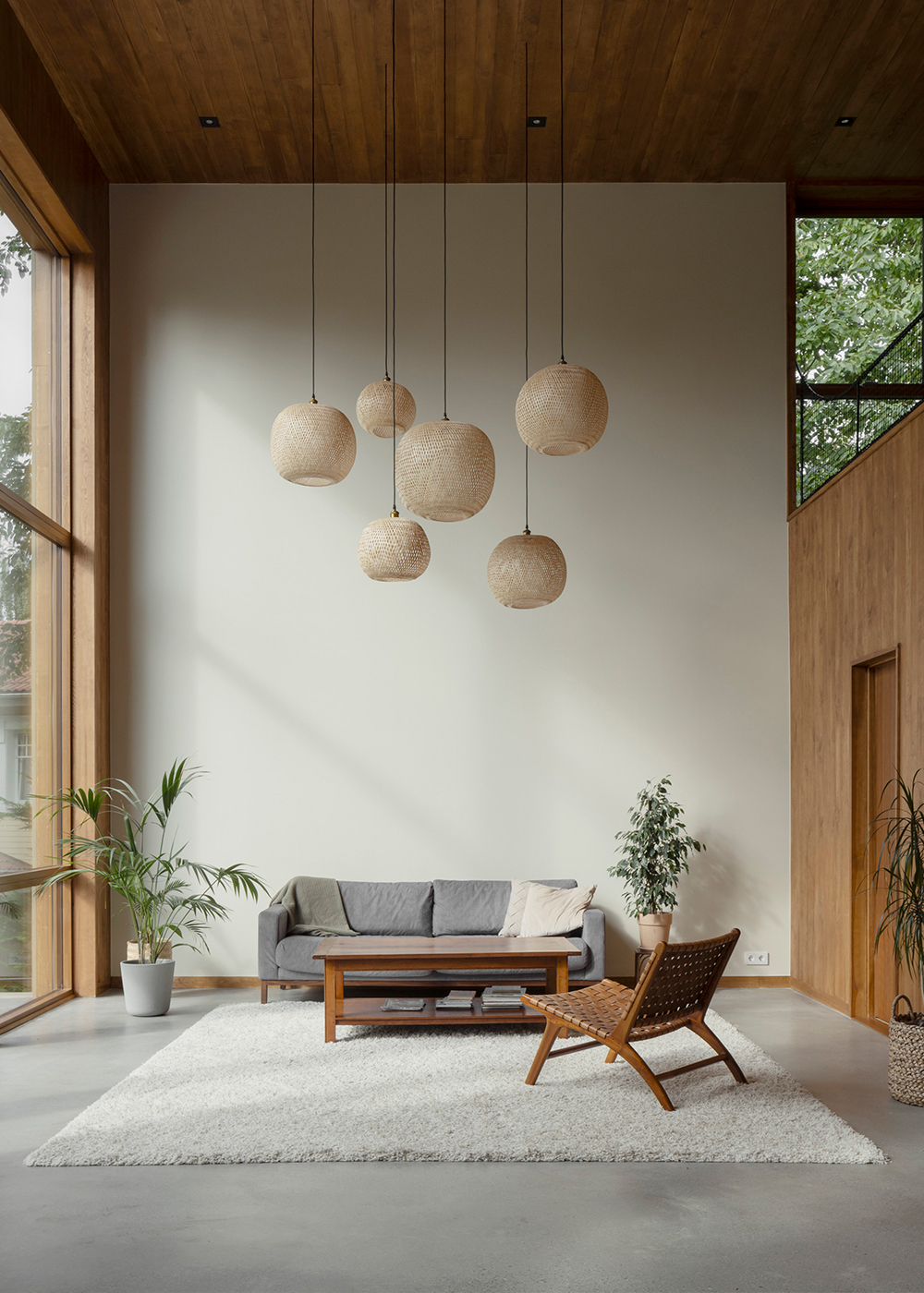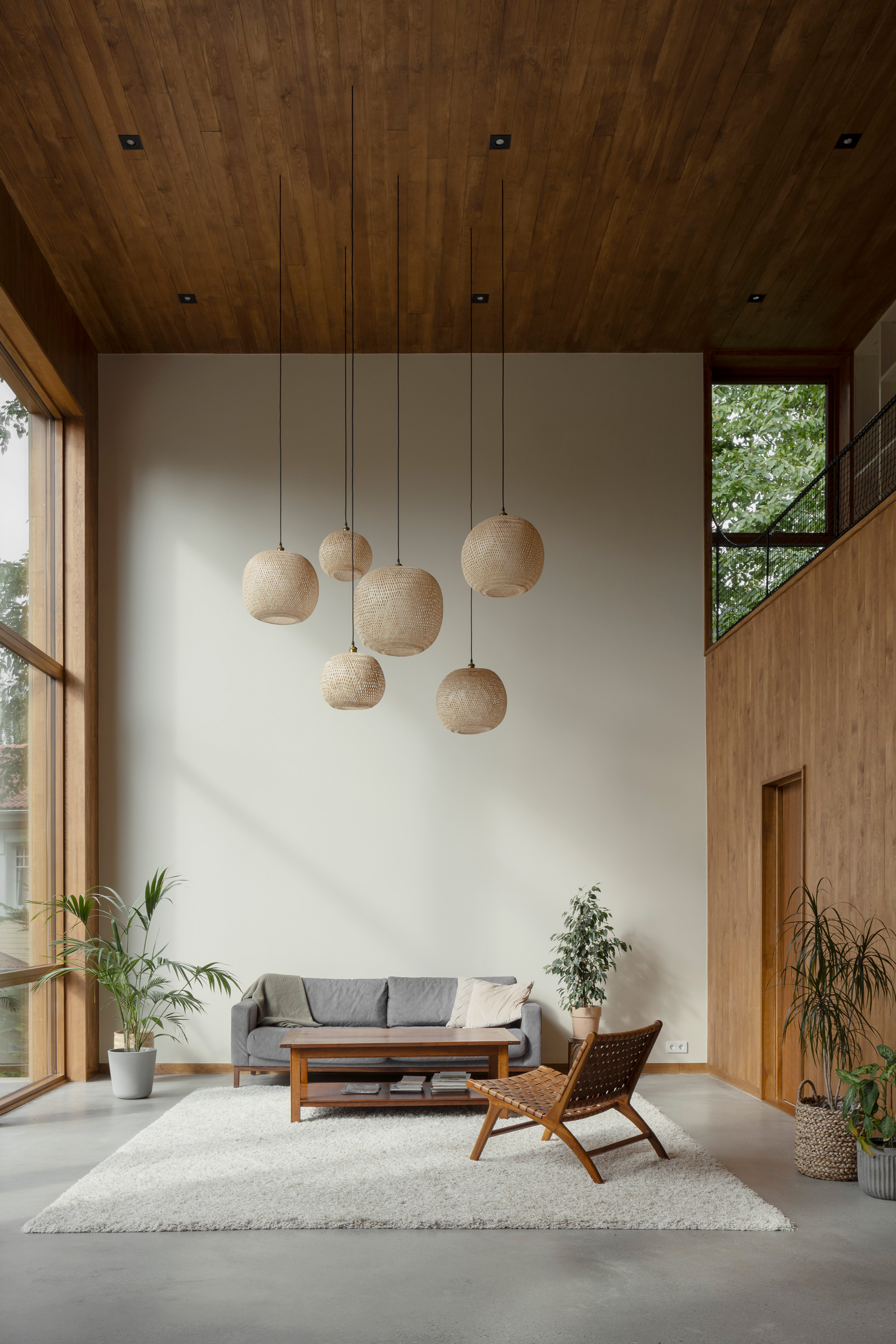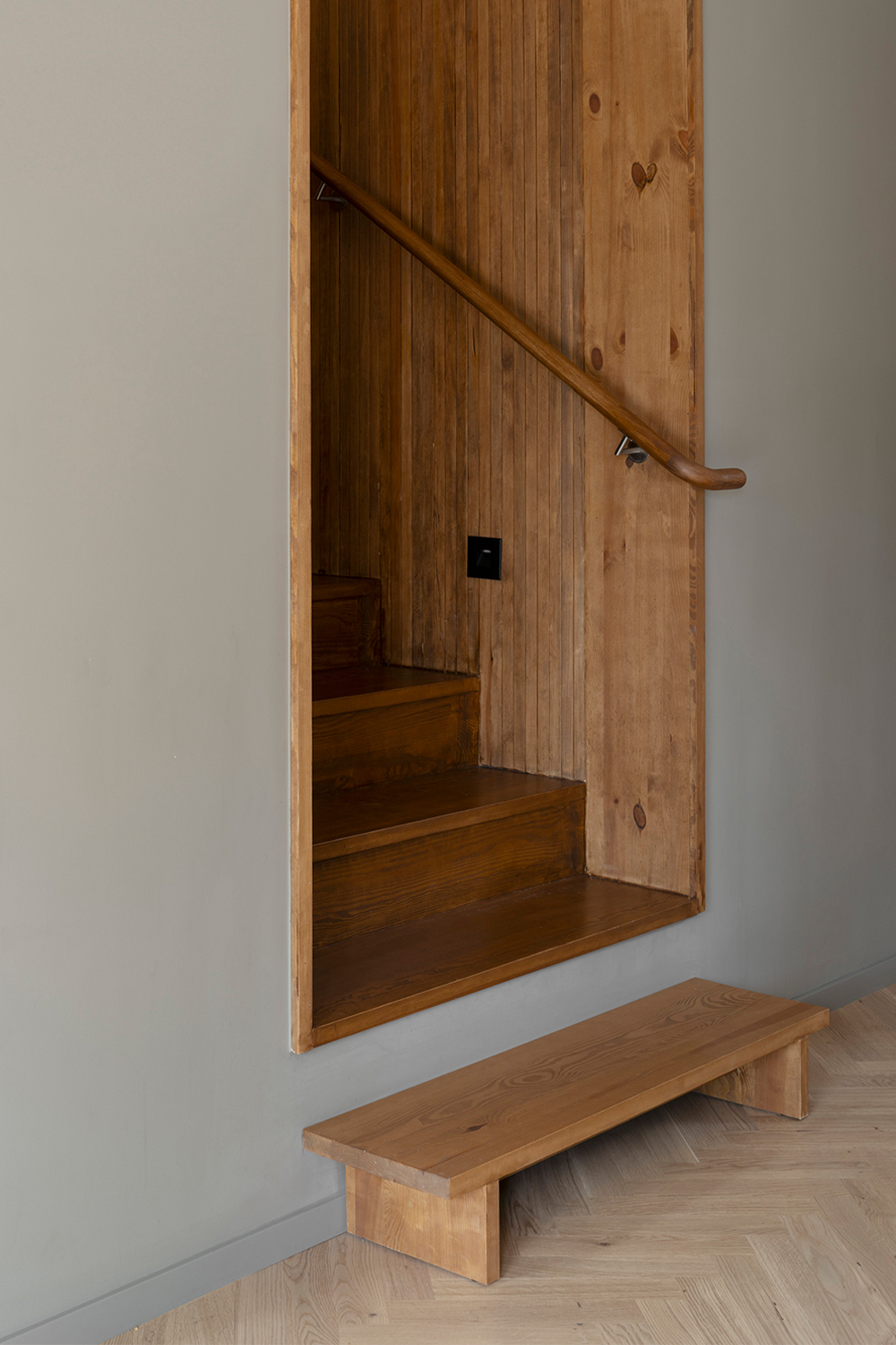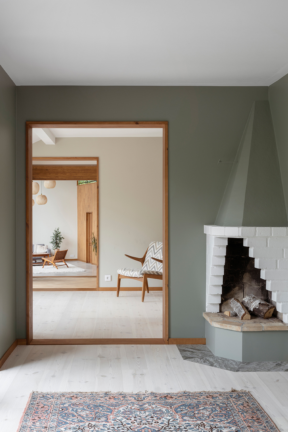 Along the garden side, the layout features an enfilade with large windows towards the garden, running from the double-height living room in the west, through the existing building with its more intimate rooms, and concluding towards east in the combined office/dining room overlooking the adjacent forest. This characteristic of 'rooms in a lane' is emphasized in the interior through the use of stained knot-free pine for mouldings, wall openings, and thresholds – a contrast to the adjacent wall and floor materials. The same stained pine is used as wall- and ceiling panelling in the double-height living room. Together with pine window frames – used consistently throughout the house – this lends the living room warmth as a contrast to the room’s polished concrete floor.