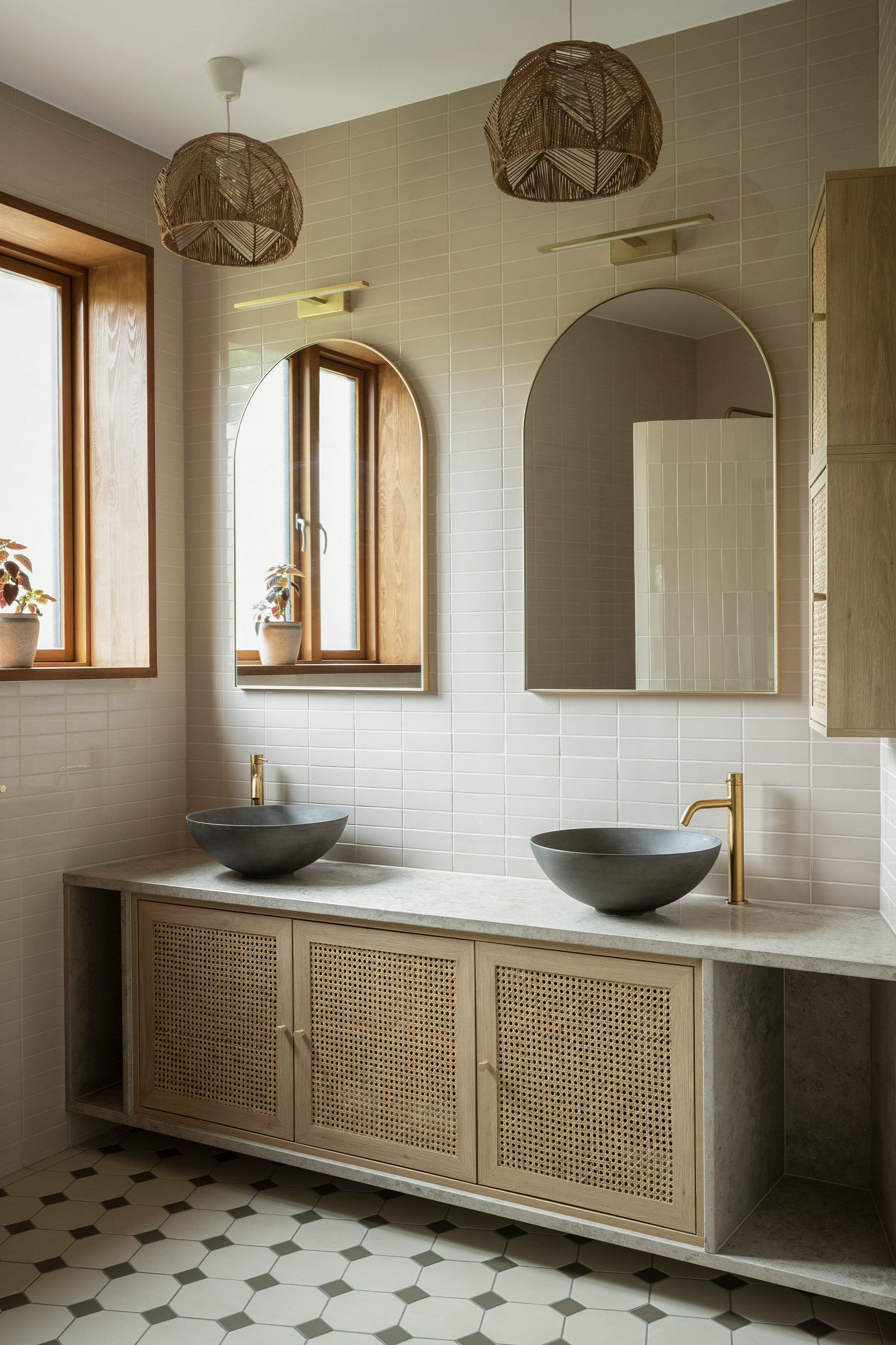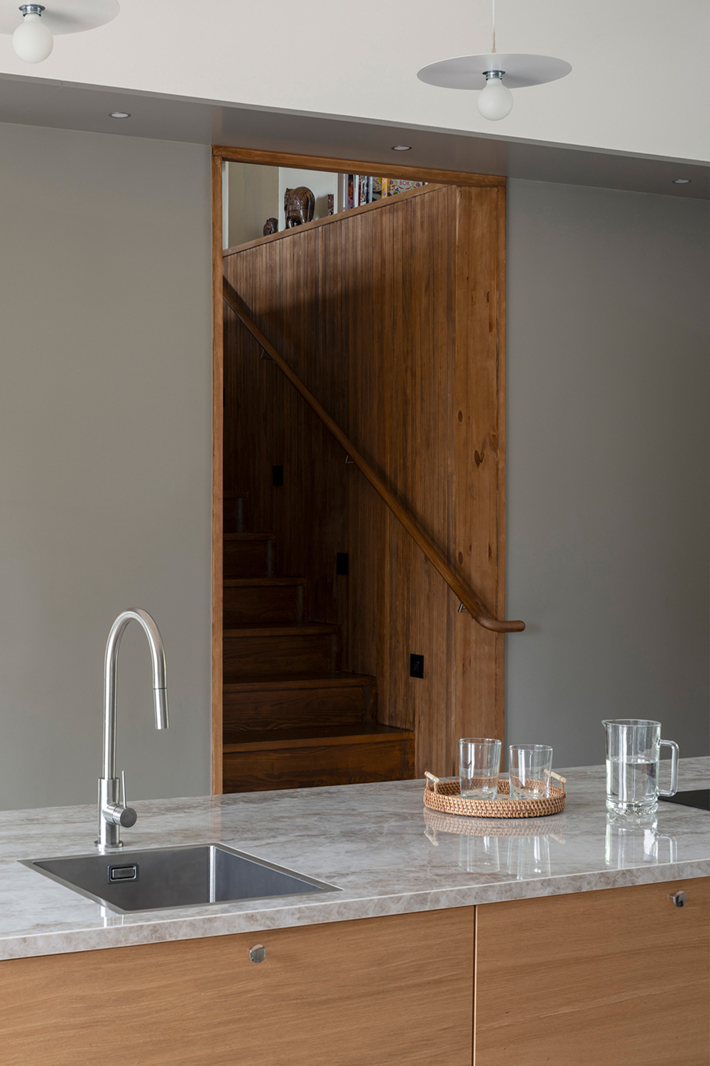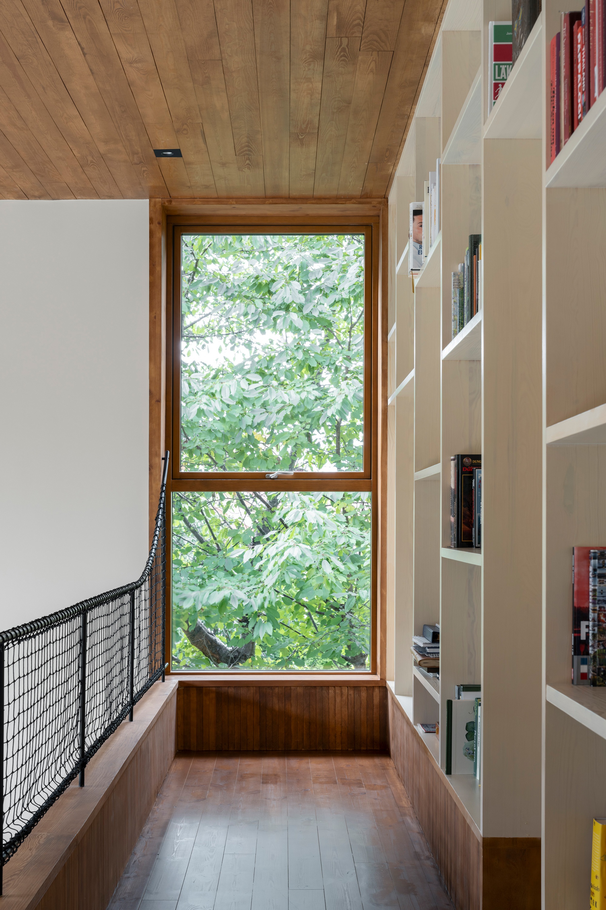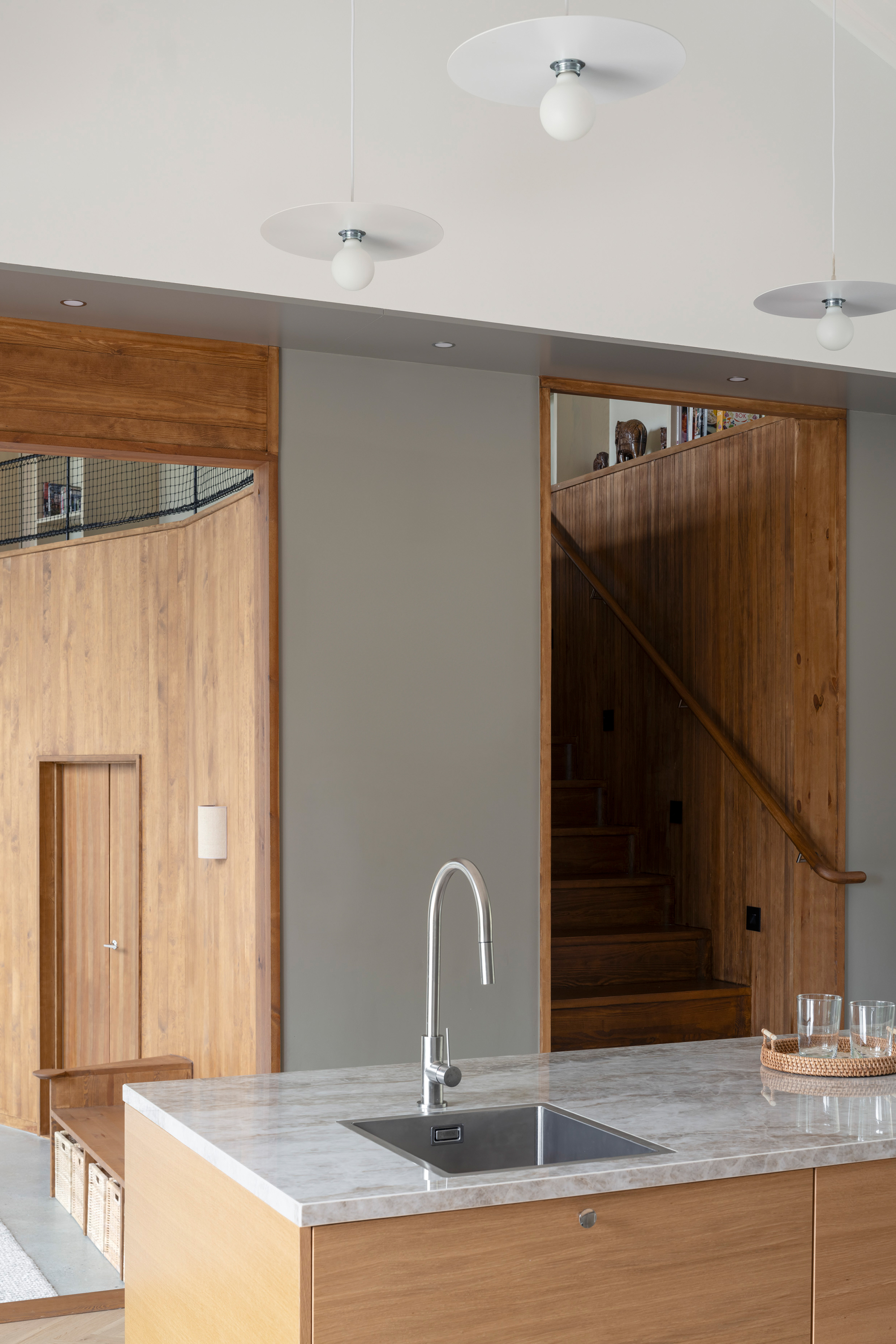 The building can be described as a composition of five volumes – three smaller existing ones framed by two taller new volumes, one on either side of the existing building. The larger volume, situated to the west, features a double-height living room along the entire garden side and a rear zone with more intimate rooms distributed over two floors. Movement to the upper rooms in the larger volume occurs along a balcony overlooking the living room. The heart of the house – the kitchen – is located in the space previously serving as living room. Its central location connects all the building’s floor levels and contributes to intersecting flows within the home.