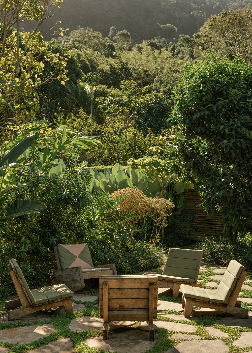 The central courtyard is the heart of the project. It assumes the ambiance of a naturalistic tropical garden, where the orthogonal lines of the house gently contrast with the organic nature of the vegetation. Irregularly shaped stone slabs create paths that suggest barefoot, unpretentious walking. The plant composition blends species of varying sizes, without rigid hierarchies, but rather in volumes and layers, promoting visual depth and a constant presence of greenery visible from all points of the social area.