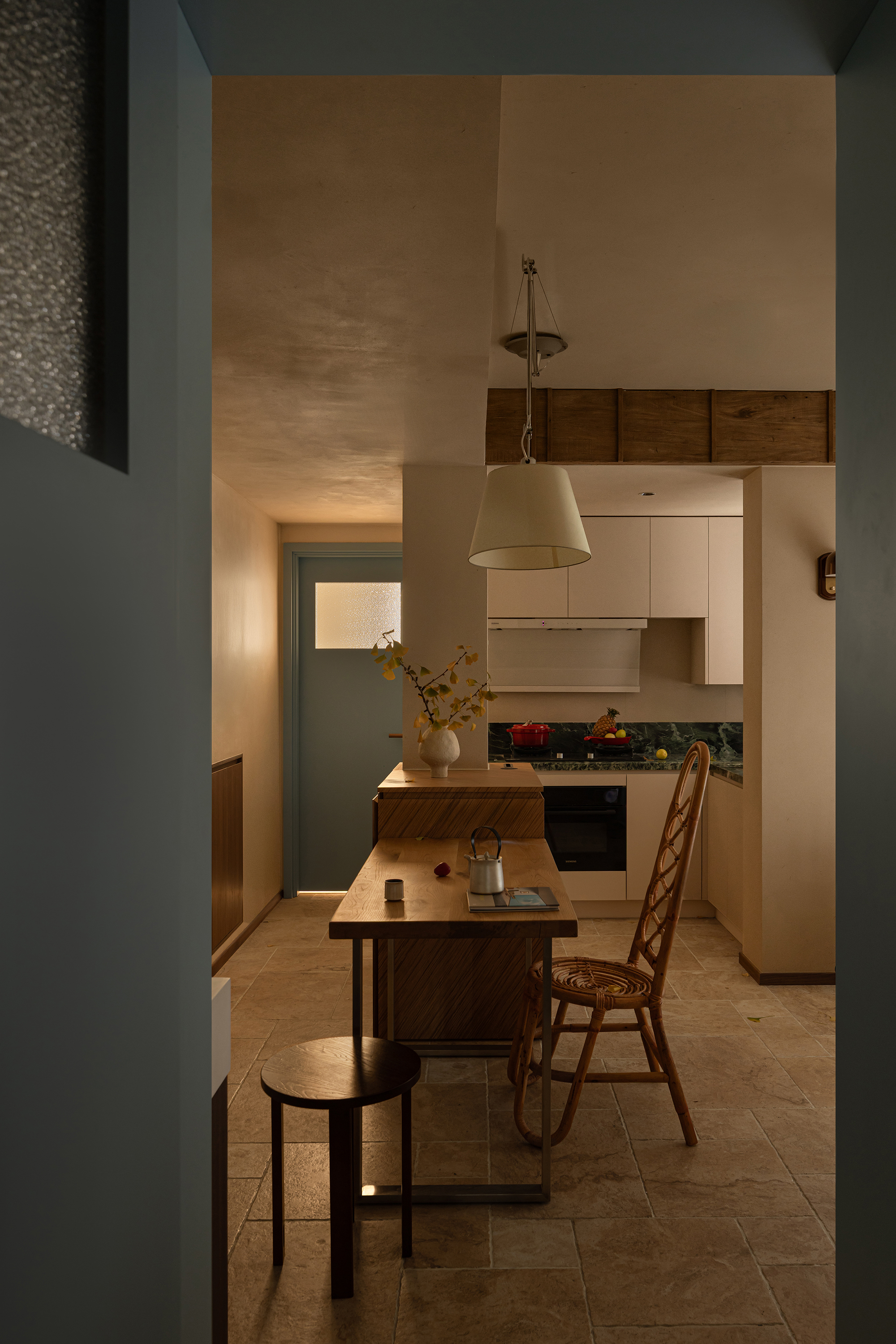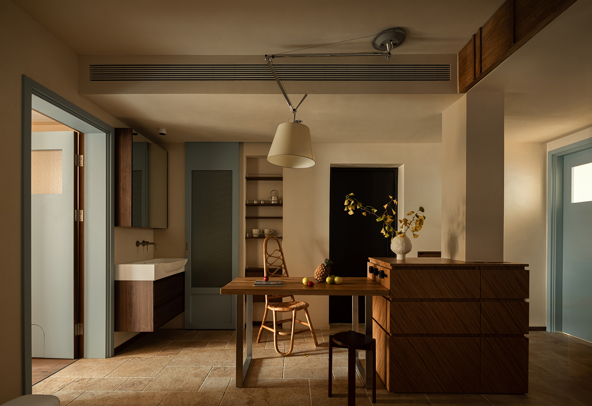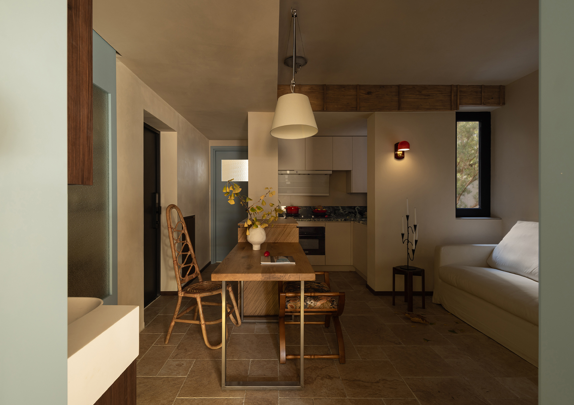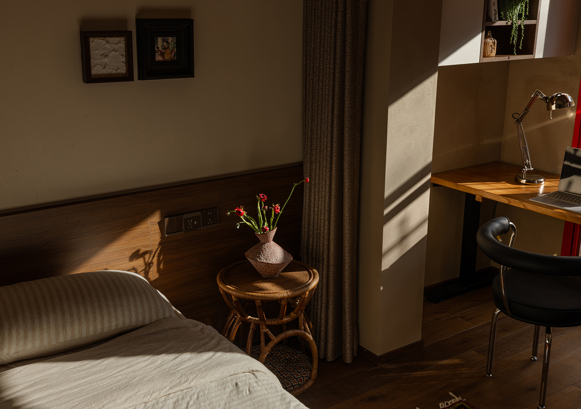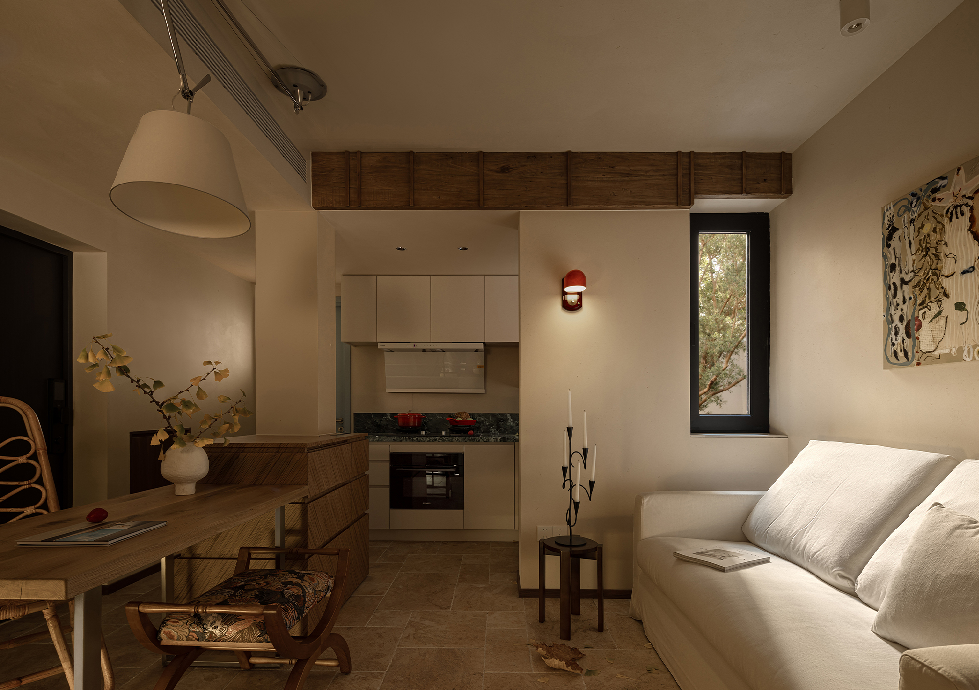 A desk is placed in the bedroom, breaking the barriers of traditional functional zoning. Between morning and evening, reading and resting can be seamlessly switched. The art paint on the wall presents a delicate texture, and as light and shadow flow, it resembles a plain silk, providing a serene background for thinking and sleeping. A french window that can be opened, outlined with a distinctive red frame. It serves as the "eye of the painting" of the space - framing the four seasons of the balcony while also emanating warmth indoors. Amidst the natural tones of limestone and raw wood, this splash of red stands out like a poet, adding a touch of human warmth to the natural ambiance. When the window is opened, wind and light pour in, truly integrating the space with nature.