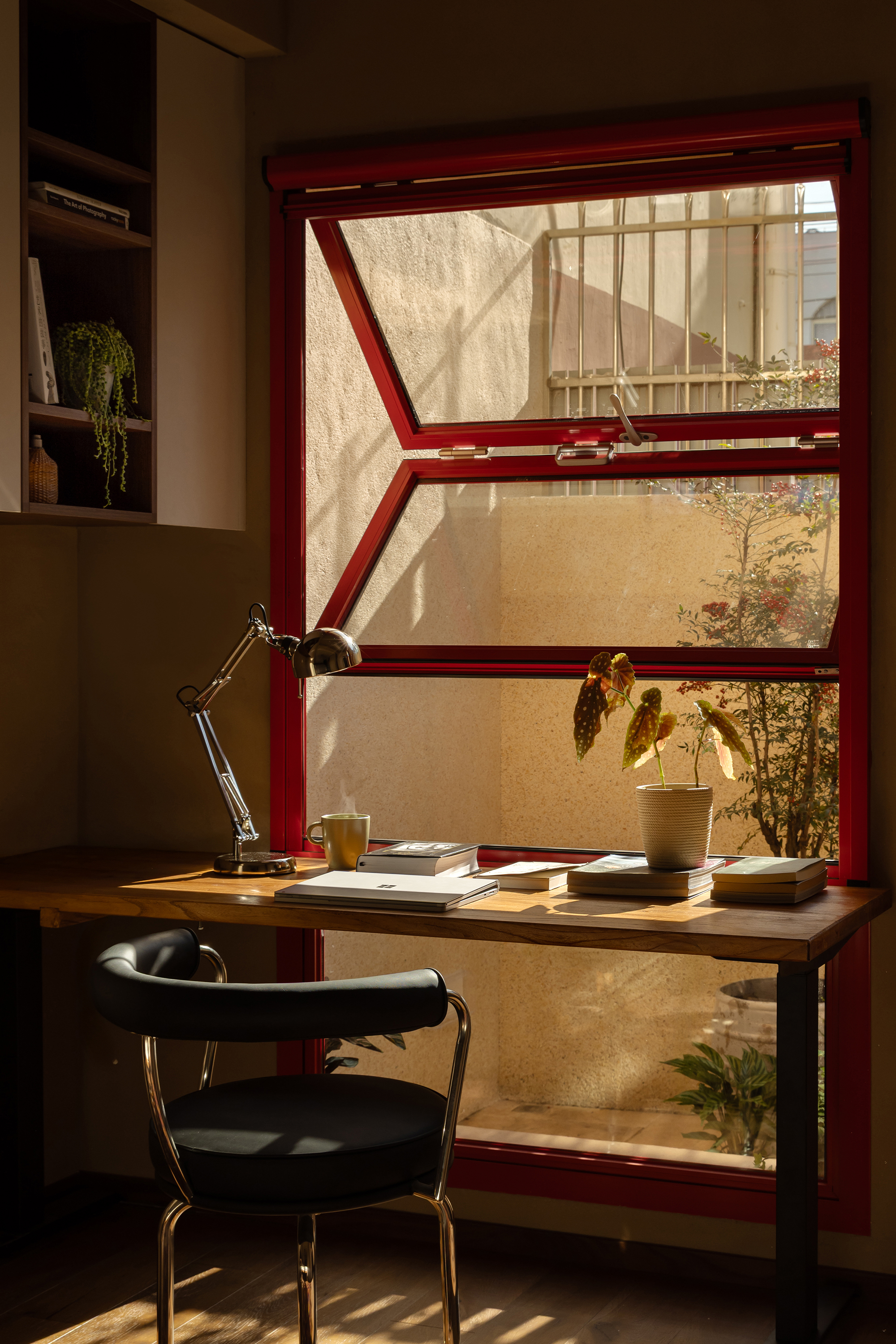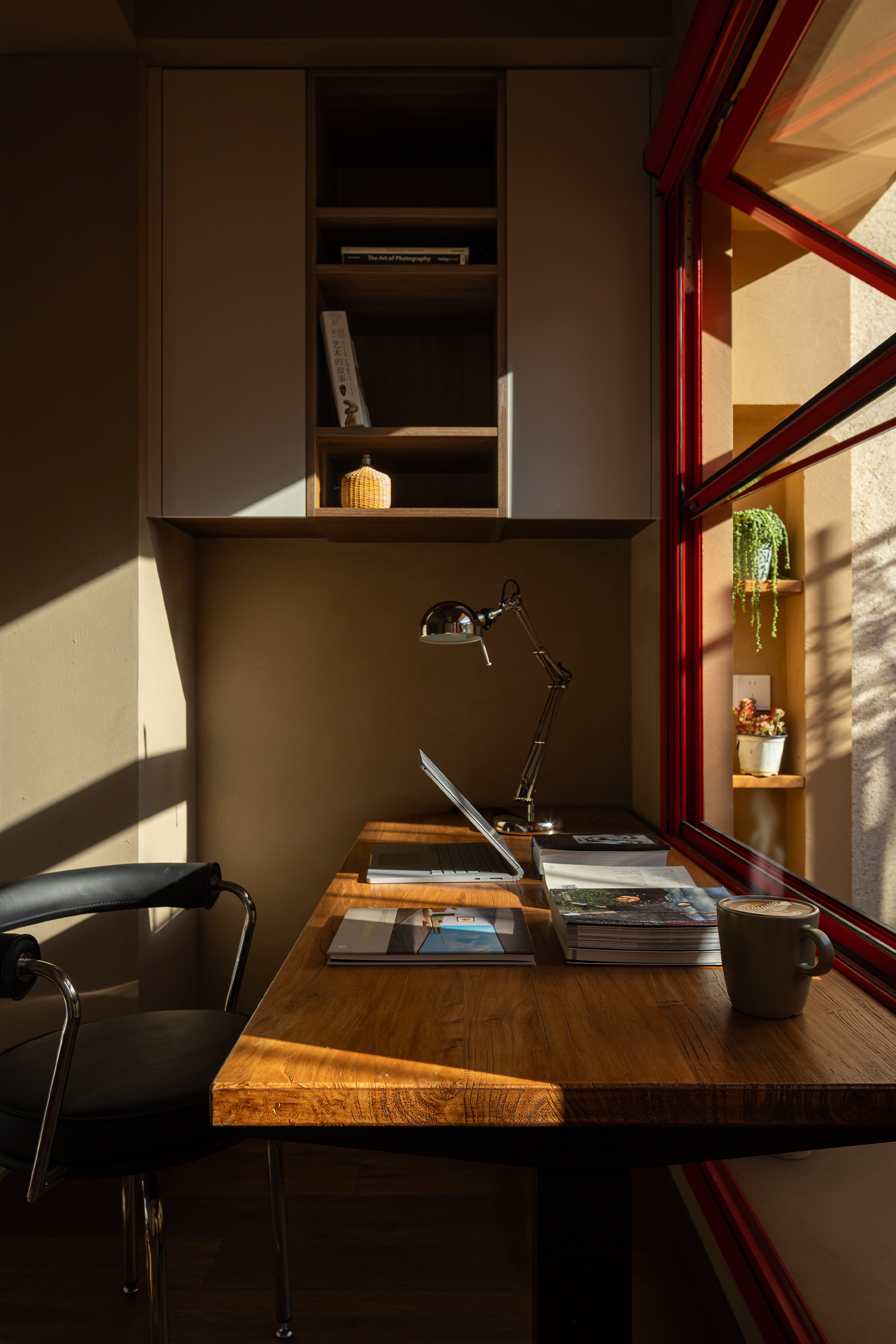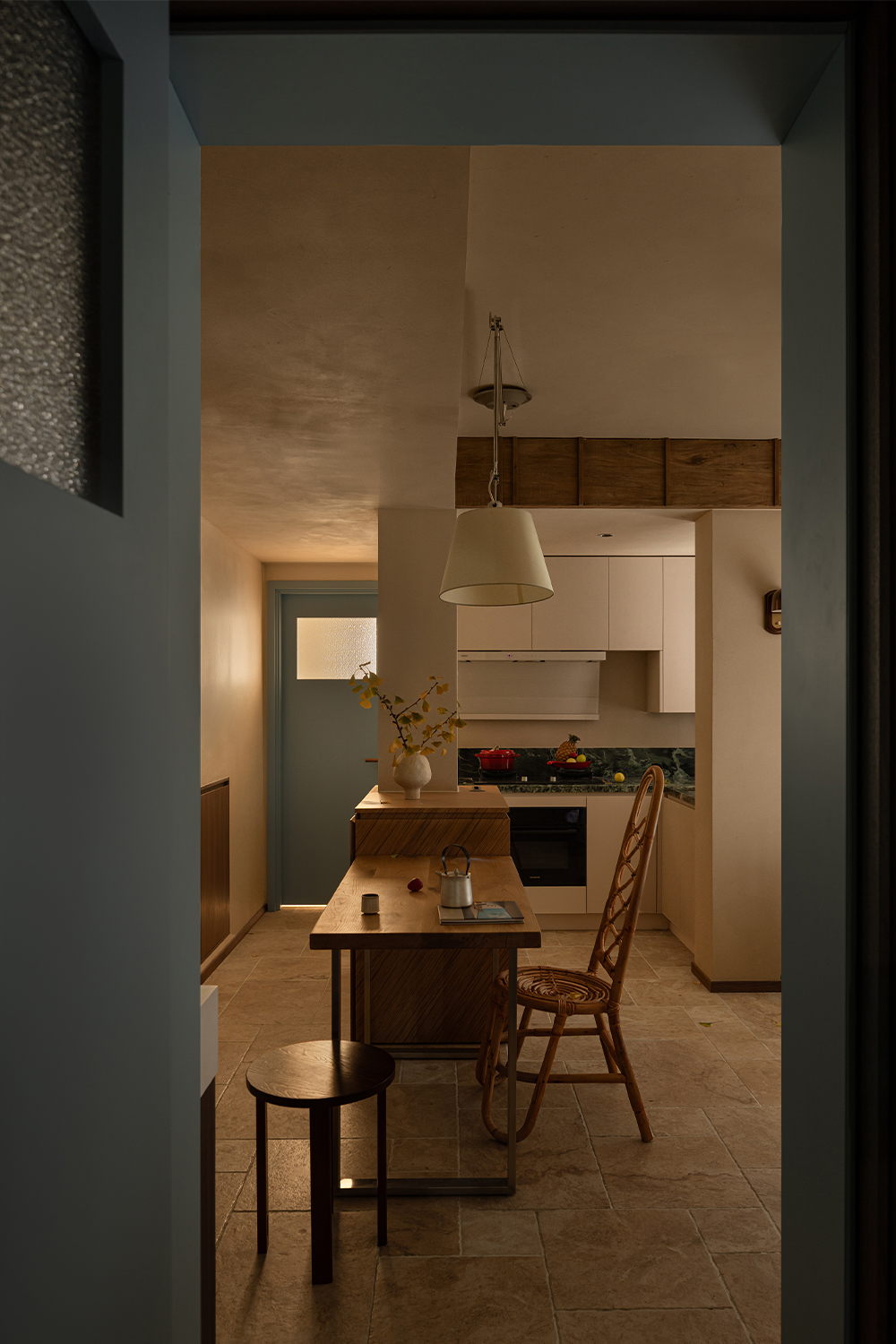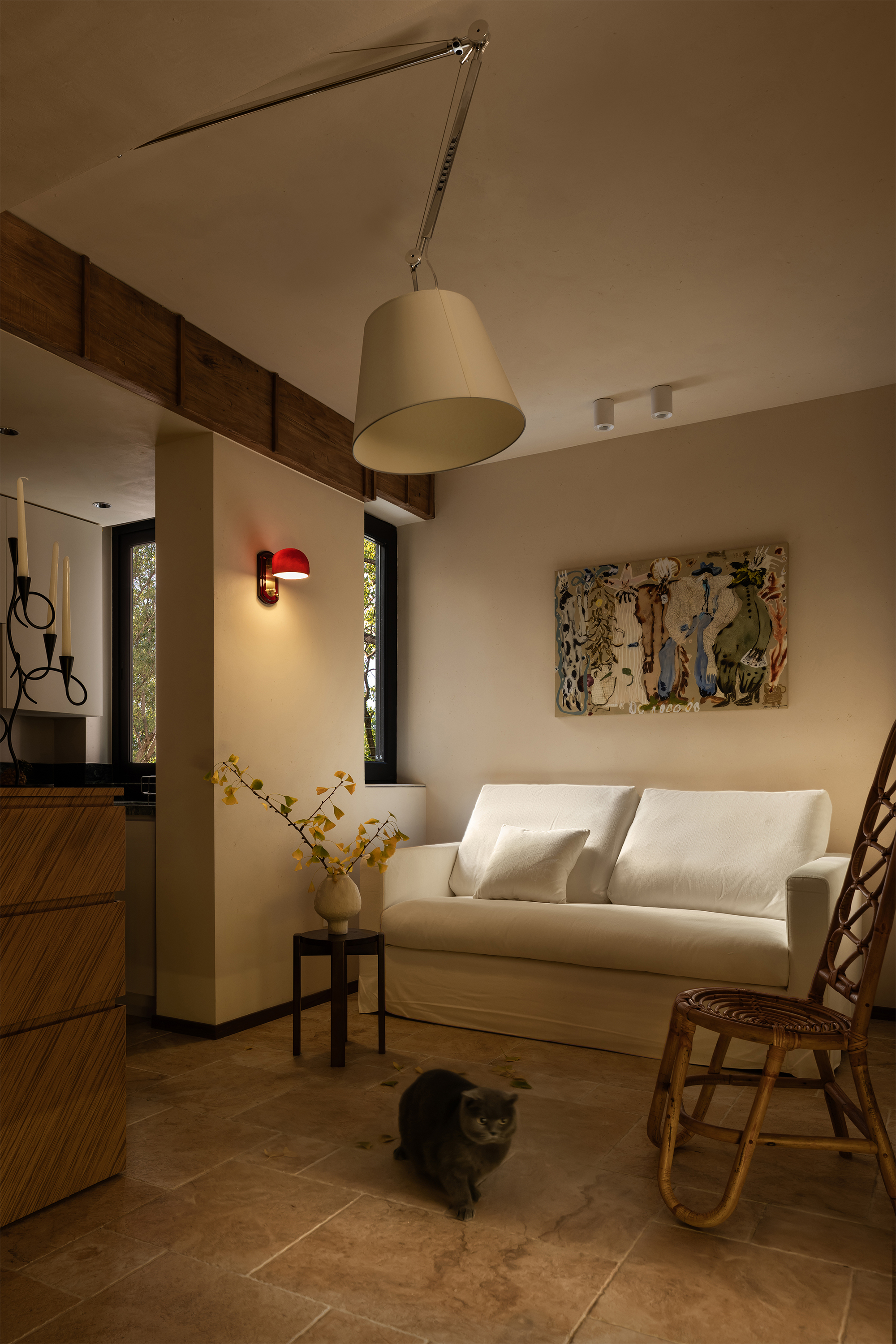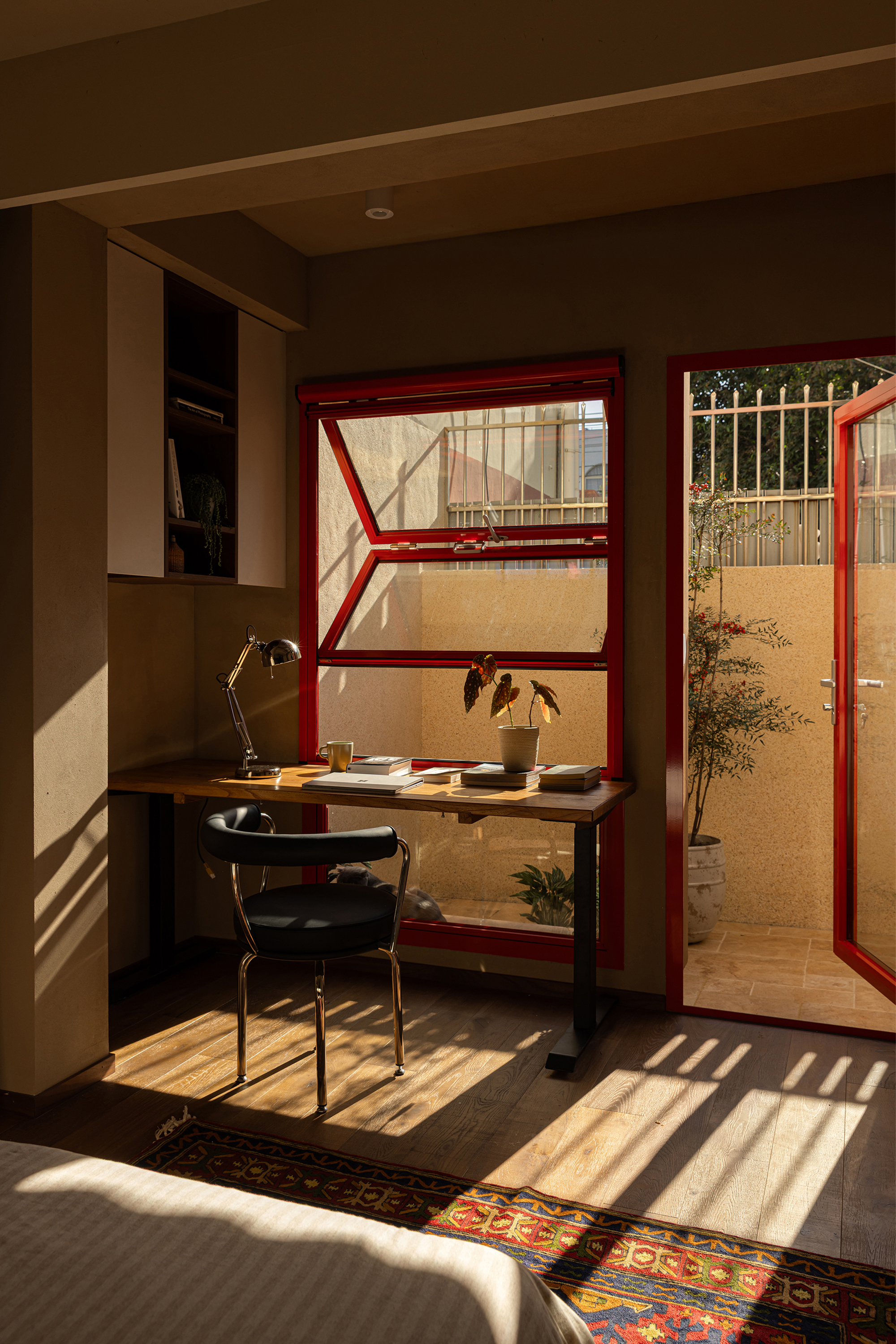 A desk is placed in the bedroom, breaking the barriers of traditional functional zoning. Between morning and evening, reading and resting can be seamlessly switched. The art paint on the wall presents a delicate texture, and as light and shadow flow, it resembles a plain silk, providing a serene background for thinking and sleeping. A french window that can be opened, outlined with a distinctive red frame. It serves as the "eye of the painting" of the space - framing the four seasons of the balcony while also emanating warmth indoors. Amidst the natural tones of limestone and raw wood, this splash of red stands out like a poet, adding a touch of human warmth to the natural ambiance. When the window is opened, wind and light pour in, truly integrating the space with nature.