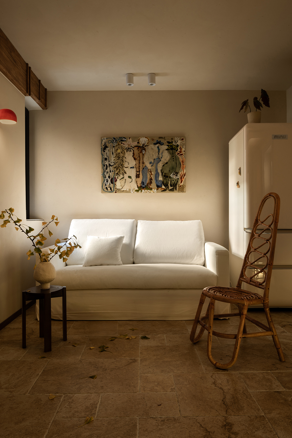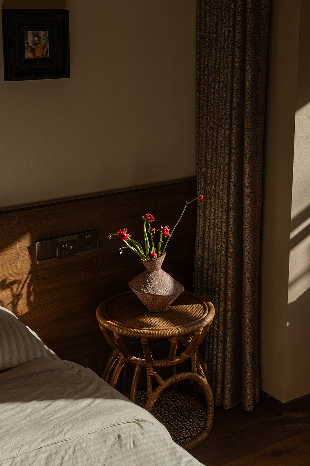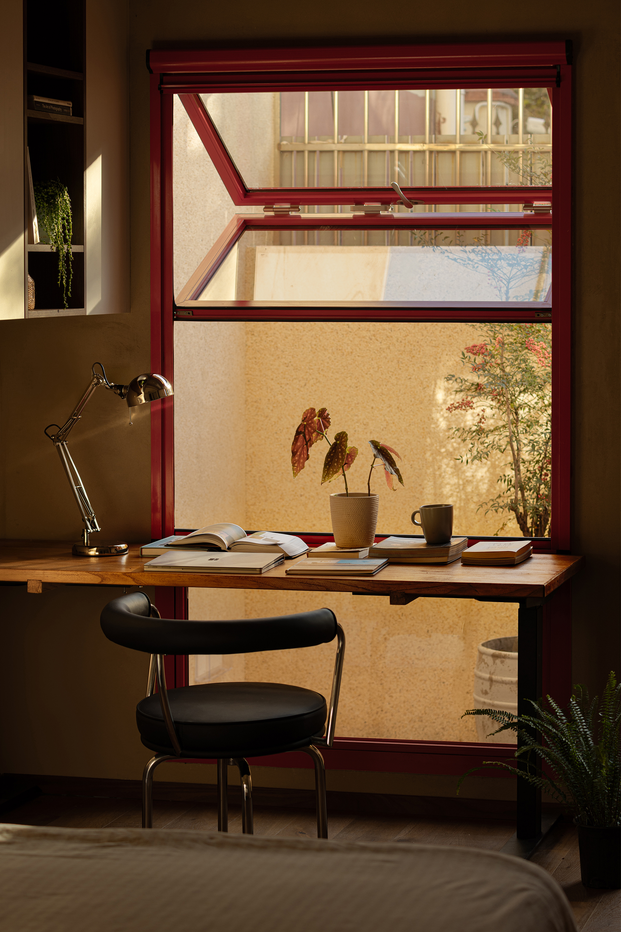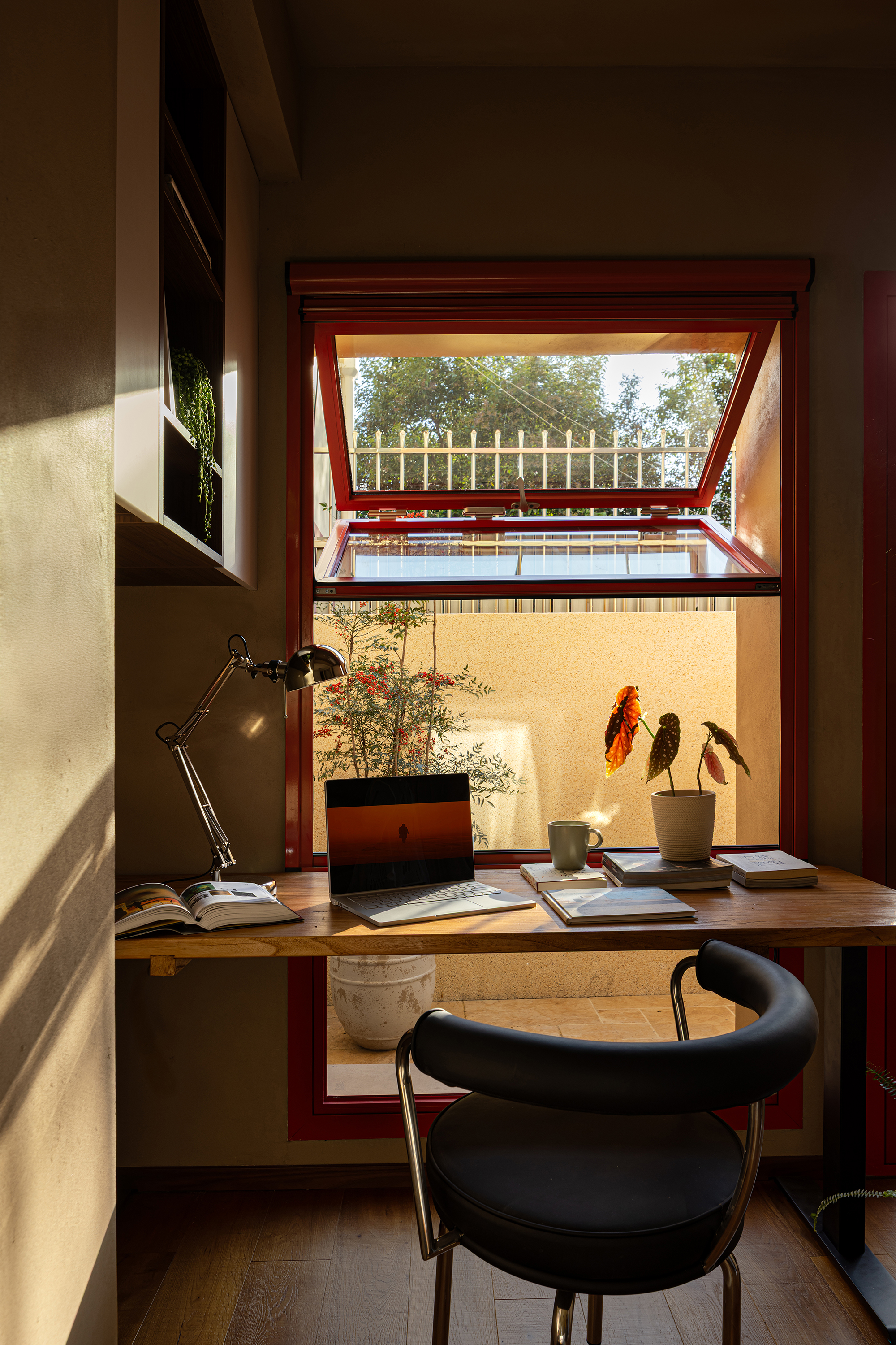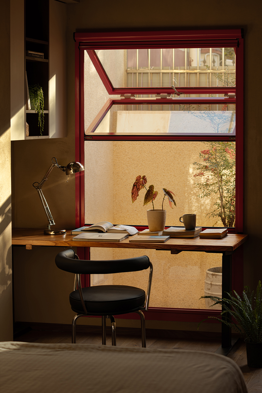 A desk is placed in the bedroom, breaking the barriers of traditional functional zoning. Between morning and evening, reading and resting can be seamlessly switched. The art paint on the wall presents a delicate texture, and as light and shadow flow, it resembles a plain silk, providing a serene background for thinking and sleeping. A french window that can be opened, outlined with a distinctive red frame. It serves as the "eye of the painting" of the space - framing the four seasons of the balcony while also emanating warmth indoors. Amidst the natural tones of limestone and raw wood, this splash of red stands out like a poet, adding a touch of human warmth to the natural ambiance. When the window is opened, wind and light pour in, truly integrating the space with nature.