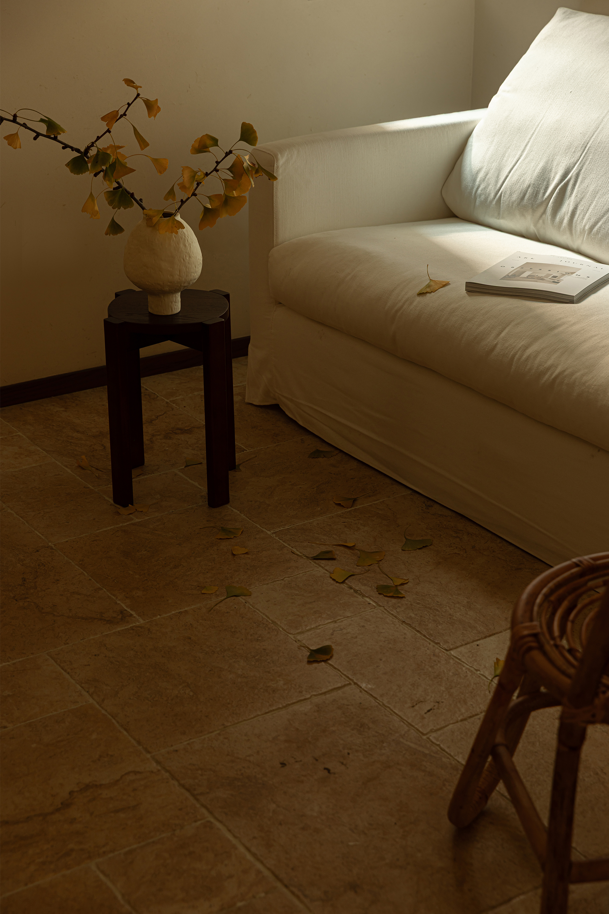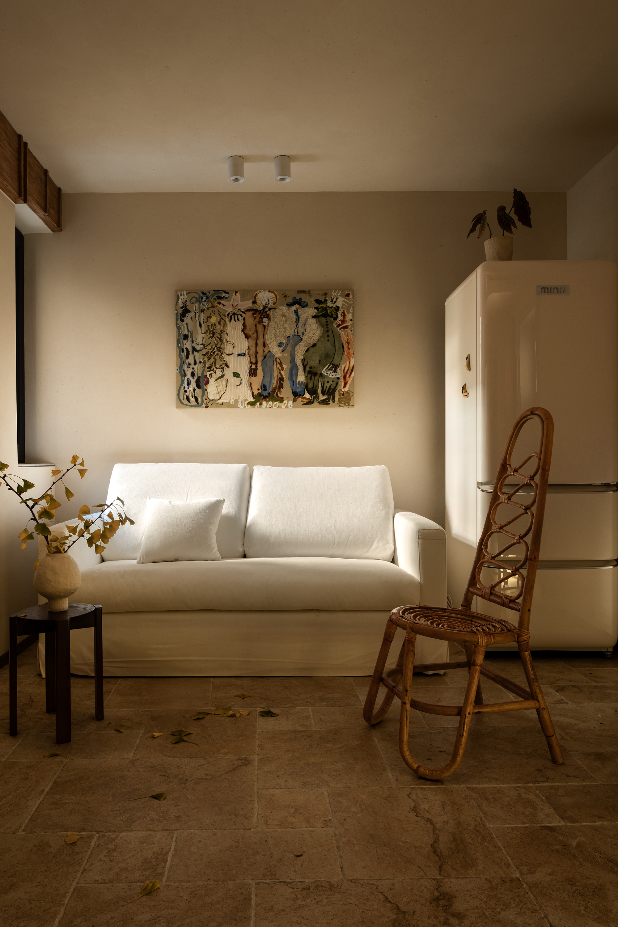 A corner of the room is deliberately left undefined, solely for "relaxation". Whether sitting on the floor, curling up to read, or simply daydreaming, surrounded by the warmth of natural wood and the rustic elegance of stone, this space serves as an island where the body and mind can find respite. Here, time can be wasted with a clear conscience. The delicate texture of art paint, the roughness of travertine, the firmness of stone, and the warmth of raw wood - these four materials each have their own unique beauty, yet resonate harmoniously in the space. The designer refrains from excessive embellishment, allowing the materials to meet in their natural states. Through contrast and integration, a texture and aura of "natural art" is created.