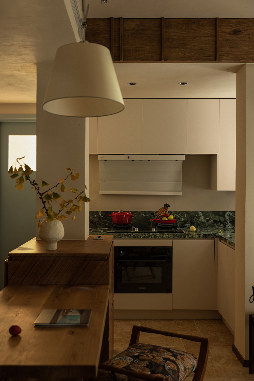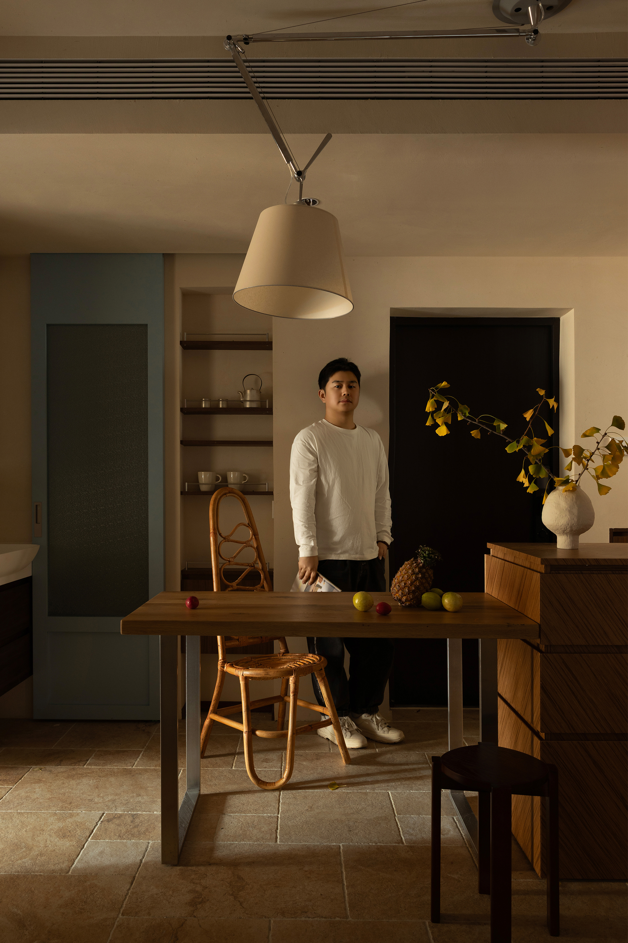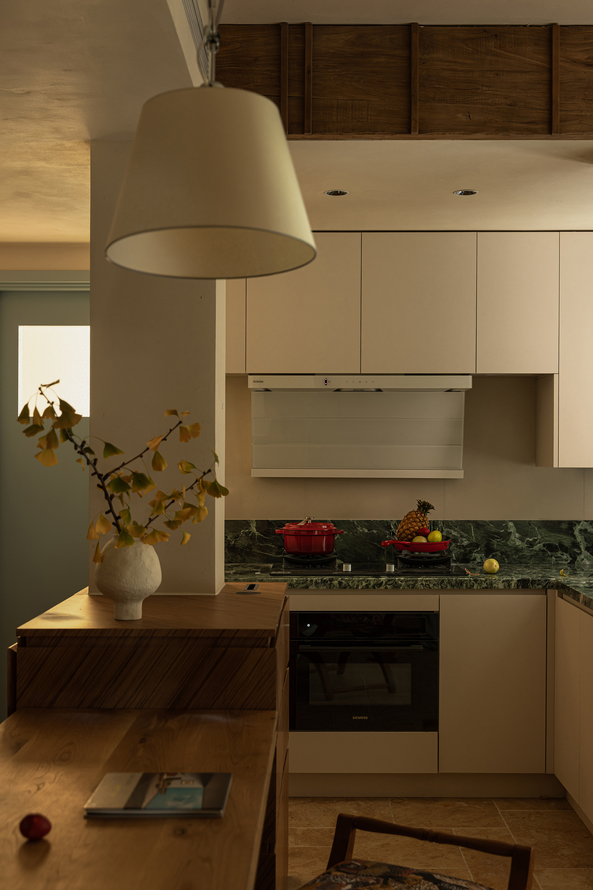 Between the living room and the dining room, a long wooden dining table naturally serves as a divider, which not only defines the boundaries but also allows for air circulation. The table boasts a clear texture and a warm touch, serving as a stage for meals throughout the day and night, as well as an extension for reading and working. On one side, the white sofa rests like a cloud, gently colliding with the warm tones of natural wood. Set against the limestone floor, it exudes relaxation and inclusiveness. The kitchen is open, allowing the smoke and warmth of cooking to mingle freely with the chatter and laughter of life. The space is no longer an isolated room, but a flowing, shared daily space. Here, boundaries are softened, and life flows continuously.