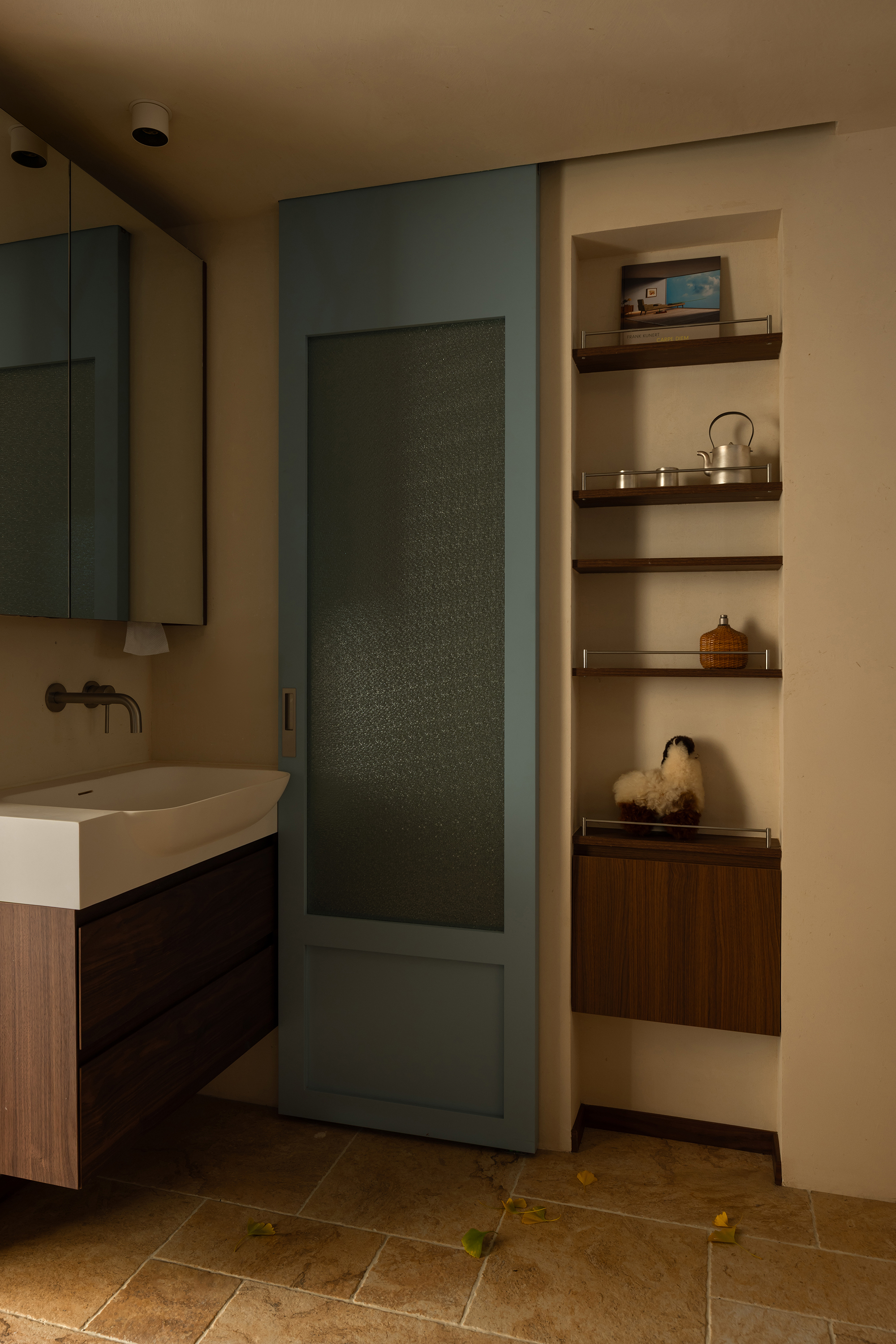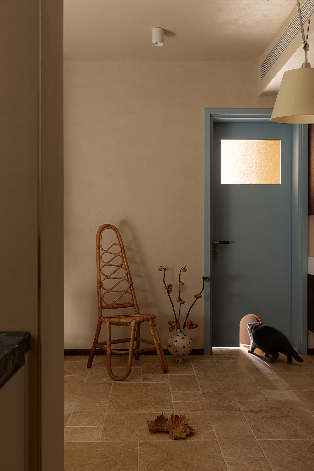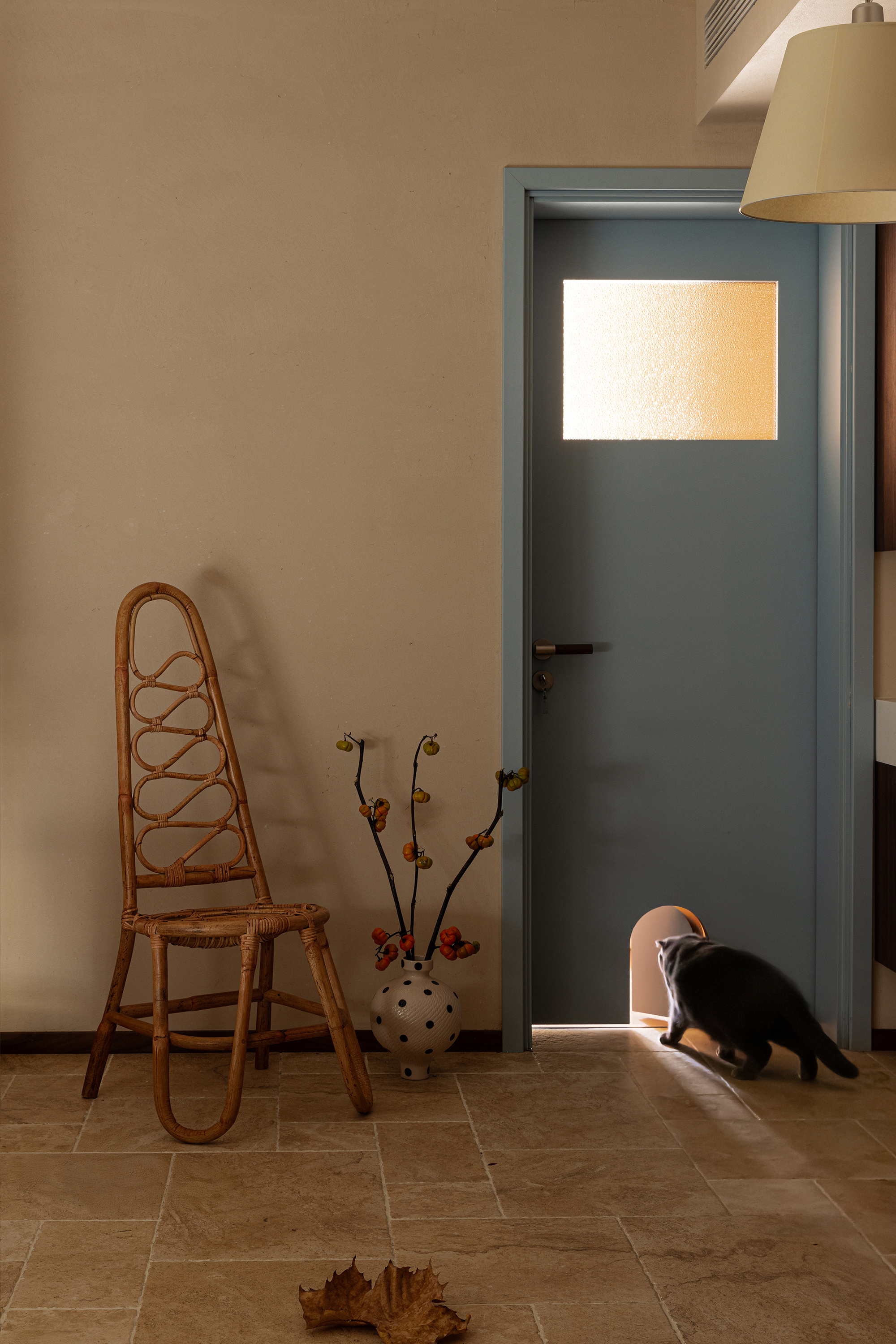 All doors are chosen in Autumn Wave Blue - a color that embodies restraint and serenity. It is the lingering charm of seawater and the breath of mountain rocks, connecting various spaces and forming a unique visual identity. Every time a door is pushed, it marks a shift in mood, from public to private, from activity to stillness, with the gentle hue of cyan serving as a subtle reminder of boundaries. The exclusive door opening reserved for the kitten beneath the door leaf is the most gentle footnote in the design. It is not just a functional detail, but also a silent promise between the owner and the furry child: this home belongs to every inhabitant. The curvature and material details of the opening are also carefully considered, revealing a big meaning in the small.