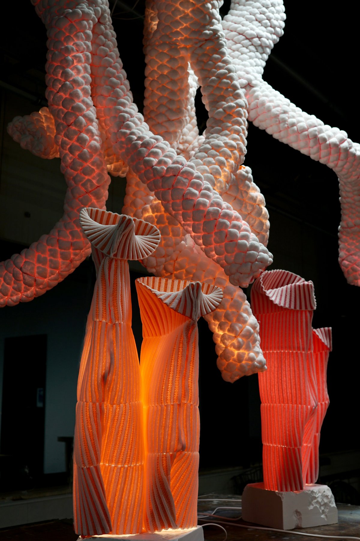 Thiscoral reef knitting project is based on combining yarns that respond to light in differentways. The great beauty of textiles is in the many atmospheres, shapes, colors, harmonies,and effects that can be created through these unexpected yarn combinations togetherinteracting with light. Sangmin Oh hopes that‘Knitted Light’not only presents thephenomenal beauty oflight through objects composed of textile materials, but also enlightens a new reflection of thebeauty of our nature.