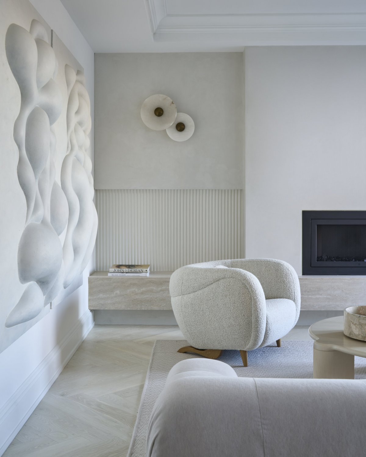 Sculptural texture layers of decorative accessories give detail and sparkle to this simple toned home while the bedroom has a rich palette compared to the rest of the space.