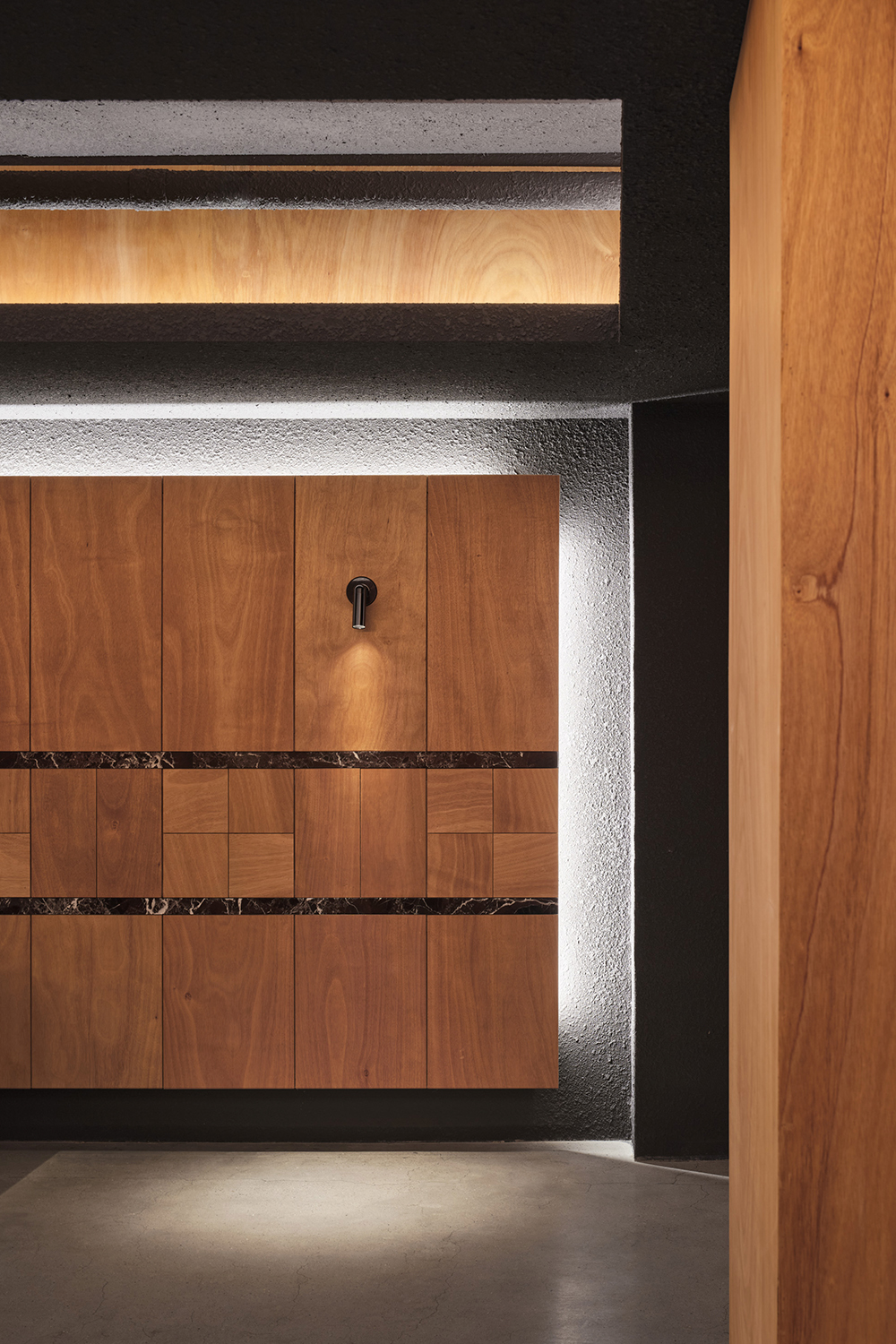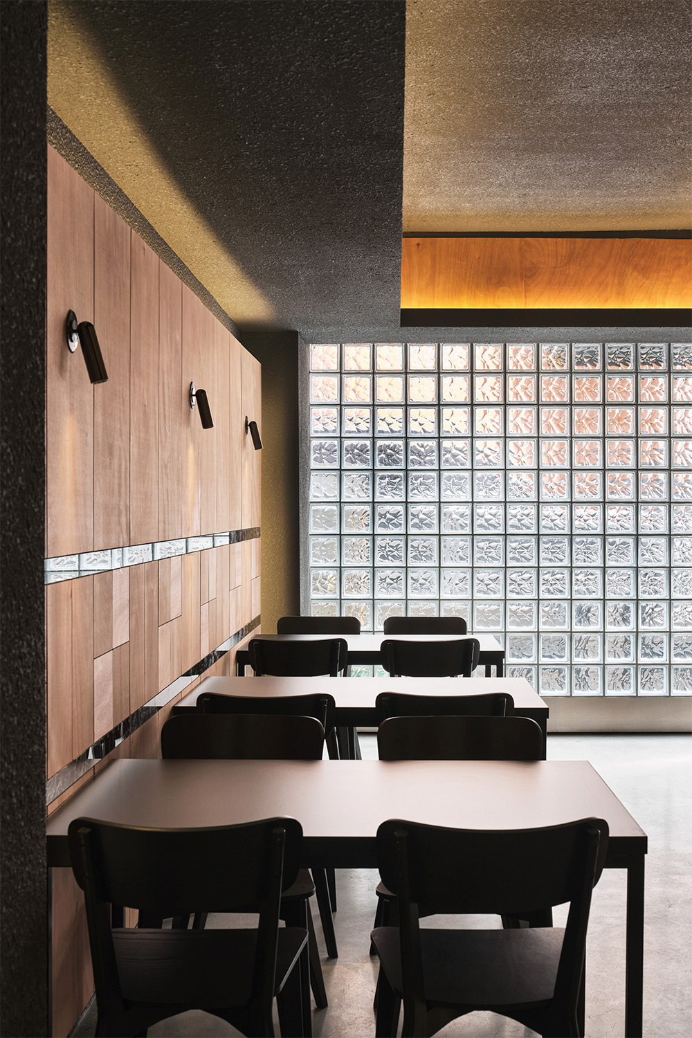 Visually, the design harmonizes sculptural wooden accents with marble and incorporates glass blocks on the facade for added depth.