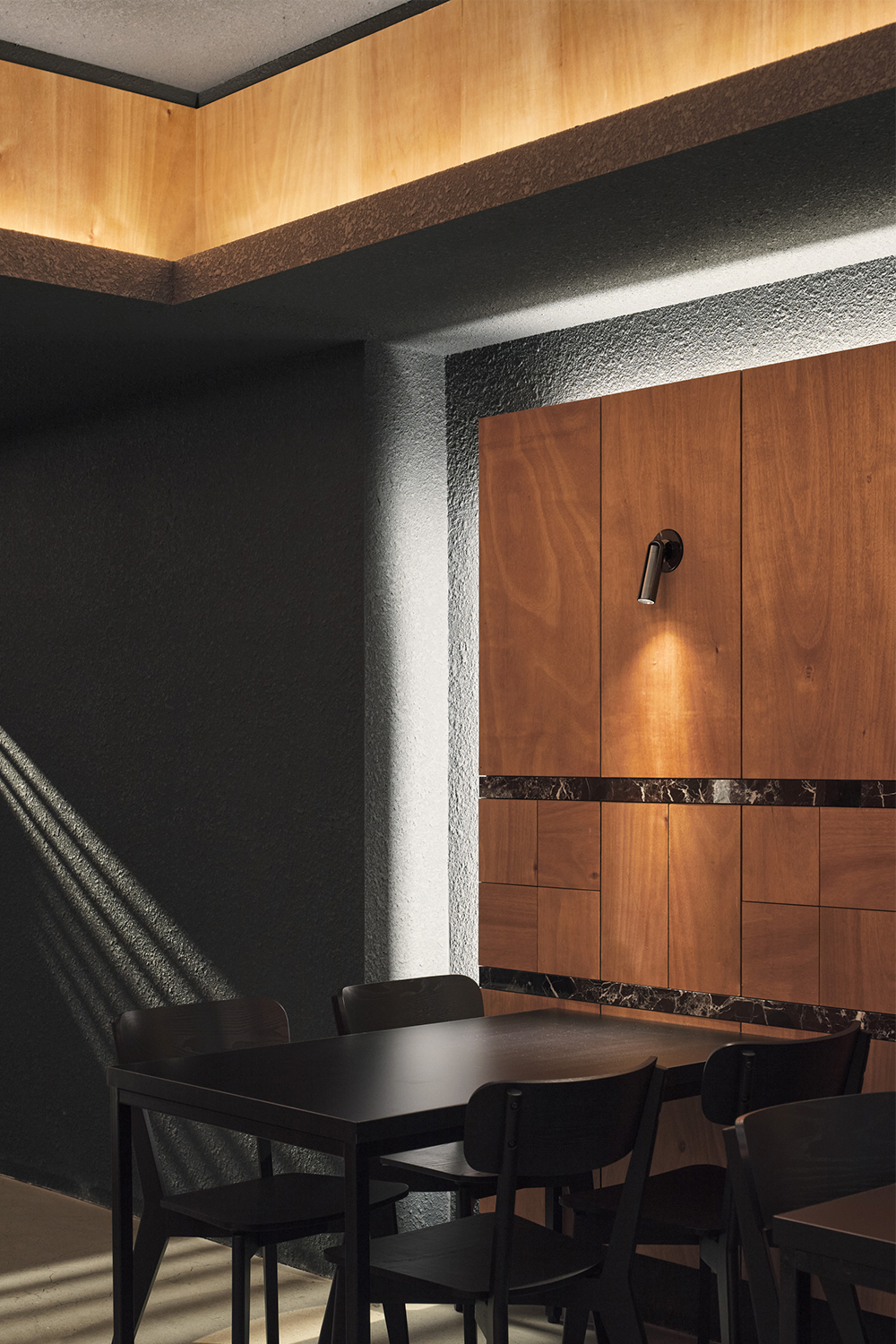 The overall ambiance features a gray-toned mood with accent elements of wood and deep wine-colored marble.Lighting is achieved solely through indirect illumination, removing unnecessary fixtures from the ceiling and creating a more minimalistic spatial composition.