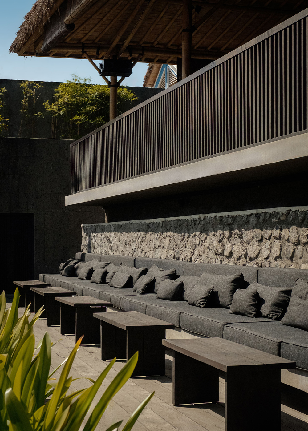 Materiality plays a central role in grounding the architecture within its context. Locally harvested yellow bamboo forms the primary structural and visual identity, expressing natural elegance and sustainability. Paired with dark-stained wood and textured volcanic stone, the palette invites a tactile experience that resonates with the elements of Uluwatu: sun, wind, and sea. These materials age with grace, creating a living architecture that evolves over time.