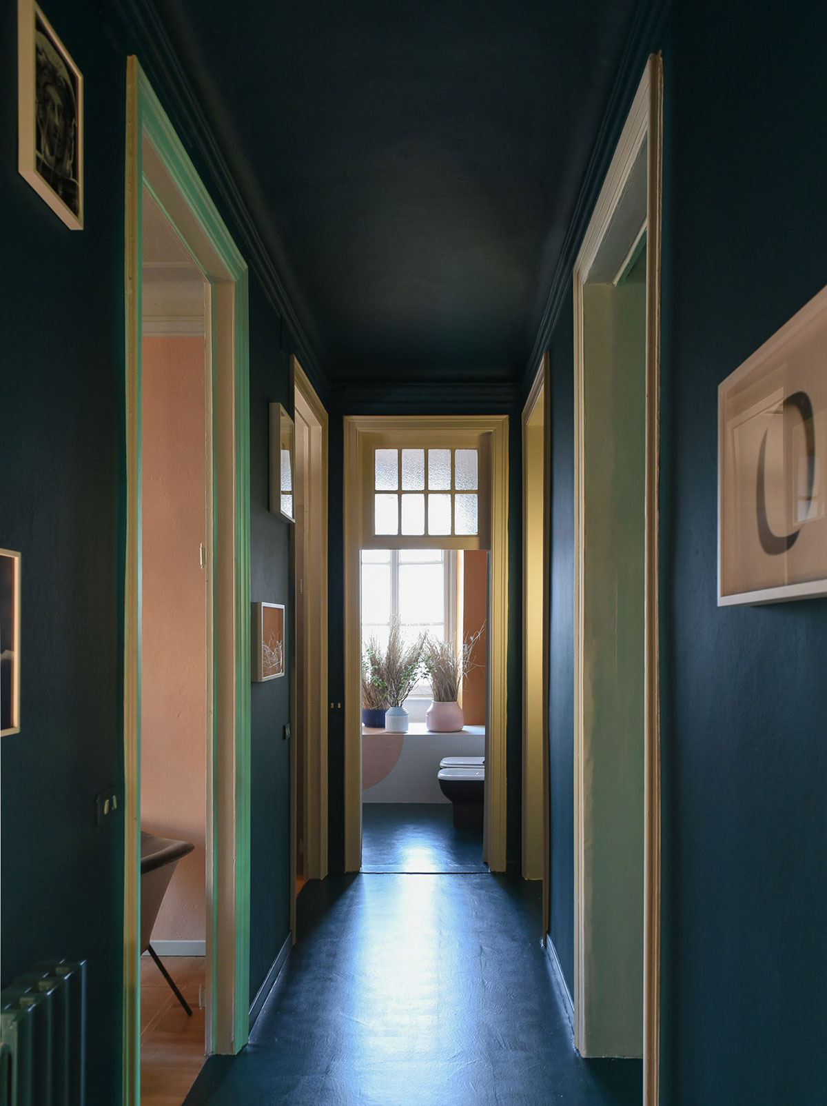 The project is in a flat in Milan that dates to the early 1800’s: a succession of rooms with broad windows, stucco, and herringbone parquet. Although we respected the original floorplan, we did not want to be overly limited by it. Several spaces were redesigned through the use of curtains placed scenically between one room and another. The doors and windows have been incorporated into the broad design of a wall drawing, one of the characteristic elements of the project: the rooms interconnect in a continuous play of chromatic and patterned echoes.