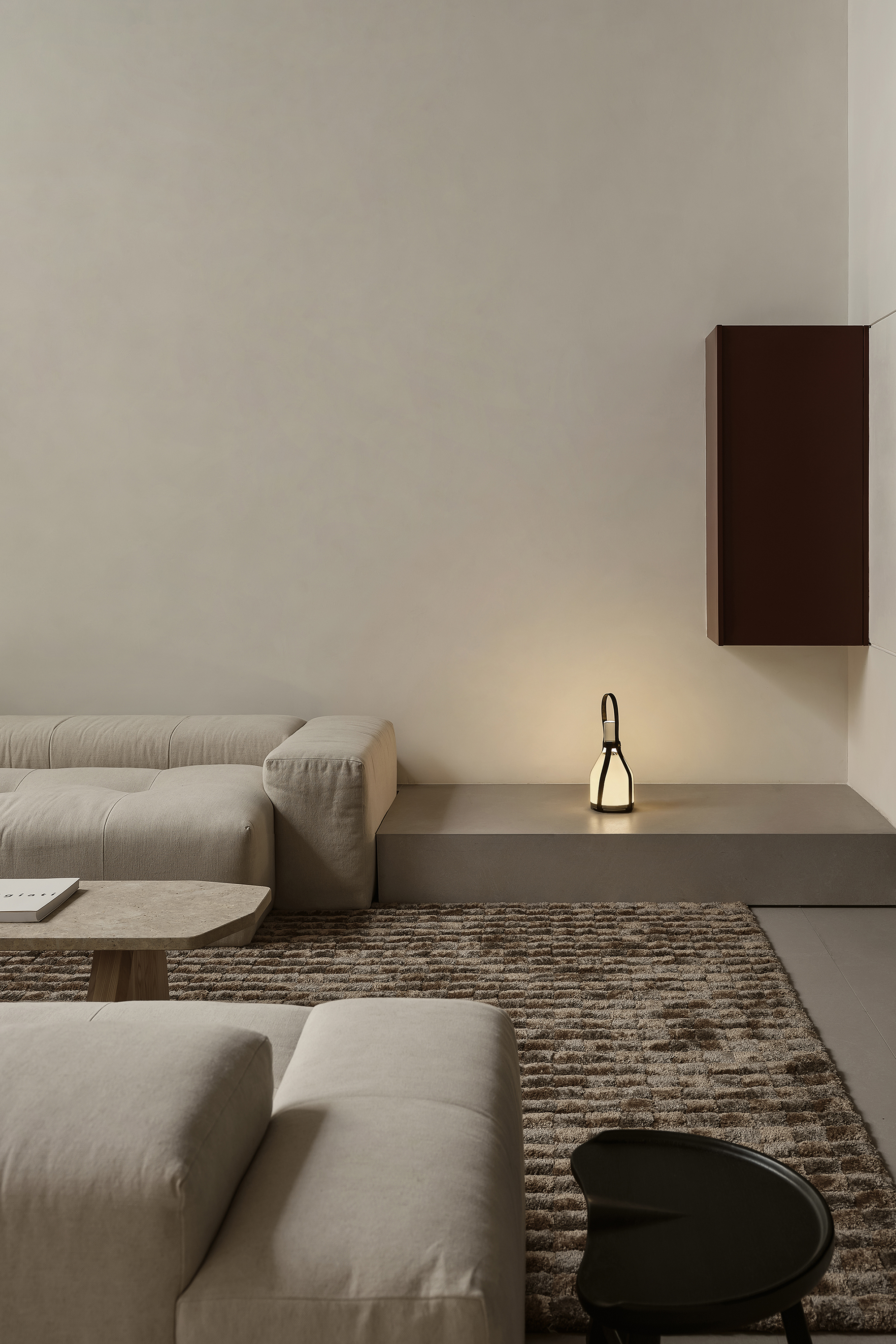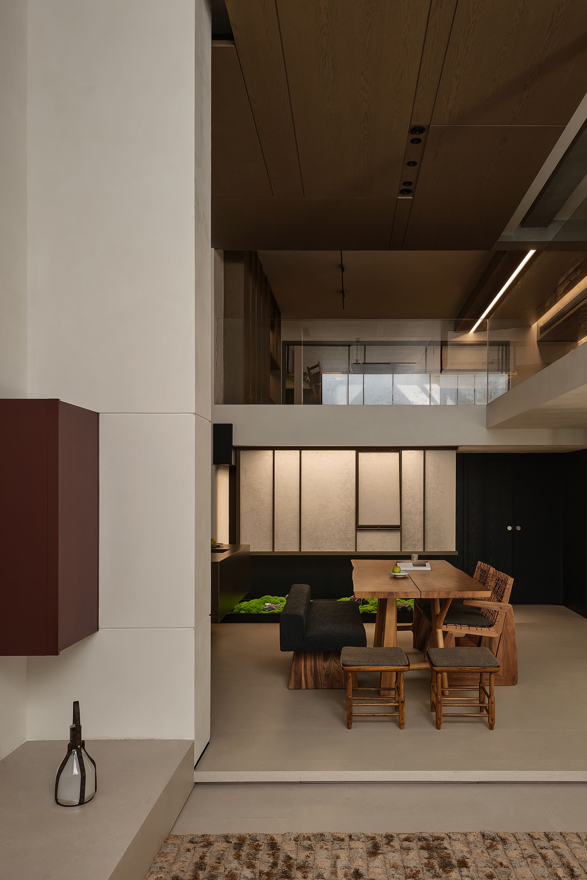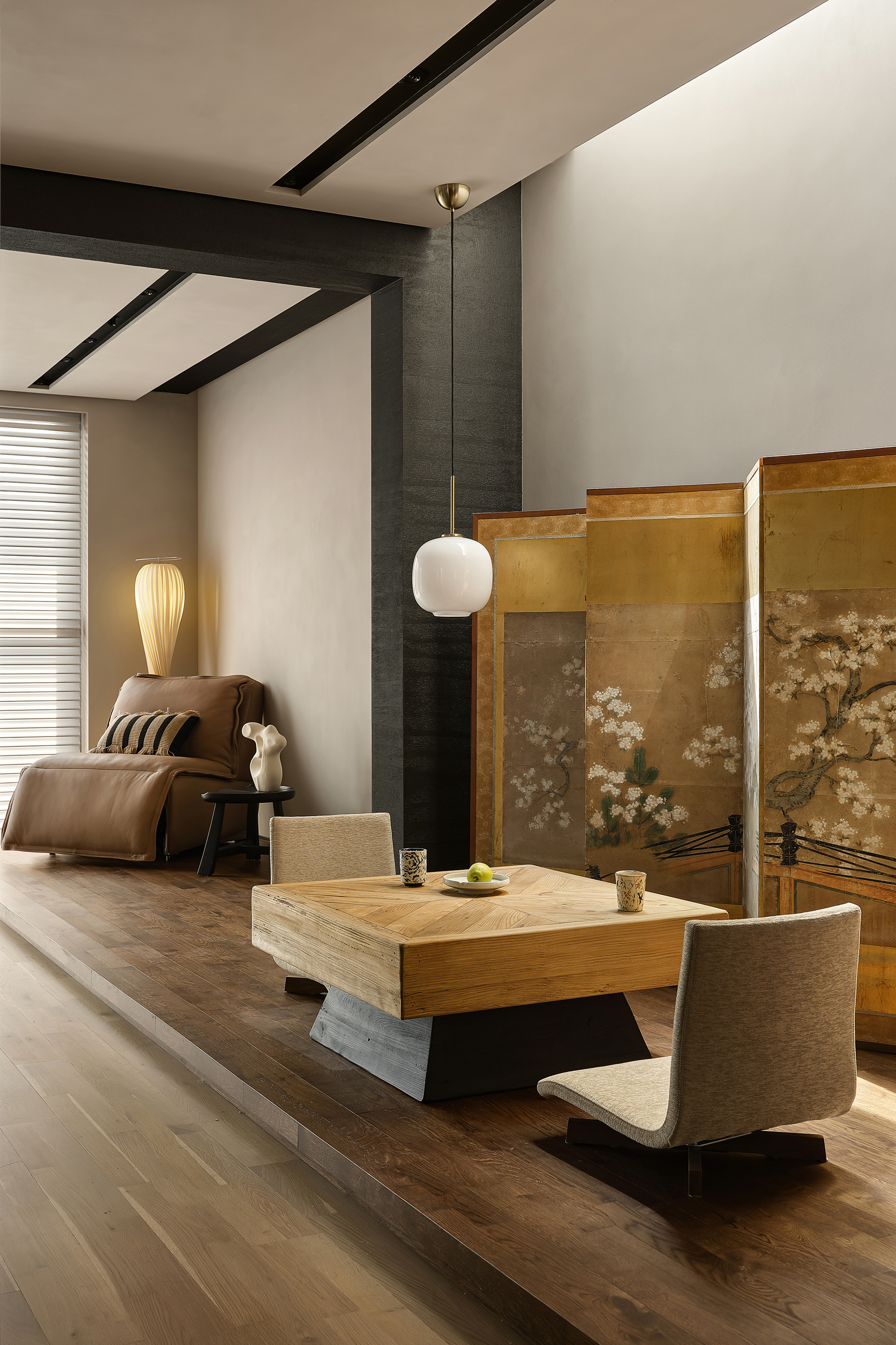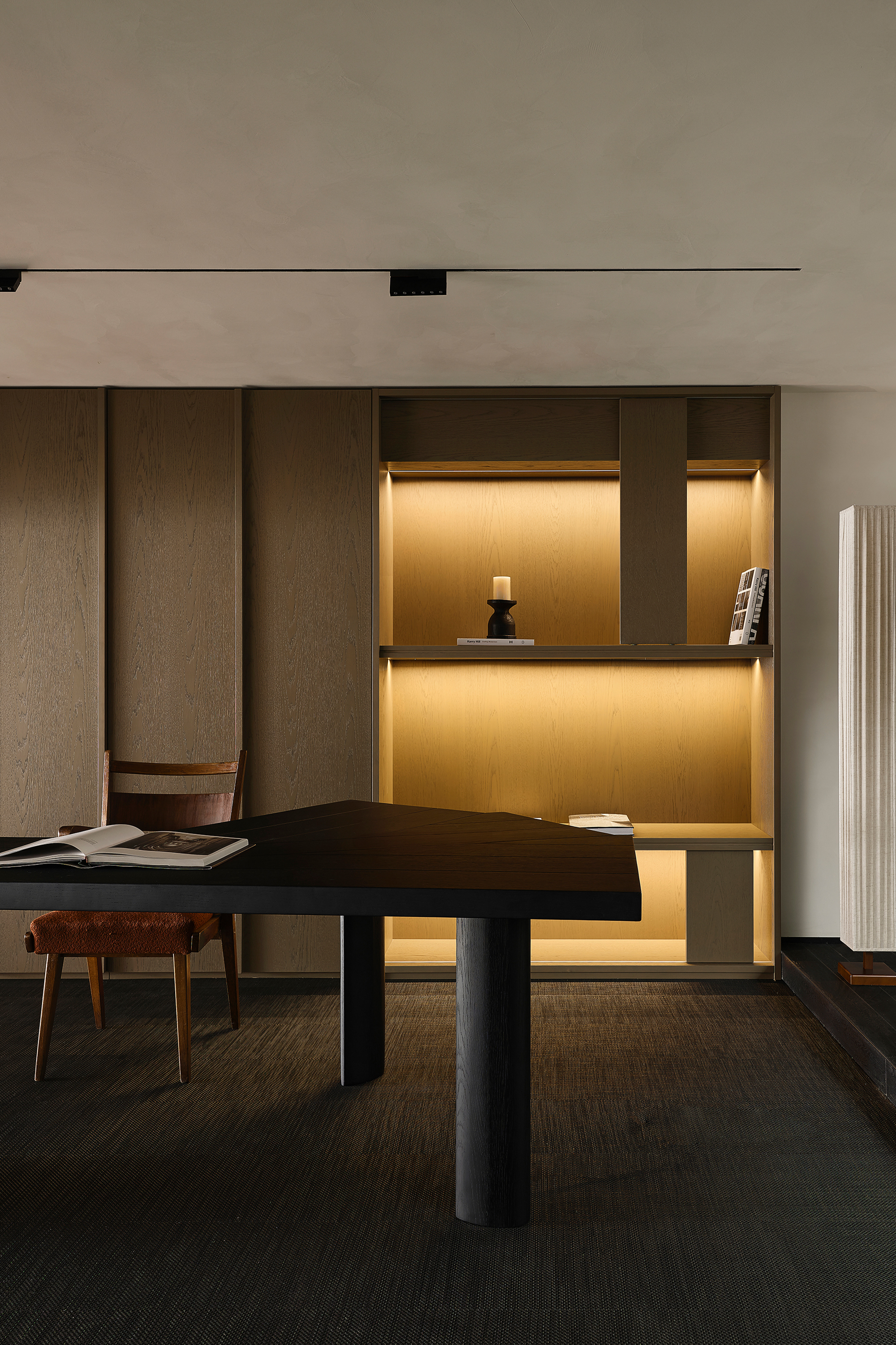 In handling the basement space, we retained its 4.7-meter ceiling height and added a mezzanine covering only one-third of the area. The design aims for the light from the south-facing light well to illuminate the entire basement and mezzanine to the greatest extent possible. The mezzanine design cleverly utilizes the vertical height to create a semi-open reading or working area. At the same time, the glass railing preserves a transparent visual corridor below, allowing light and sightlines to penetrate the space and creating an interwoven vertical layering. Beneath the mezzanine, modular sofas enclose a sunken, multifunctional lounge area. Together with the wooden tea table on the side, they create a serene tea corner, establishing an intimate sense of scale. The red tea cabinet is built into the wall, and combined with the warm lighting strips, it creates a calm and serene atmosphere. Living here is no longer just an accumulation of functions; it is a serene narrative woven from light, shadow, materials, and memories. Day after day, it settles into the deepest, most genuine warmth of the home. The home thus becomes no longer a mere container, but a living entity that grows alongside the passage of time, silently witnessing the beauty of everyday life.