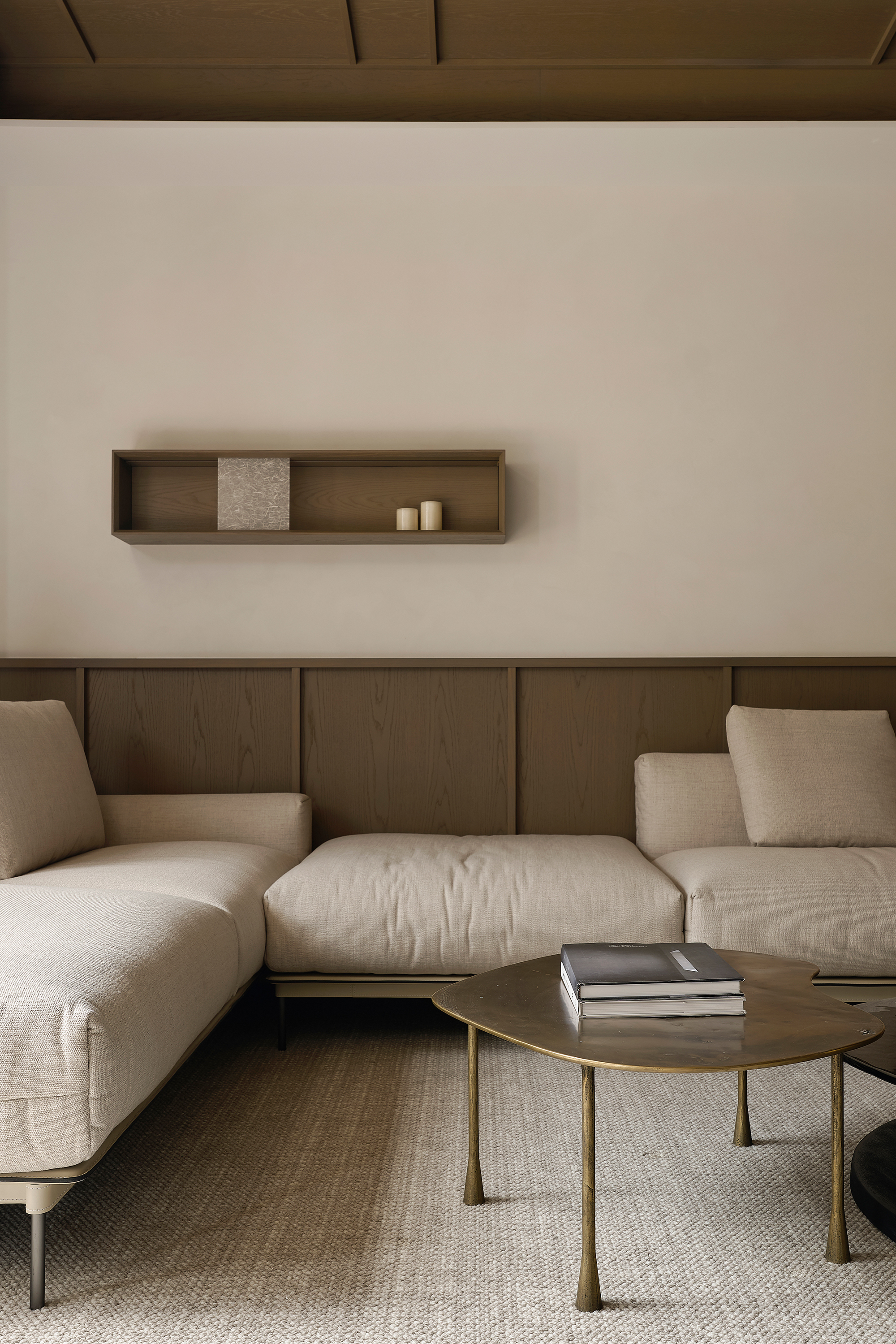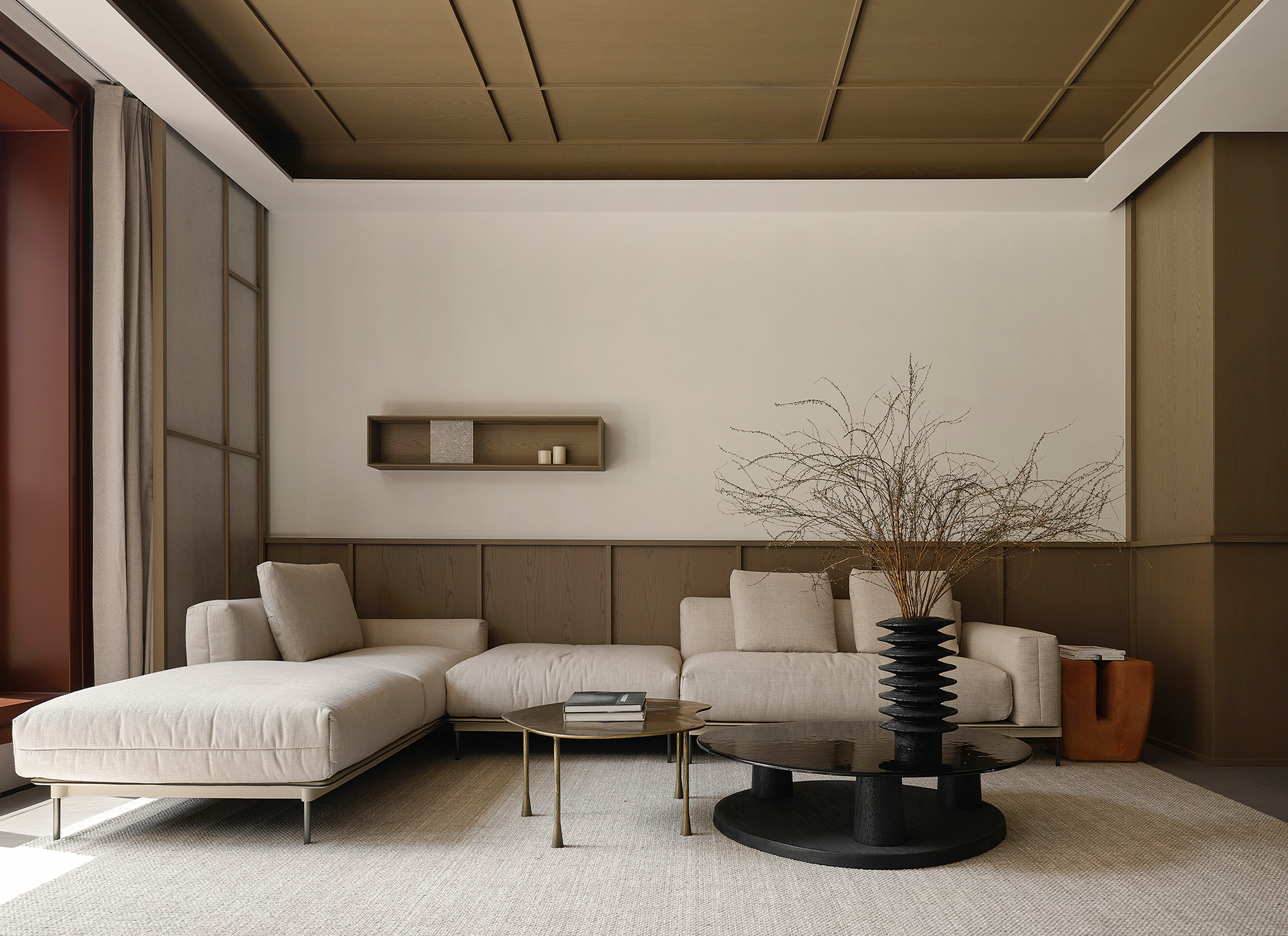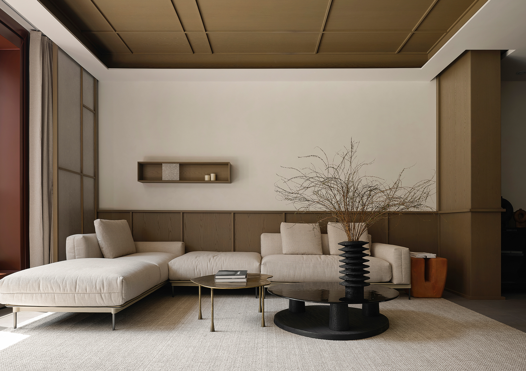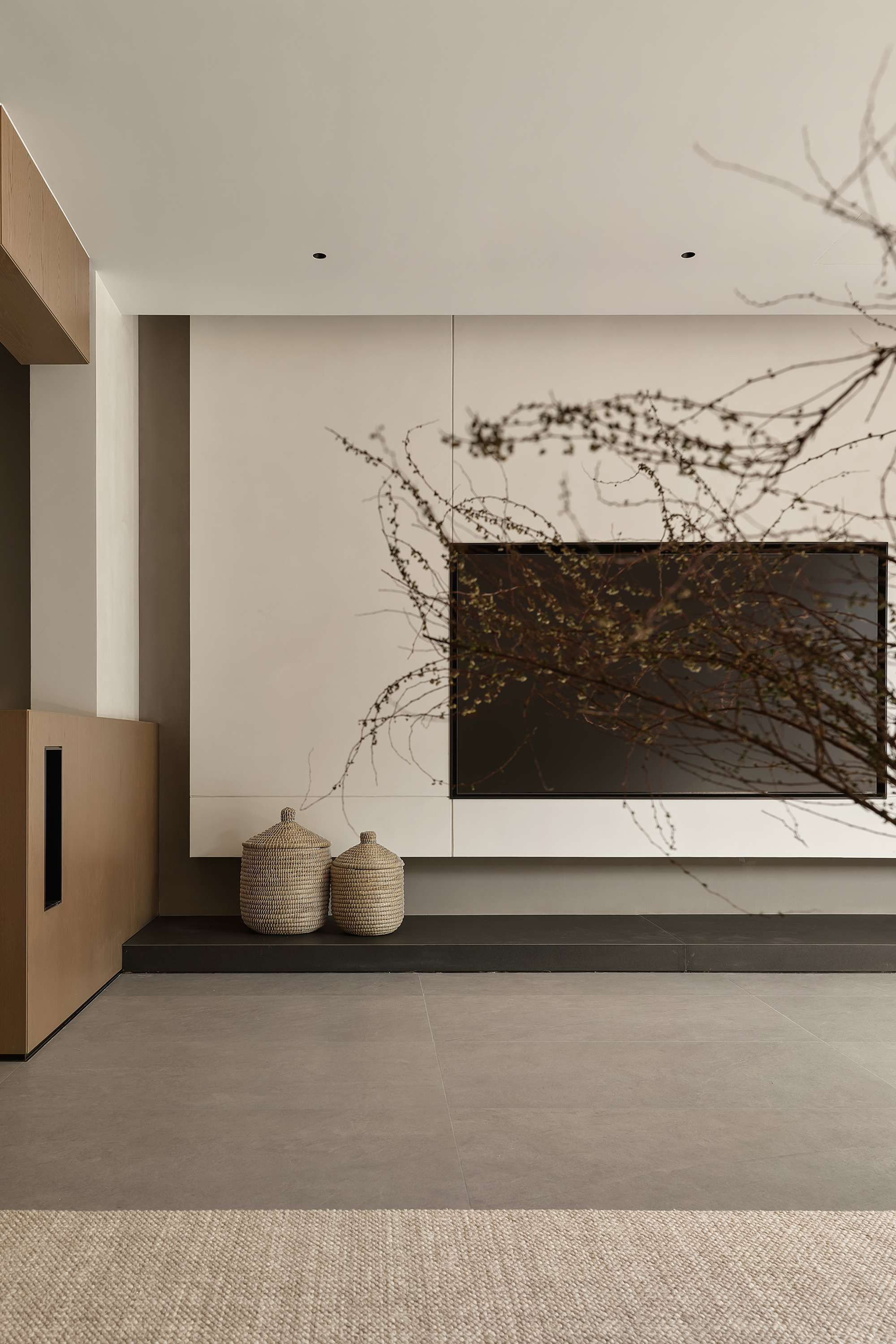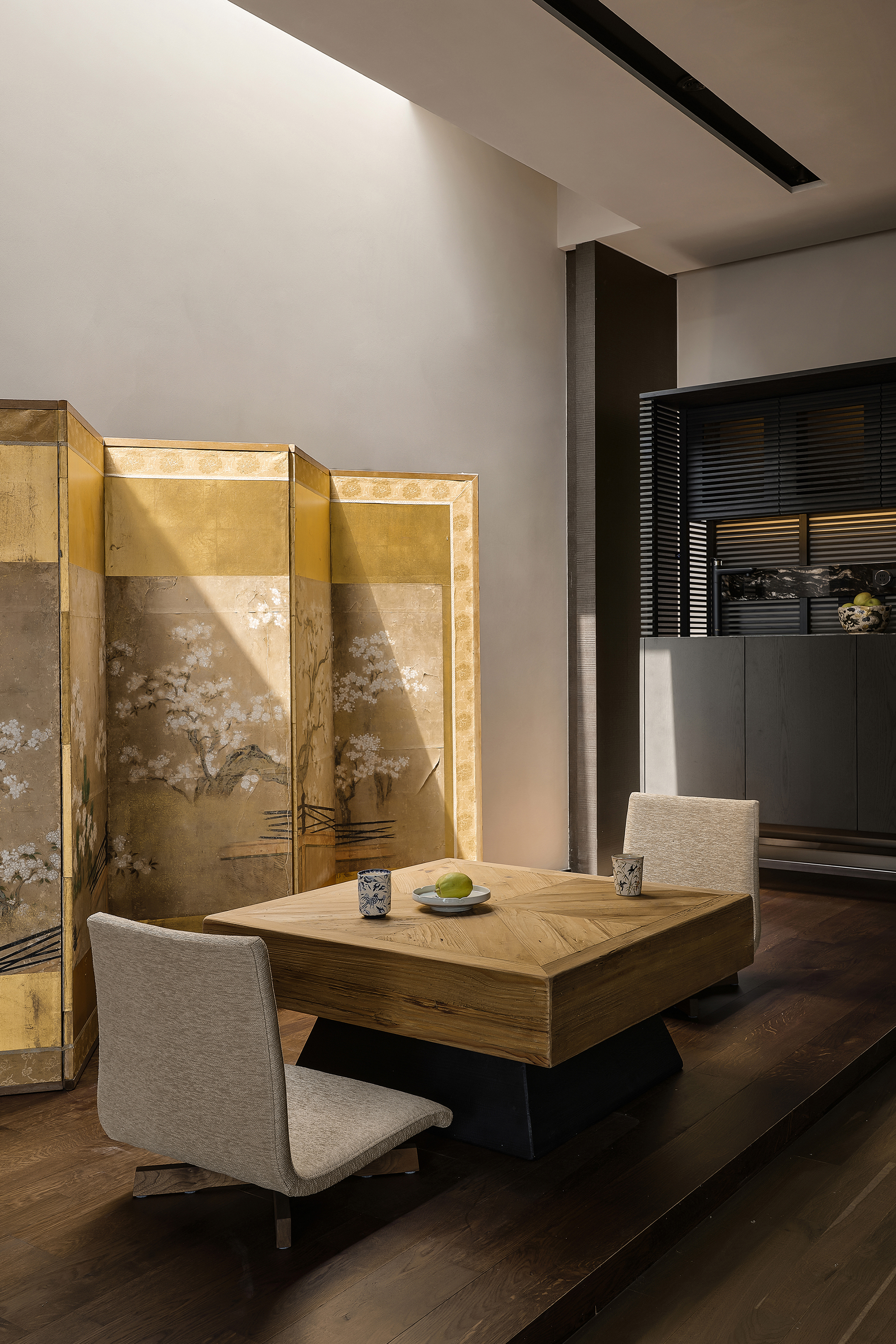 In handling the basement space, we retained its 4.7-meter ceiling height and added a mezzanine covering only one-third of the area. The design aims for the light from the south-facing light well to illuminate the entire basement and mezzanine to the greatest extent possible. The mezzanine design cleverly utilizes the vertical height to create a semi-open reading or working area. At the same time, the glass railing preserves a transparent visual corridor below, allowing light and sightlines to penetrate the space and creating an interwoven vertical layering. Beneath the mezzanine, modular sofas enclose a sunken, multifunctional lounge area. Together with the wooden tea table on the side, they create a serene tea corner, establishing an intimate sense of scale. The red tea cabinet is built into the wall, and combined with the warm lighting strips, it creates a calm and serene atmosphere. Living here is no longer just an accumulation of functions; it is a serene narrative woven from light, shadow, materials, and memories. Day after day, it settles into the deepest, most genuine warmth of the home. The home thus becomes no longer a mere container, but a living entity that grows alongside the passage of time, silently witnessing the beauty of everyday life.