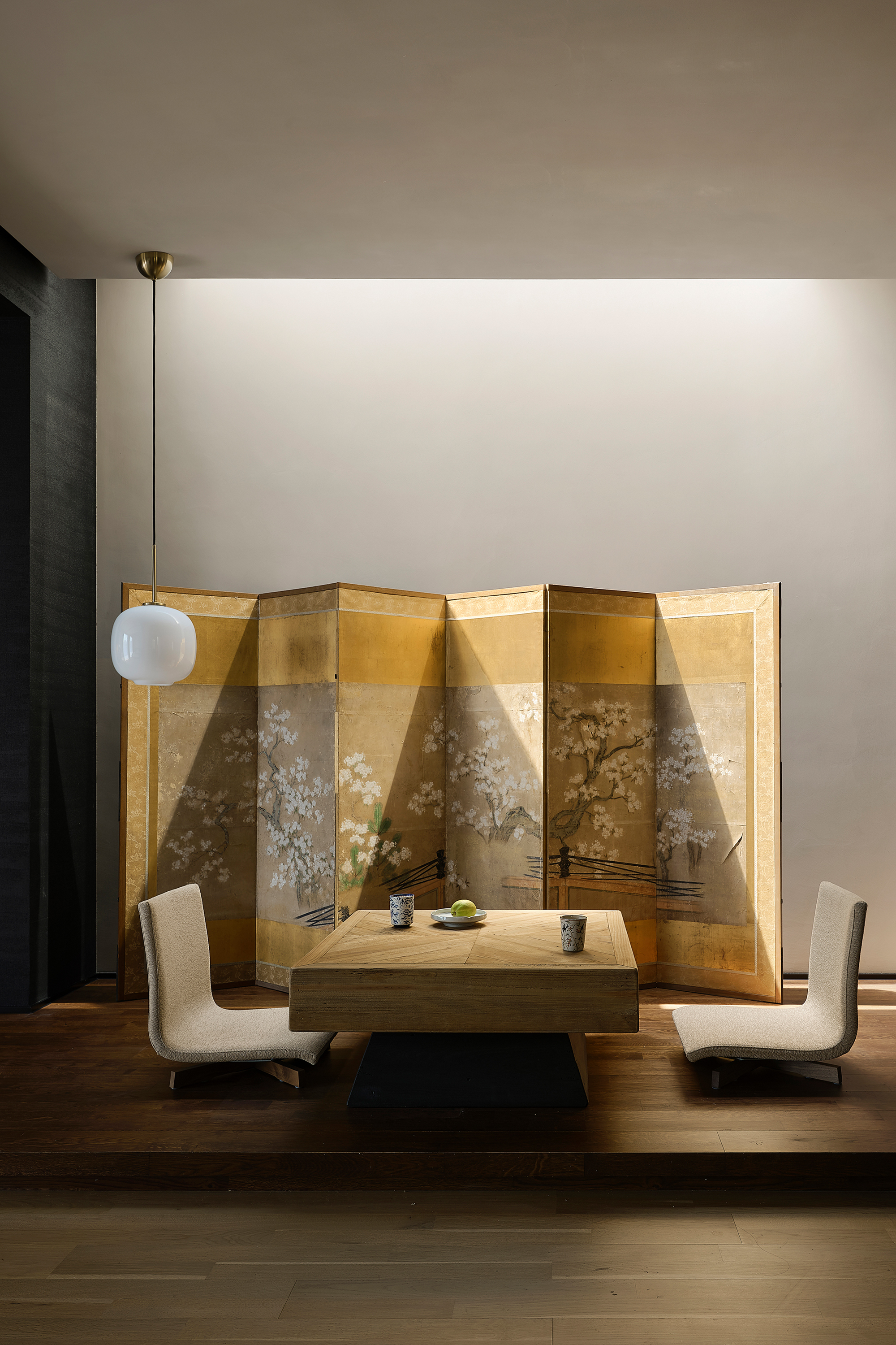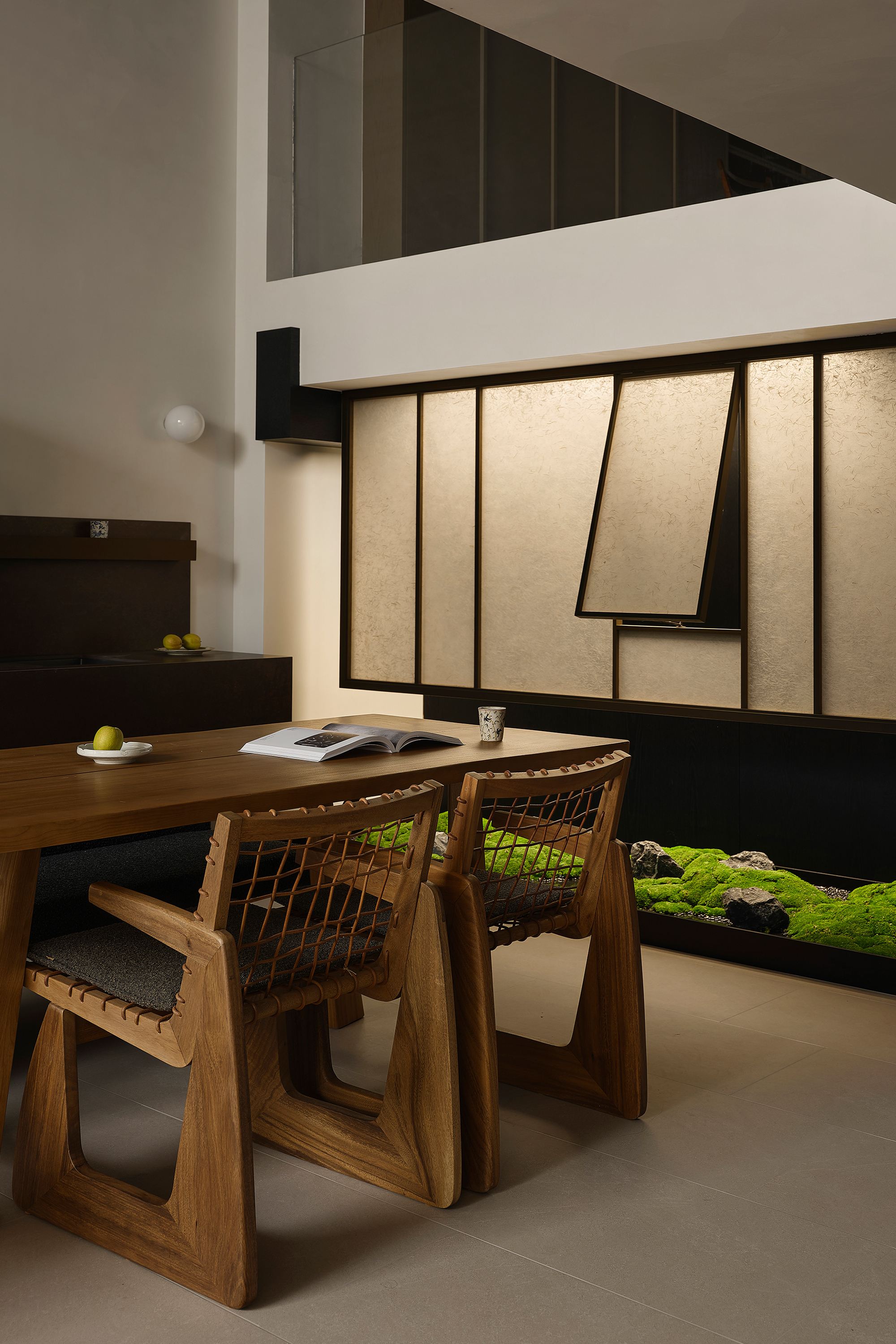The third floor functions as a complete suite, emphasizing a sense of ritual in daily life right from the entrance. During the structural renovation, the floor above the tatami area was deliberately opened, allowing light to leave traces of time on the walls every afternoon. Large expanses of paint are no longer cold gray or white; instead, they become the textured surface through which the walls seem to breathe. Texture extends along the play of light and shadow, gradually unfolding within the rustic screens, subtly revealing the layers of the space.