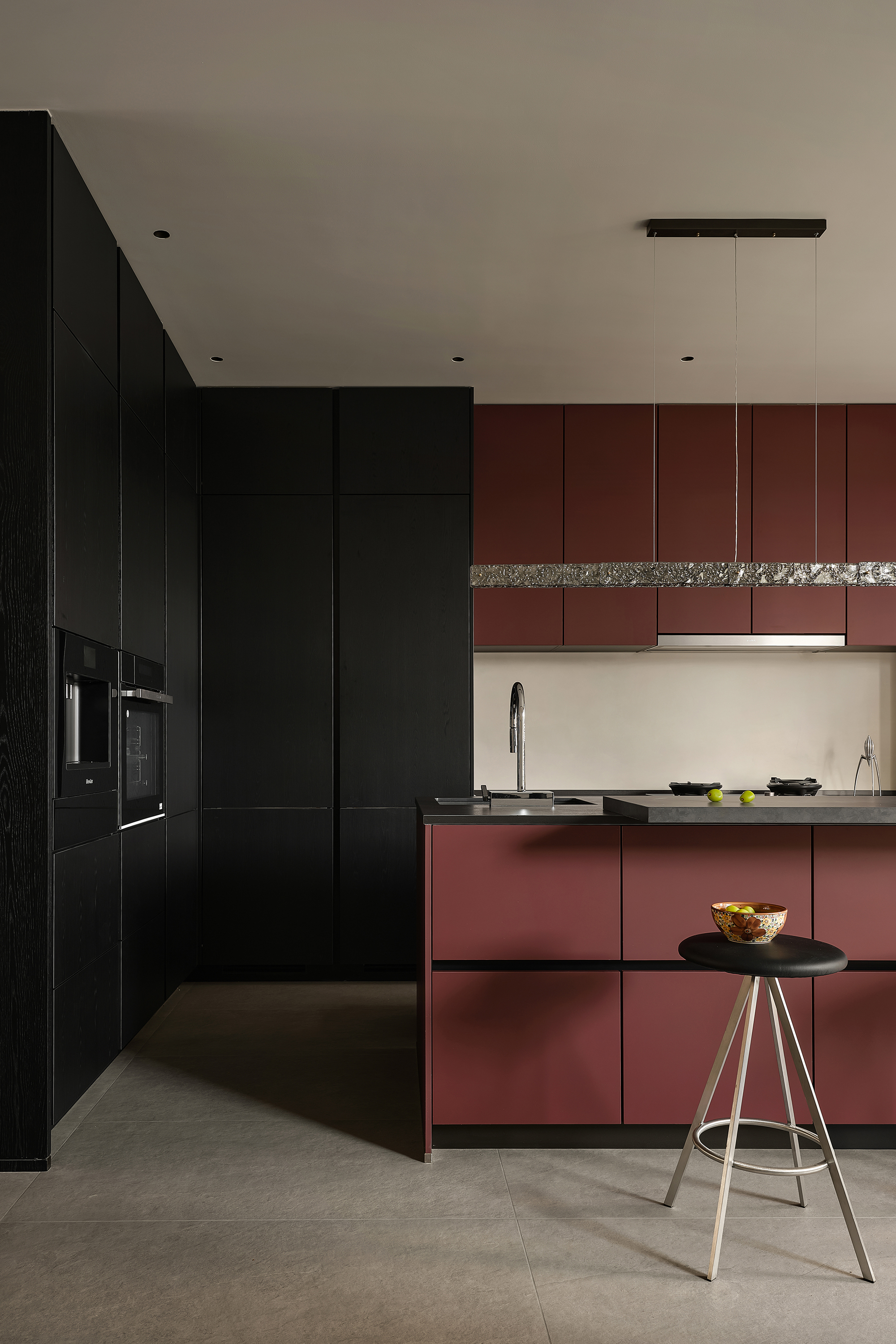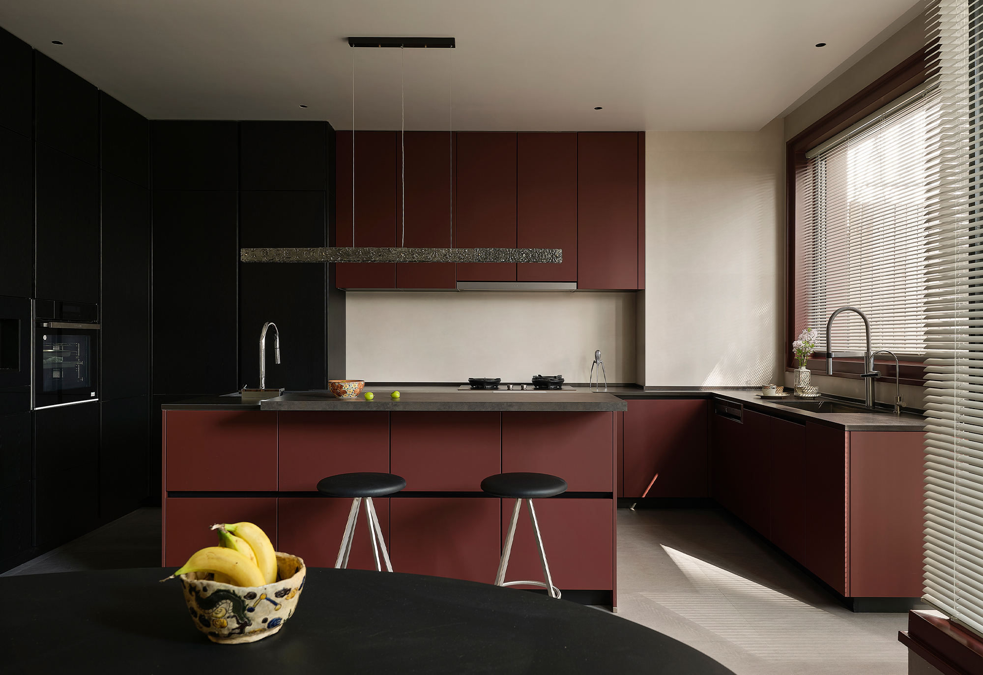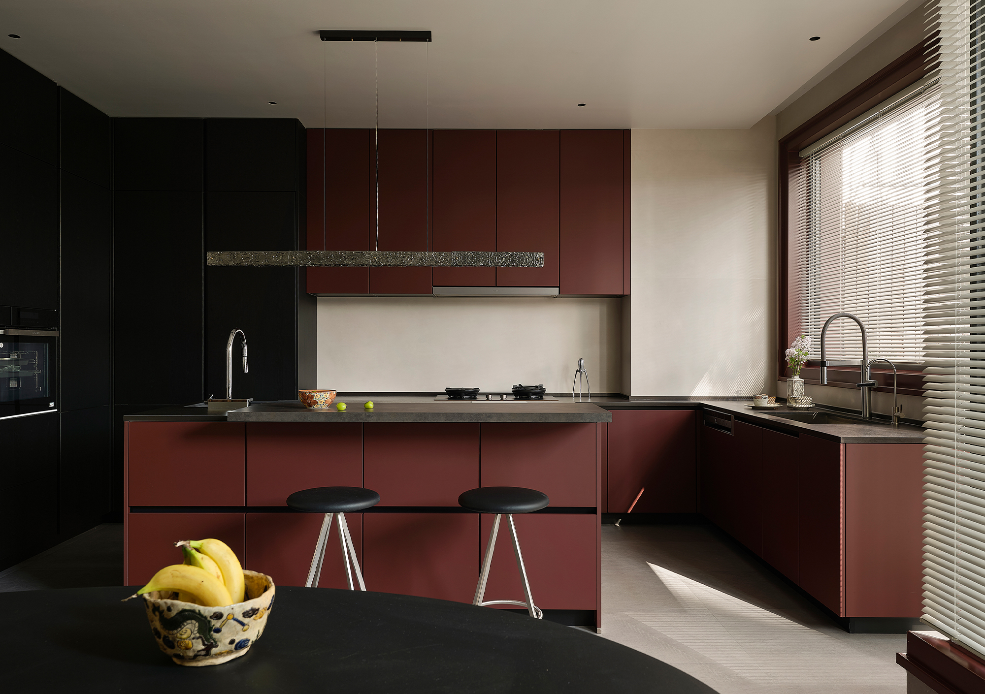 The red and black cabinetry contrasts with the metallic pendant lights, creating a dynamic interplay of warm and cool tones that adds visual tension to the space. The cabinet handles are concealed within precisely crafted seams, offering a smooth, unobstructed touch—each detail reflecting an exquisite pursuit of craftsmanship. The island countertop is made of dark stone, exuding a calm, grounded texture that contrasts with the linear lighting embedded beneath the island. Here, functionality and aesthetics achieve a subtle balance. All built-in appliances in the tall cabinet area feature flush-panel designs, maintaining a seamless and unified façade while completely concealing clutter. A perfectly proportioned circulation path is left between the island and the dining table, allowing daily movement and gatherings with friends and family to coexist without interference. Every utensil in the kitchen is carefully selected to harmonize with the overall color scheme.