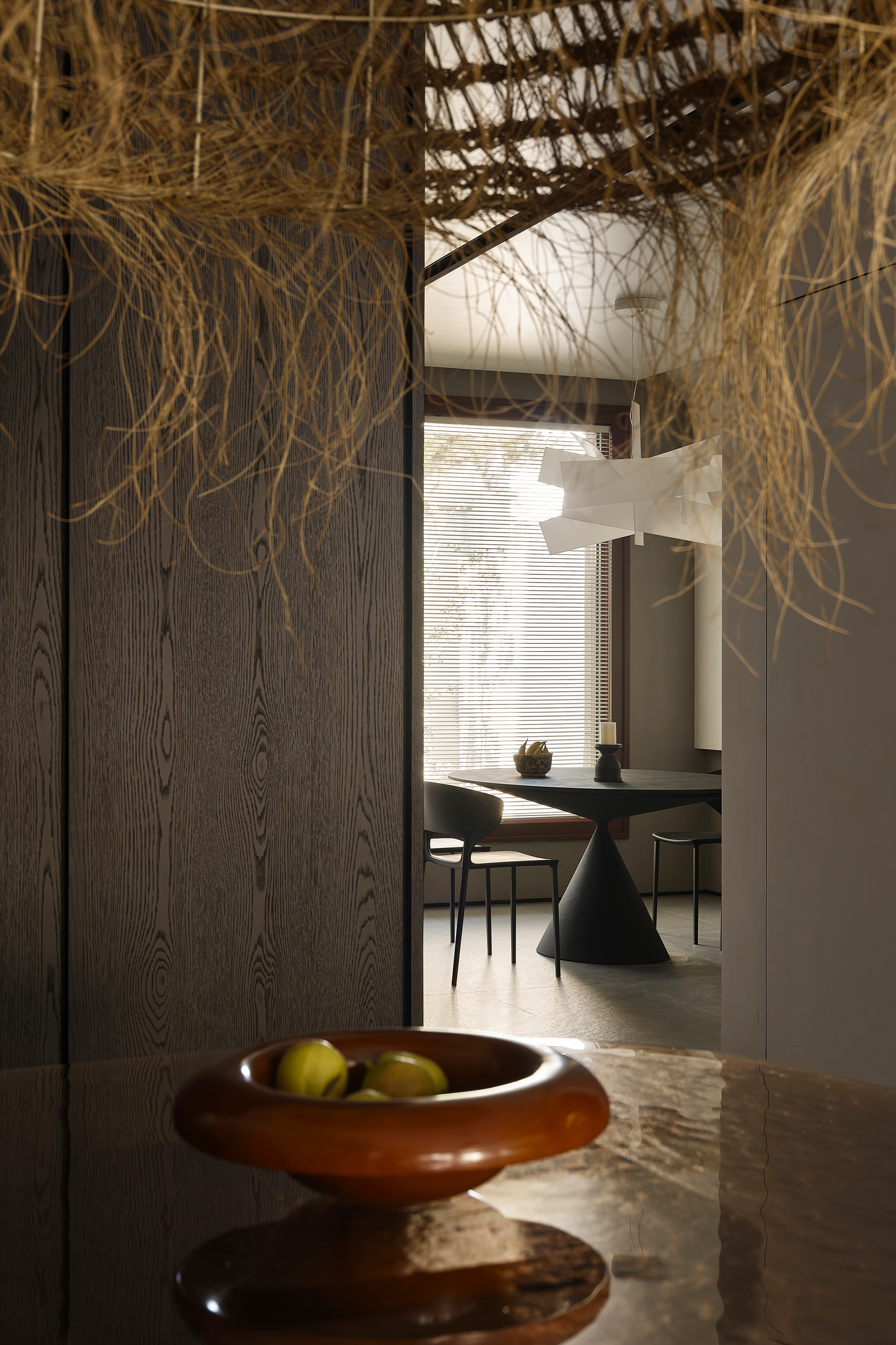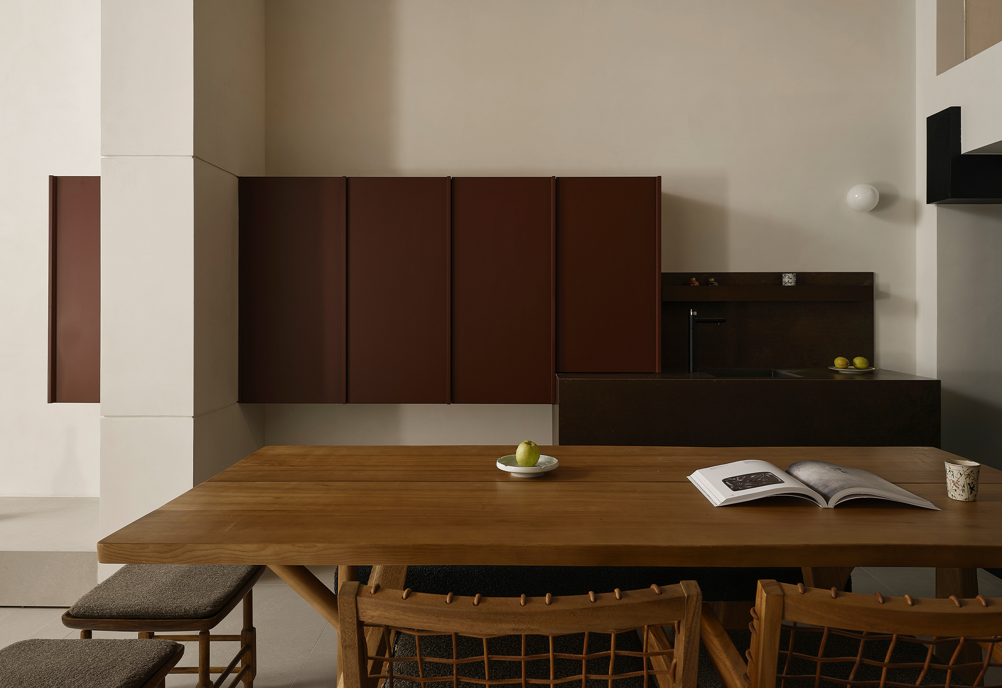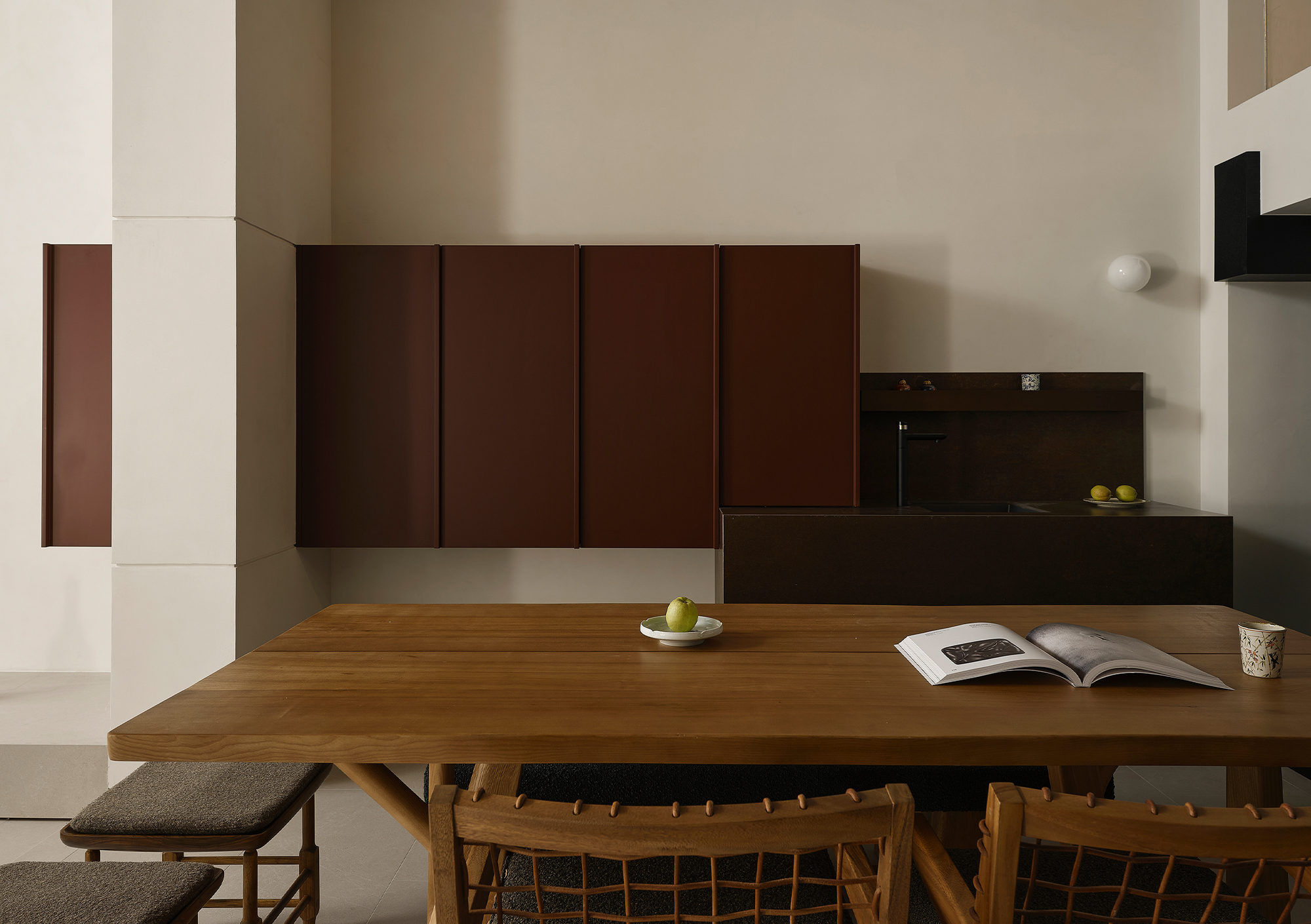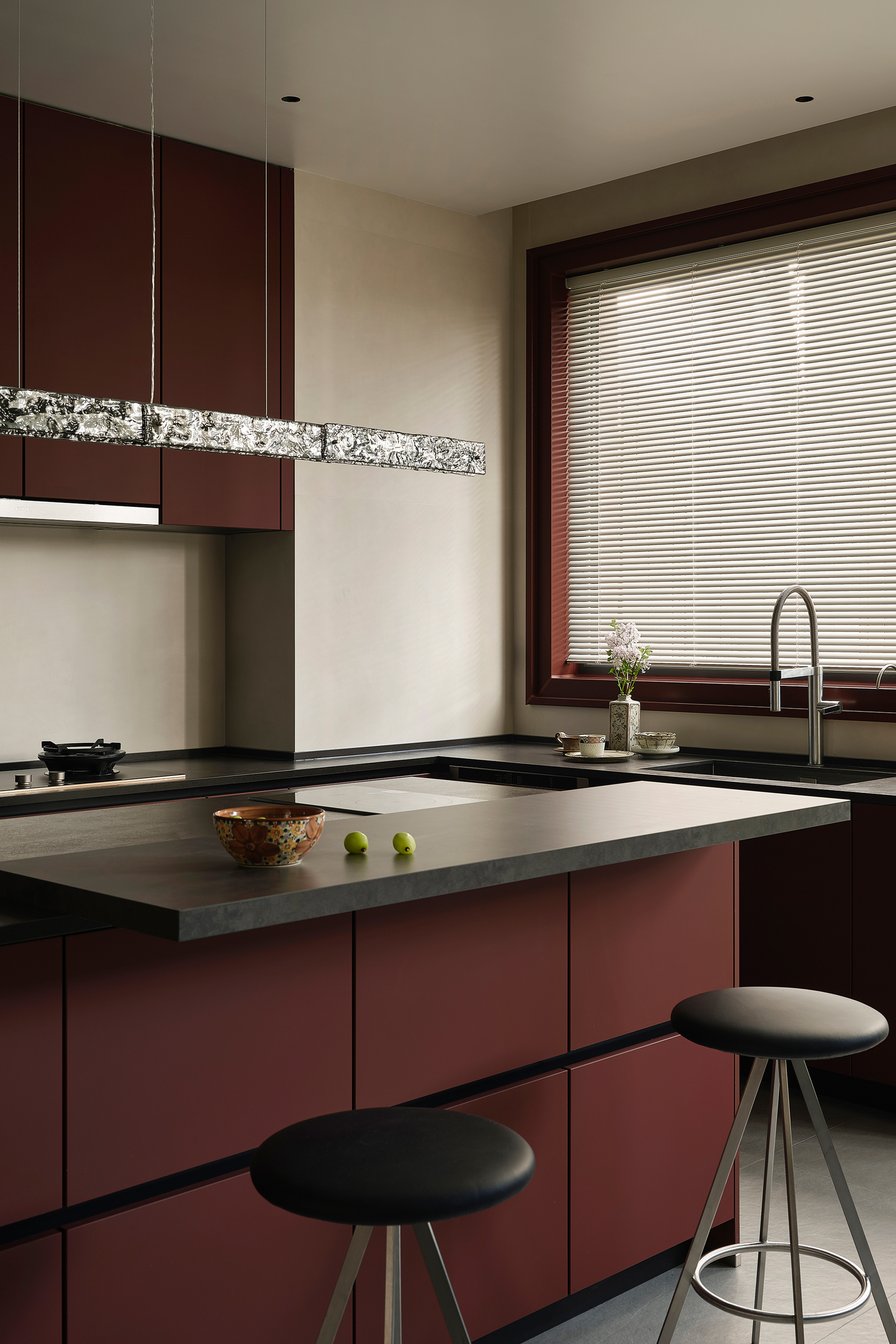 The red and black cabinetry contrasts with the metallic pendant lights, creating a dynamic interplay of warm and cool tones that adds visual tension to the space. The cabinet handles are concealed within precisely crafted seams, offering a smooth, unobstructed touch—each detail reflecting an exquisite pursuit of craftsmanship. The island countertop is made of dark stone, exuding a calm, grounded texture that contrasts with the linear lighting embedded beneath the island. Here, functionality and aesthetics achieve a subtle balance. All built-in appliances in the tall cabinet area feature flush-panel designs, maintaining a seamless and unified façade while completely concealing clutter. A perfectly proportioned circulation path is left between the island and the dining table, allowing daily movement and gatherings with friends and family to coexist without interference. Every utensil in the kitchen is carefully selected to harmonize with the overall color scheme.