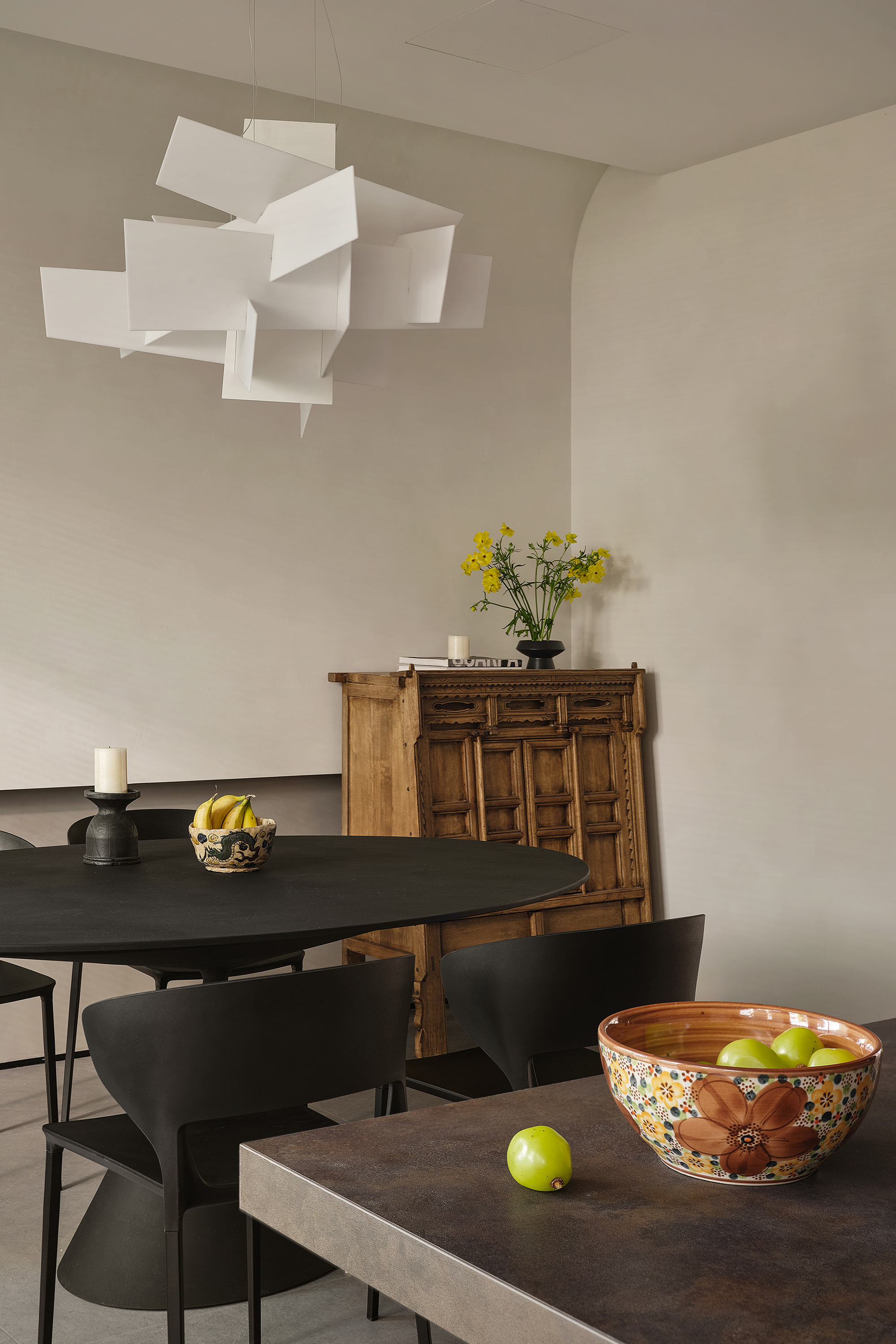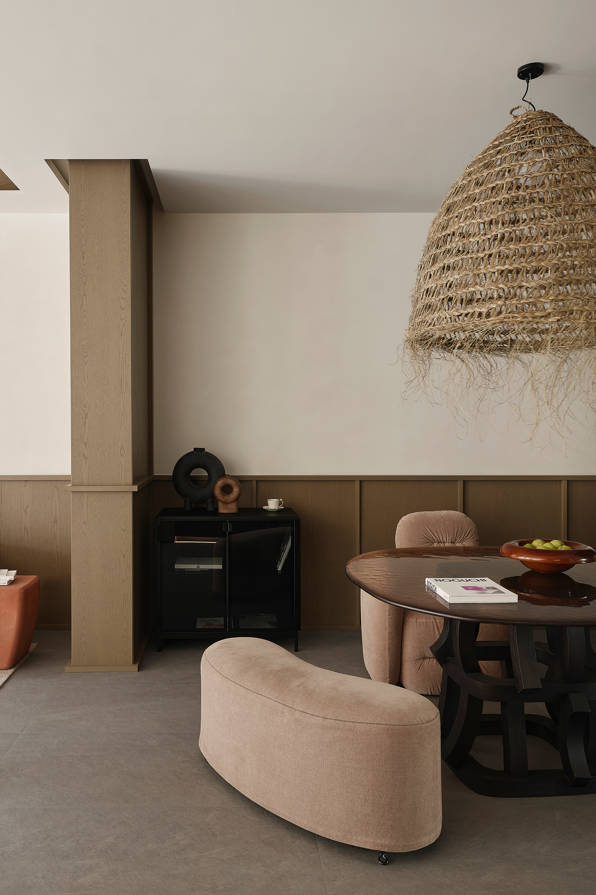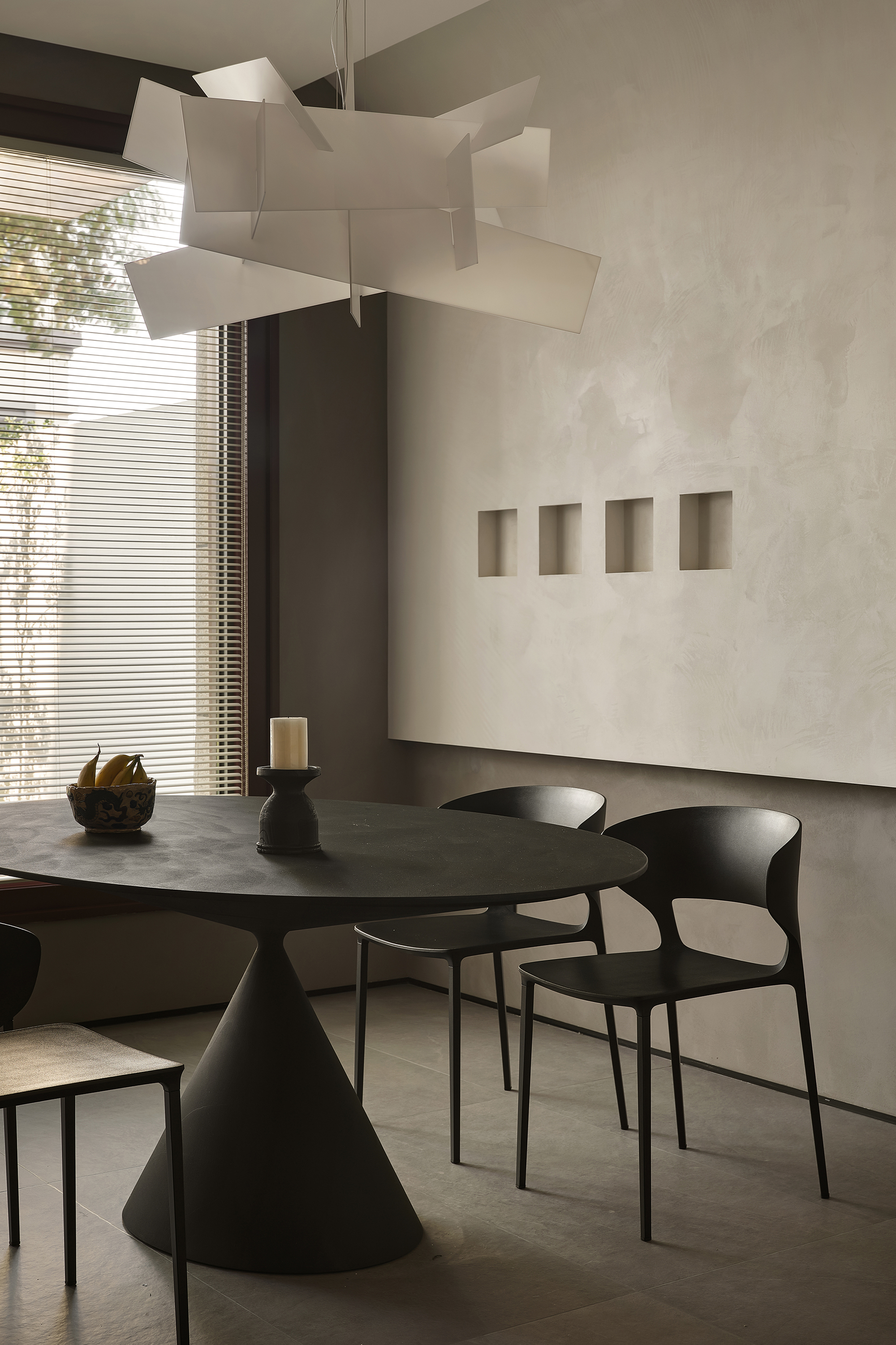 The first floor serves as the core area for daily living, integrating the living room, dining room, and open kitchen to facilitate more natural and fluid interaction among family members. After removing the original partitions, the space opens up. A full-height south-facing window brings in ample light, while the greenery of the courtyard outside subtly permeates the interior. The floor is laid with light gray textured tiles, with seams hidden within the flowing patterns, as if the footsteps of daily life glide softly across the surface. The walls retain the natural color of microcement, whose unadorned texture harmonizes with the warmth of the furniture.