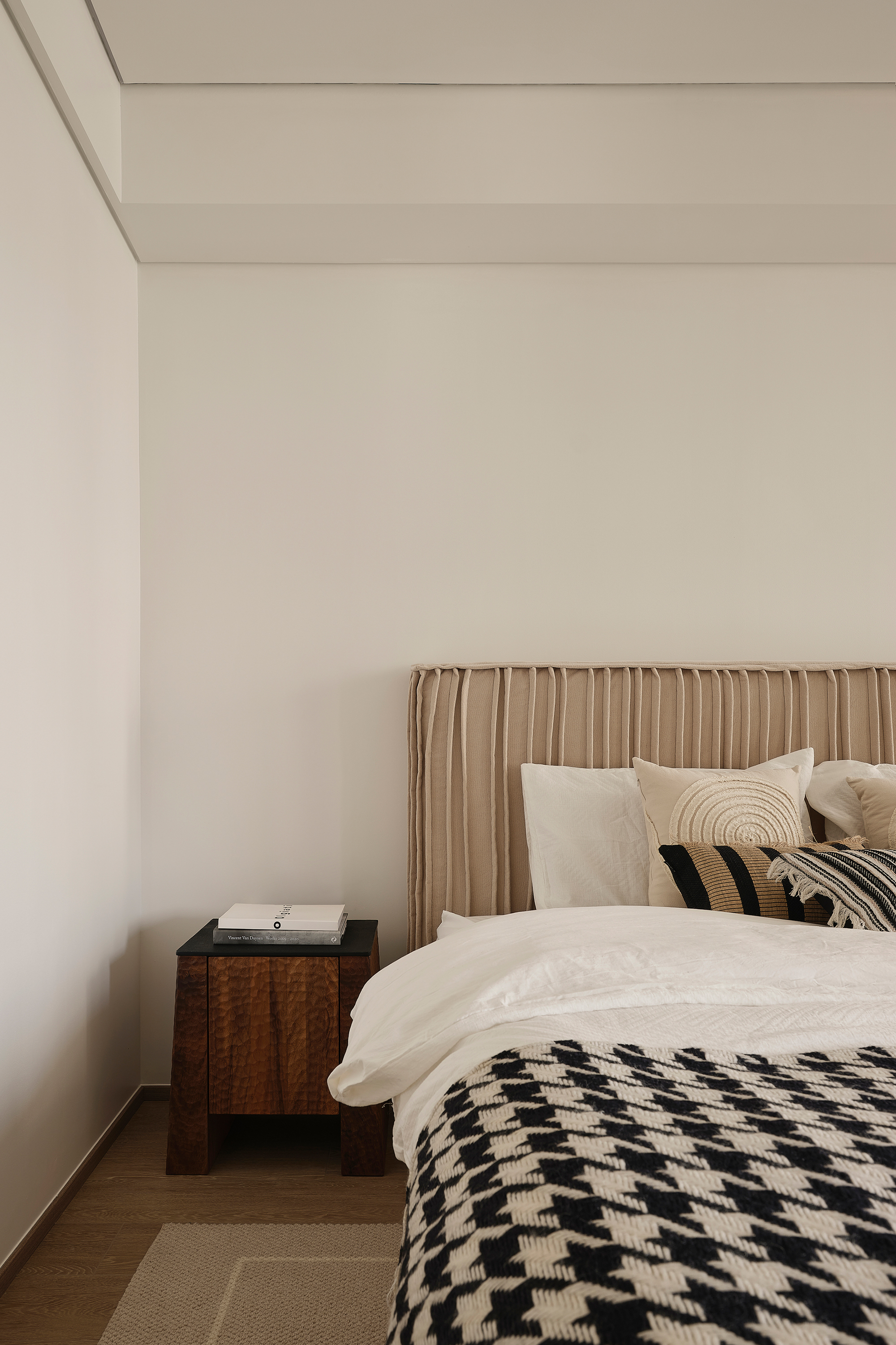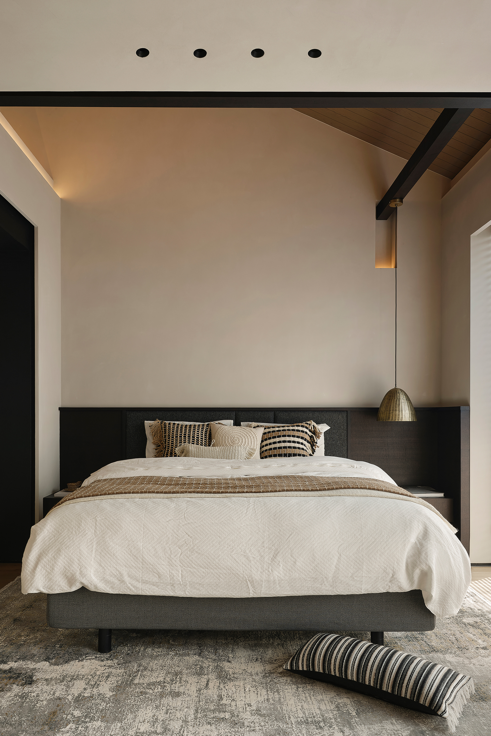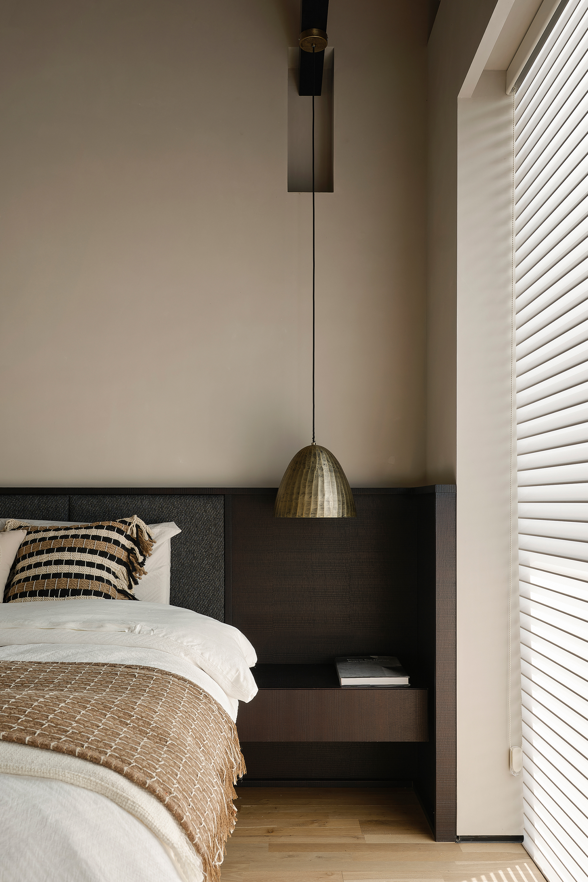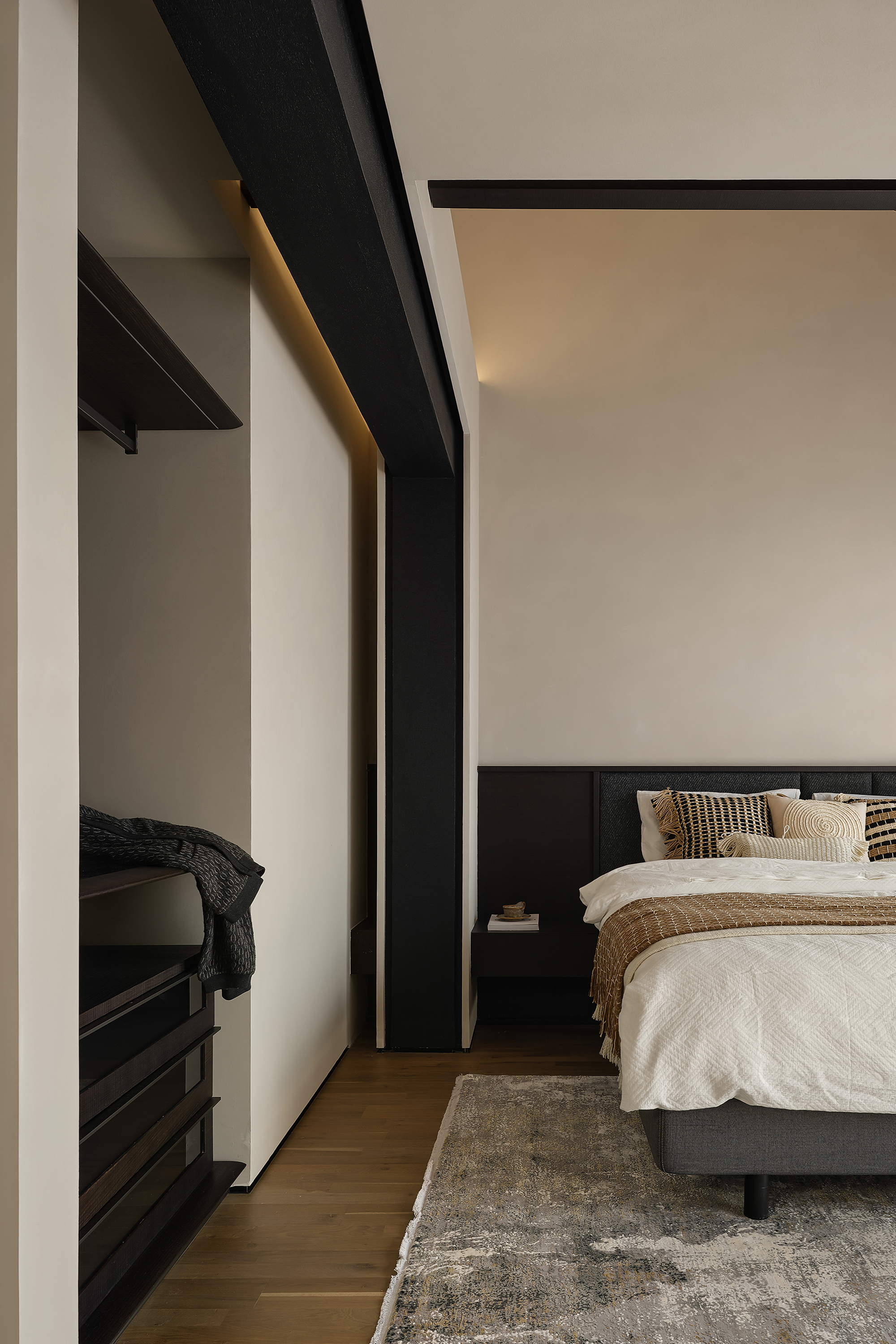 The black beams and columns beside the master bed are not for show; through structural renovation, they create a more comfortable scale in what was originally a cramped bedroom. Additionally, by opening the floor above the sleeping area, the building's originally sloped roof can interact with the beams and columns, creating a unique spatial experience. The wall between the master bathroom and the walk-in closet is made of rippled glass bricks, which not only allow more light to pass through but also add a playful touch to daily life.