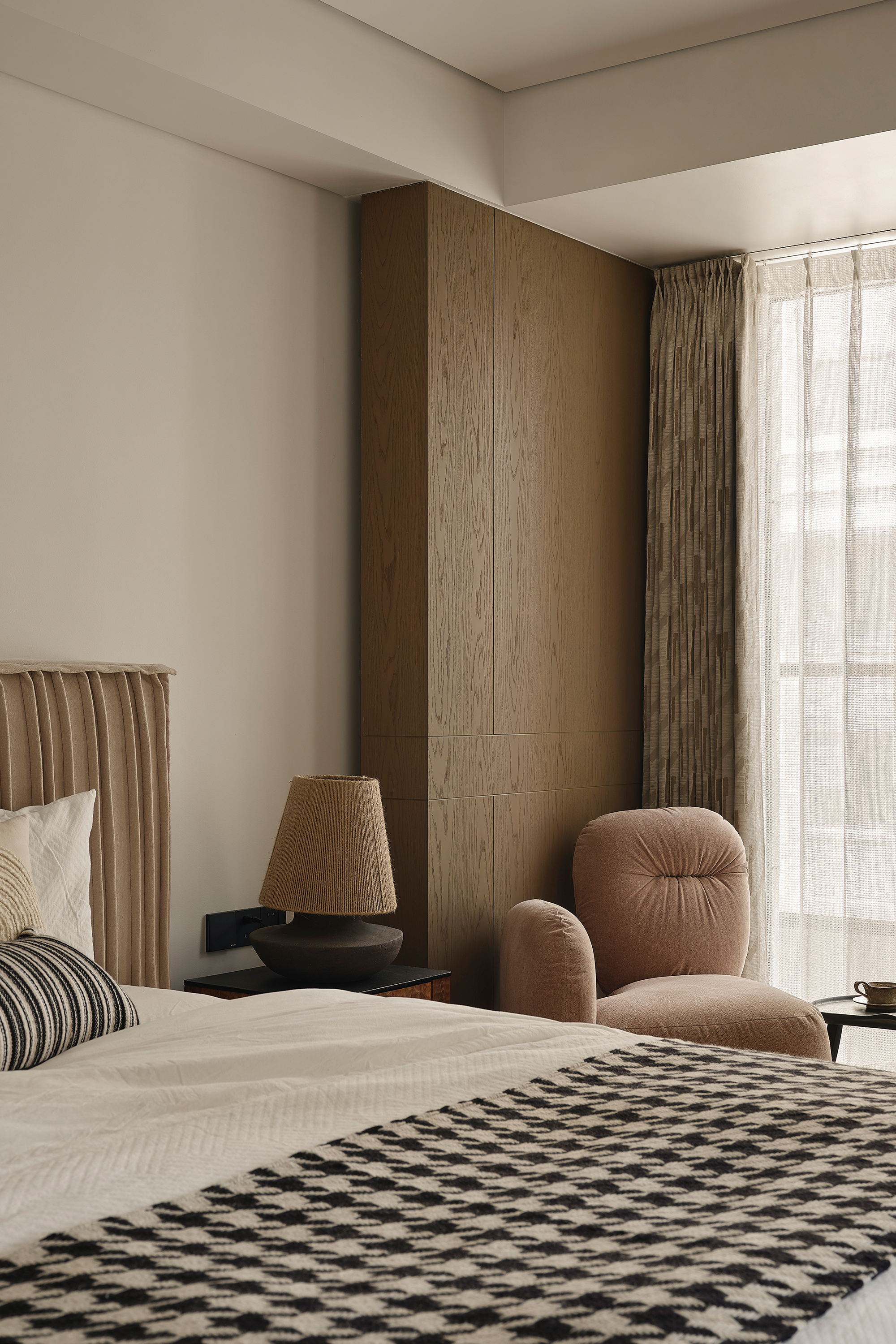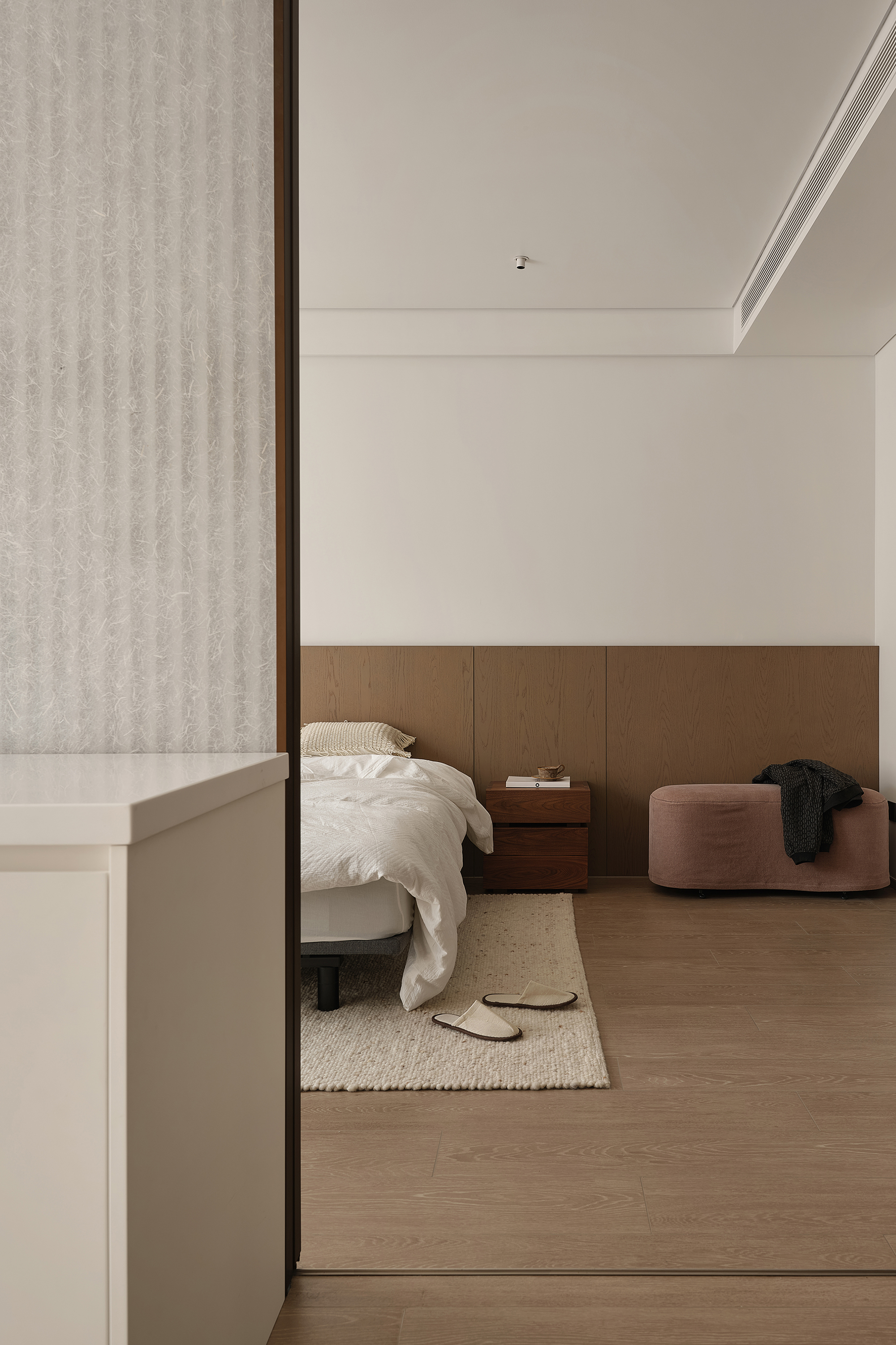 The south-facing bedroom on the second floor is integrated with the laundry area according to the owner's lifestyle. An acrylic screen diffuses soft light and shadow, blurring the boundary between the laundry and the resting area—maintaining privacy while preserving a subtle connection. The space achieves a balance between function and emotion, with every detail responding to the genuine needs of its occupants. The north-facing bedroom on the second floor is designed as an independent suite. By leaving material transitions understated, the space flows into a tranquil atmosphere. The wood paneling seamlessly connects with the wooden floor tiles, creating a warm and restrained private space. The window frames lightly carve the shifting light of the seasons, and when the setting sun shines at an angle, the wooden floor glows with a warm amber hue.