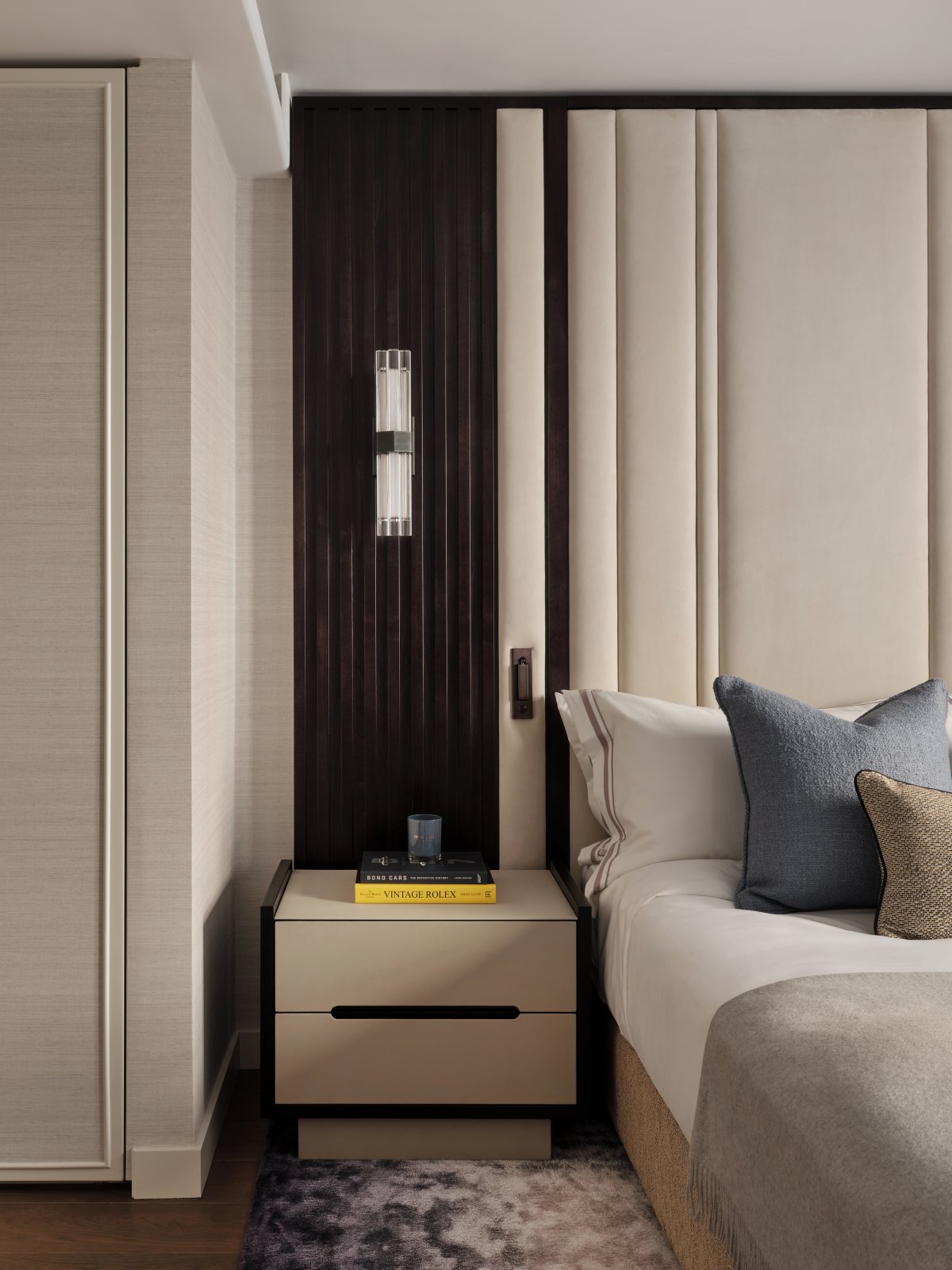 In addition to feeling contemporary, the aesthetic was designed to invoke tranquillity and well-being, offering the client a sanctuary amidst the hustle and bustle of Marylebone. Large floor-to-ceiling windows envelop the living space in natural light, accentuating the warm-toned furniture and bronze detailing. The large, limited-edition Barn-In-The-City dining table is a special bespoke design by Taylor Howes and perfectly complements the space. Its rectangular glass top reflects natural light around the space, making the delicate Rock&Soar installation sparkle above. In keeping with the overall design theme, the master bedroom features a soothing palette of cool neutrals and sandy hues.