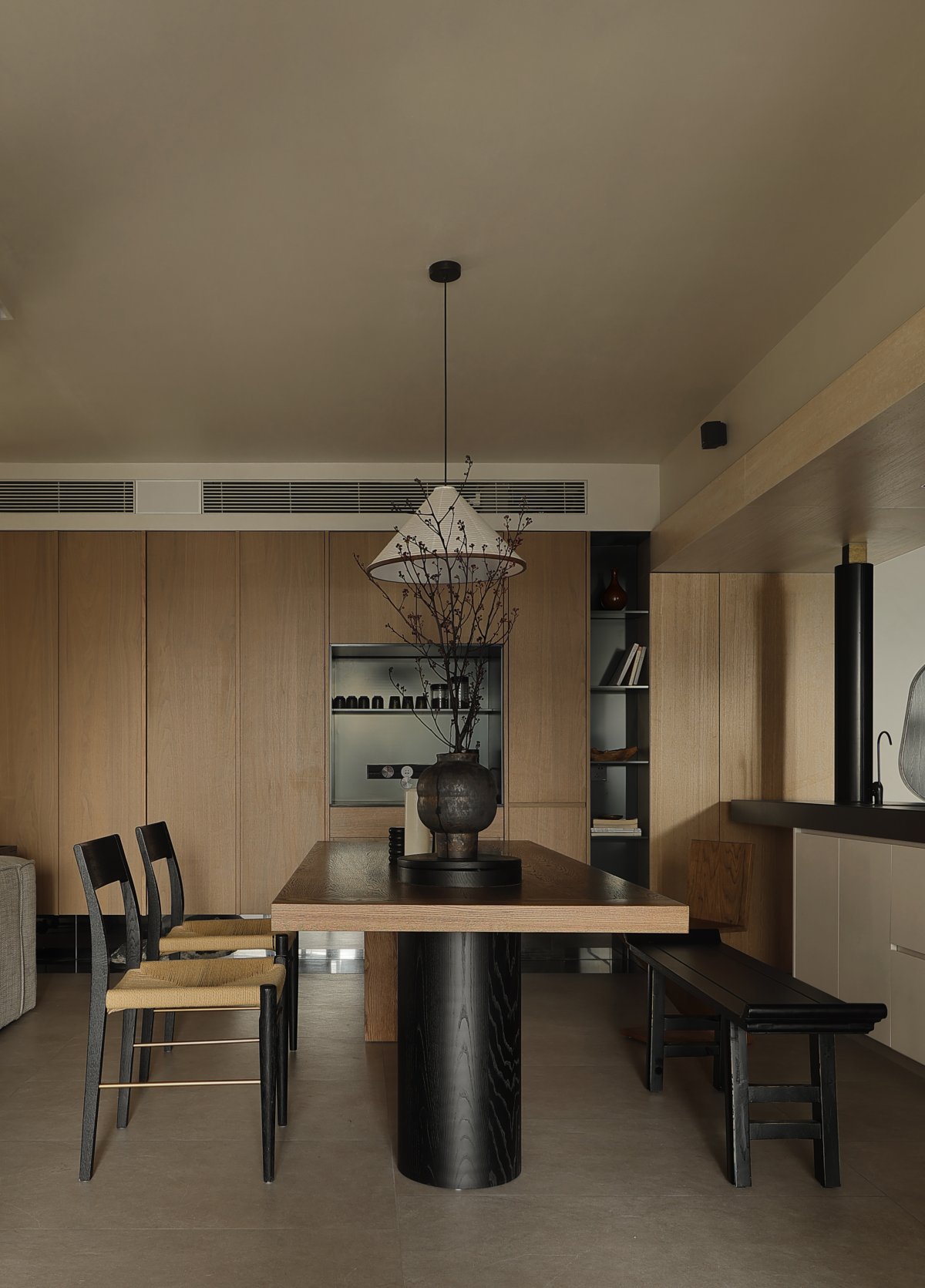 The decorative cabinets with exotic styles are decorated with artistic ink paintings, ethereal and evocative. Natural materials superimposed makes the space more simple and Zen.