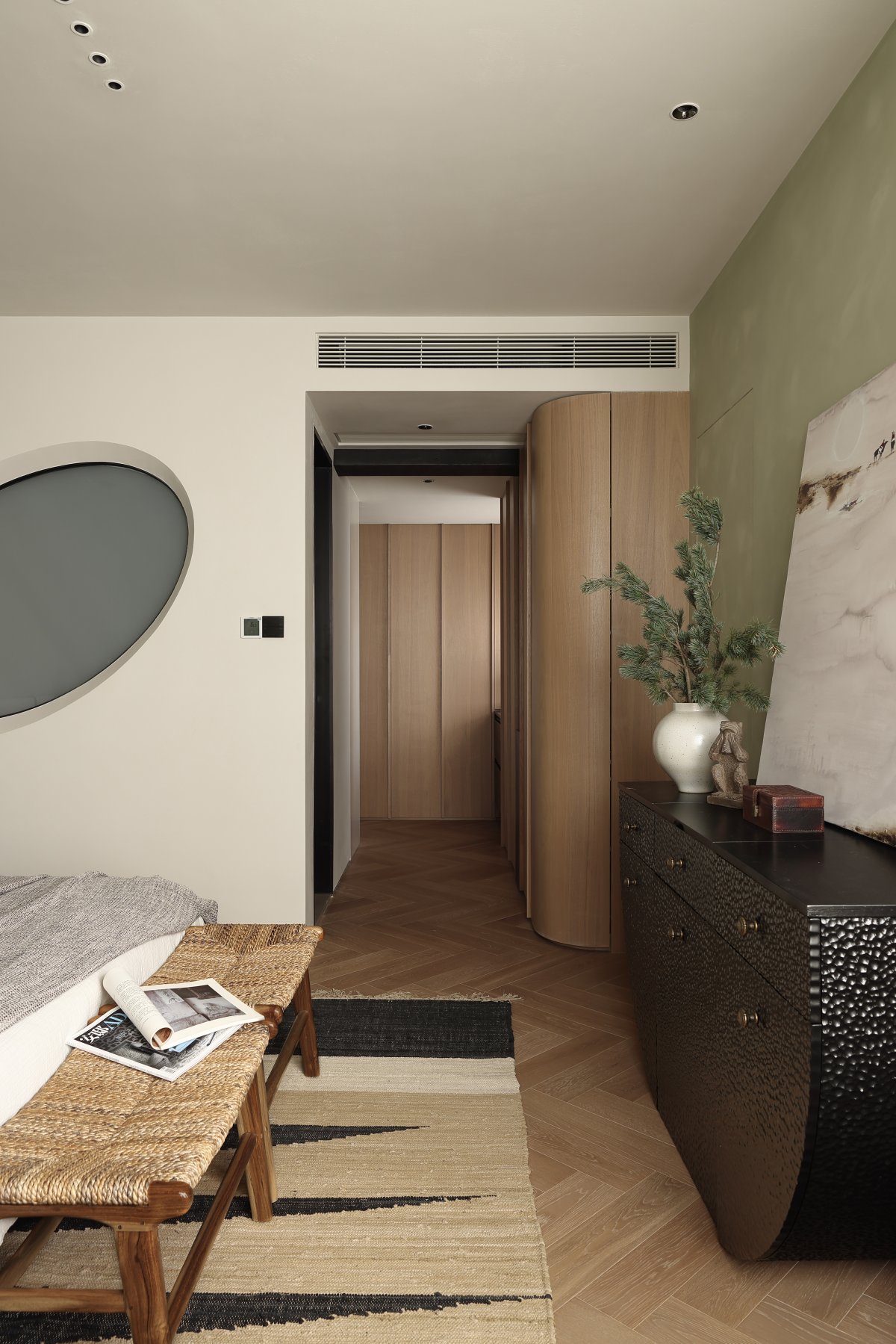 The reconstruction of the main bathroom balcony divides the washing and the bathing areas. The overall layout is simple and elegant. The oval mirror in the washing area creates a visual hierarchy, and the wooden grille shapes a rustic atmosphere, balancing the convenience in different life scenarios.