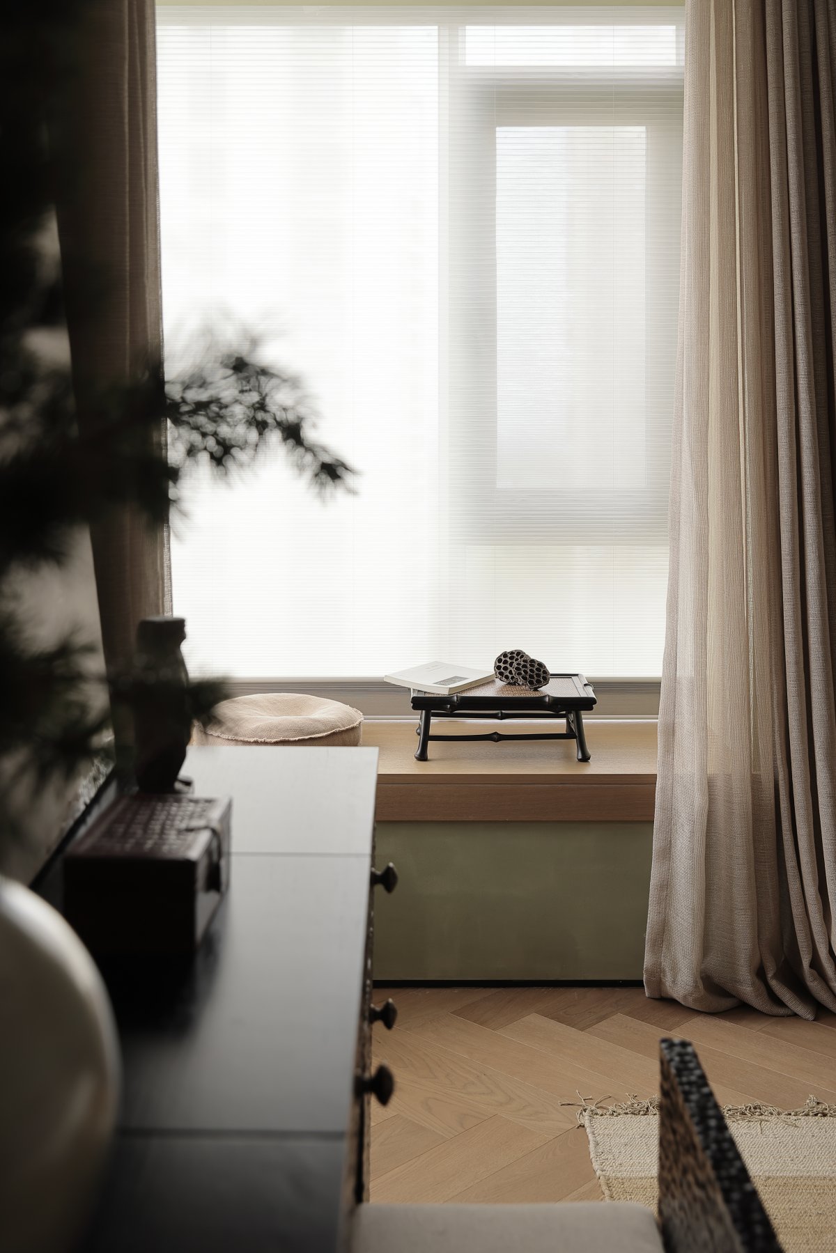 The inner porch serves as a more private channel for emotional transition, creating a unique sense of step-in ceremony. The decorative cabinets with exotic styles are decorated with artistic ink paintings, ethereal and evocative.