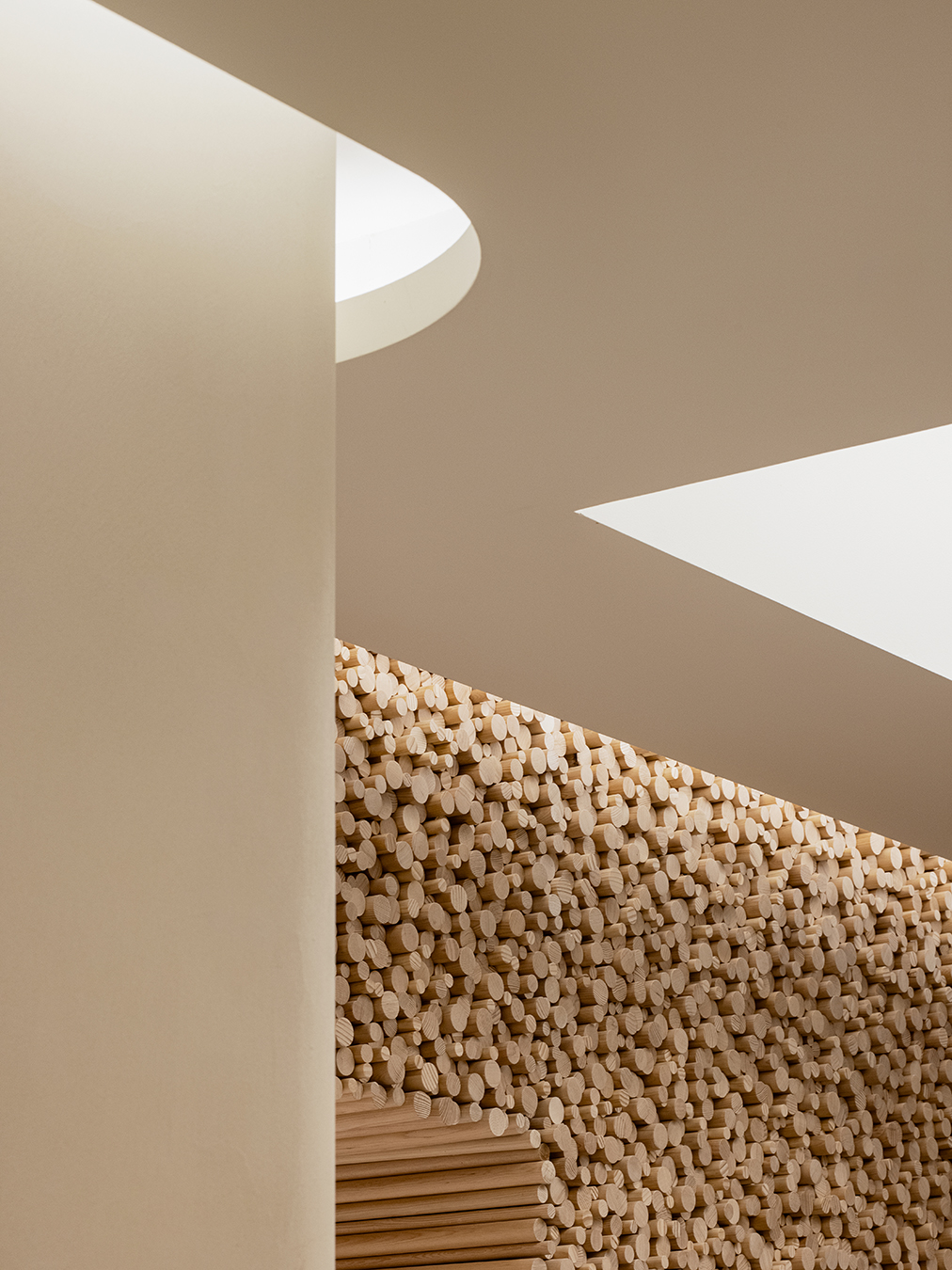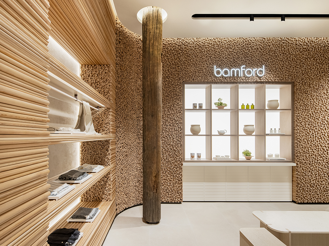 Bamford is a 174.69m² wellness spa located in Seoul, South Korea. Through the studio's careful design, the spa has been given its identity. The project uses wooden sticks and their stacked textures to create a contrast between natural and manufactured materials.