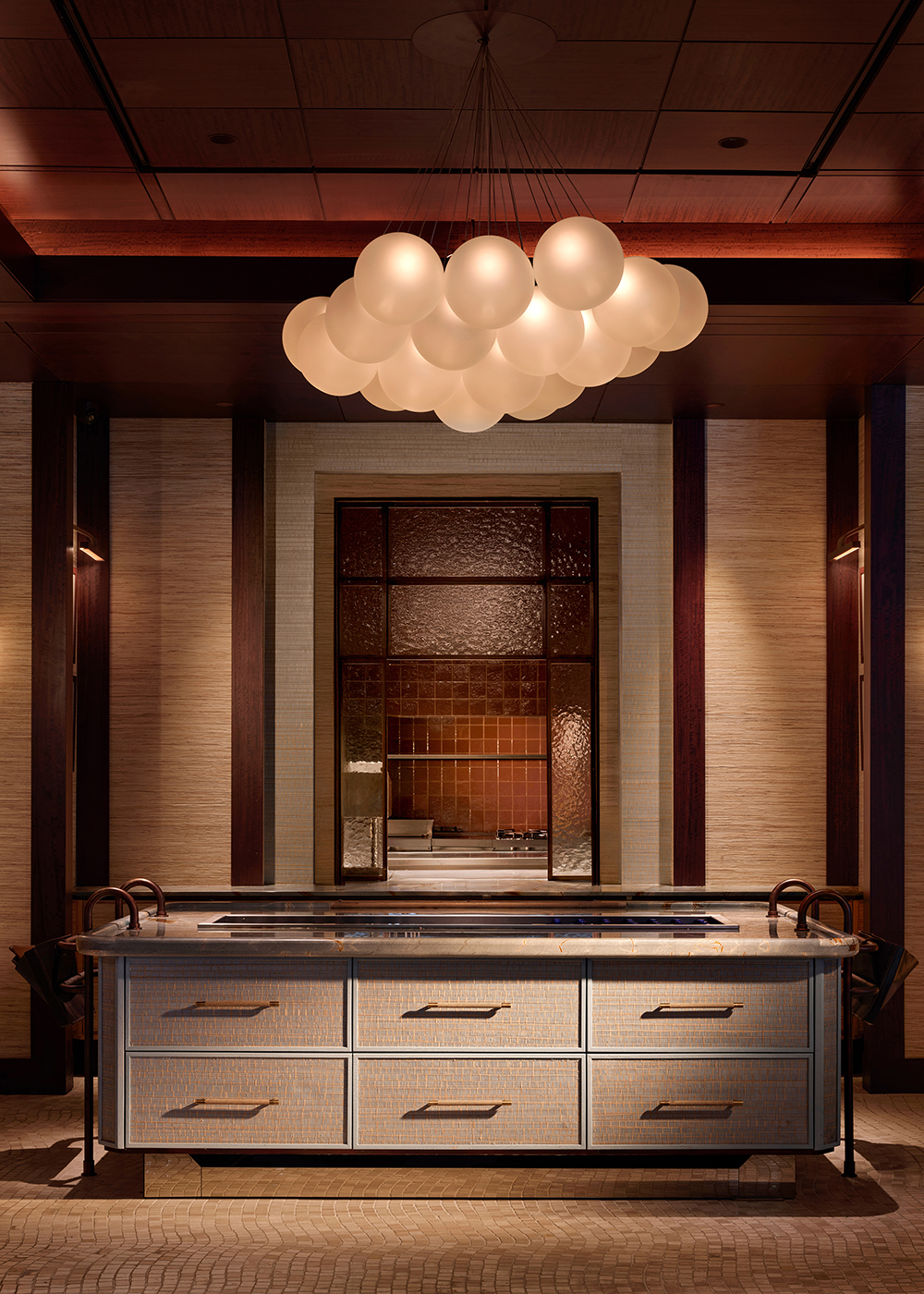 Every design detail and furniture piece at Scalla has been crafted bespoke for the project by URBANJOBS in a scheme of copper, leather, and wood—materials chosen for their warmth, tactility, and visual coherence. This bespoke approach reinforces the restaurant’s crafted identity and architectural clarity. A focus on material honesty and fine detailing elevates the dining experience, transforming it into something deeply personal and impossible to replicate. Key examples include the striking blue marble-effect cabinetry, used at the central bar and throughout the space, featuring refined copper-toned hardware from Turnstyle Designs and an engraved floor plaque bearing the restaurant’s name. Upholstered seating in rich fabrics from Dedar and Ralph Lauren introduces layers of texture and softness, while the flooring features a subtle, geometric tile pattern that lends rhythm and continuity to the space. Walls are adorned with a tactile mix of wallcoverings by ARTE and Phillip Jeffries, adding further depth and material interest.