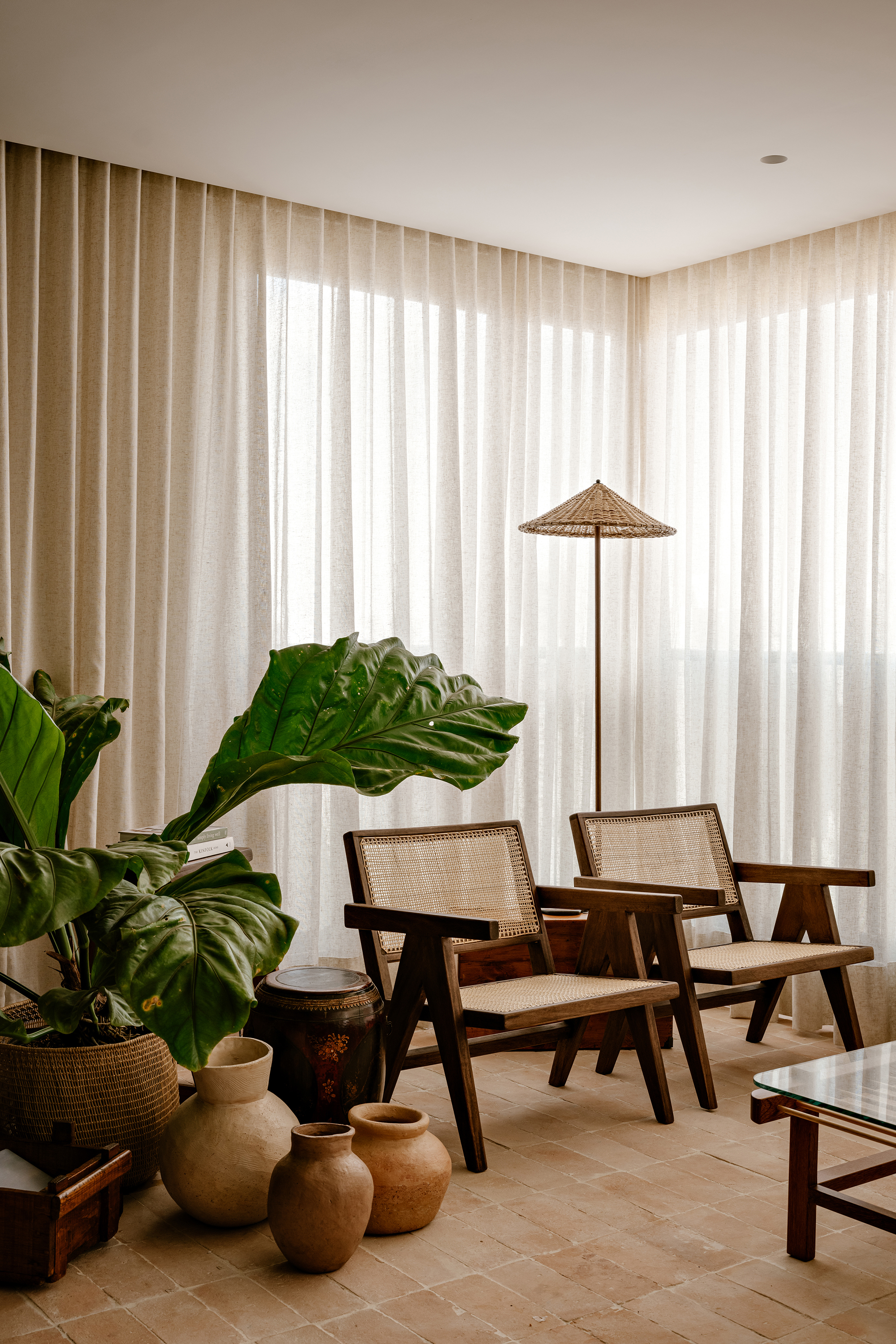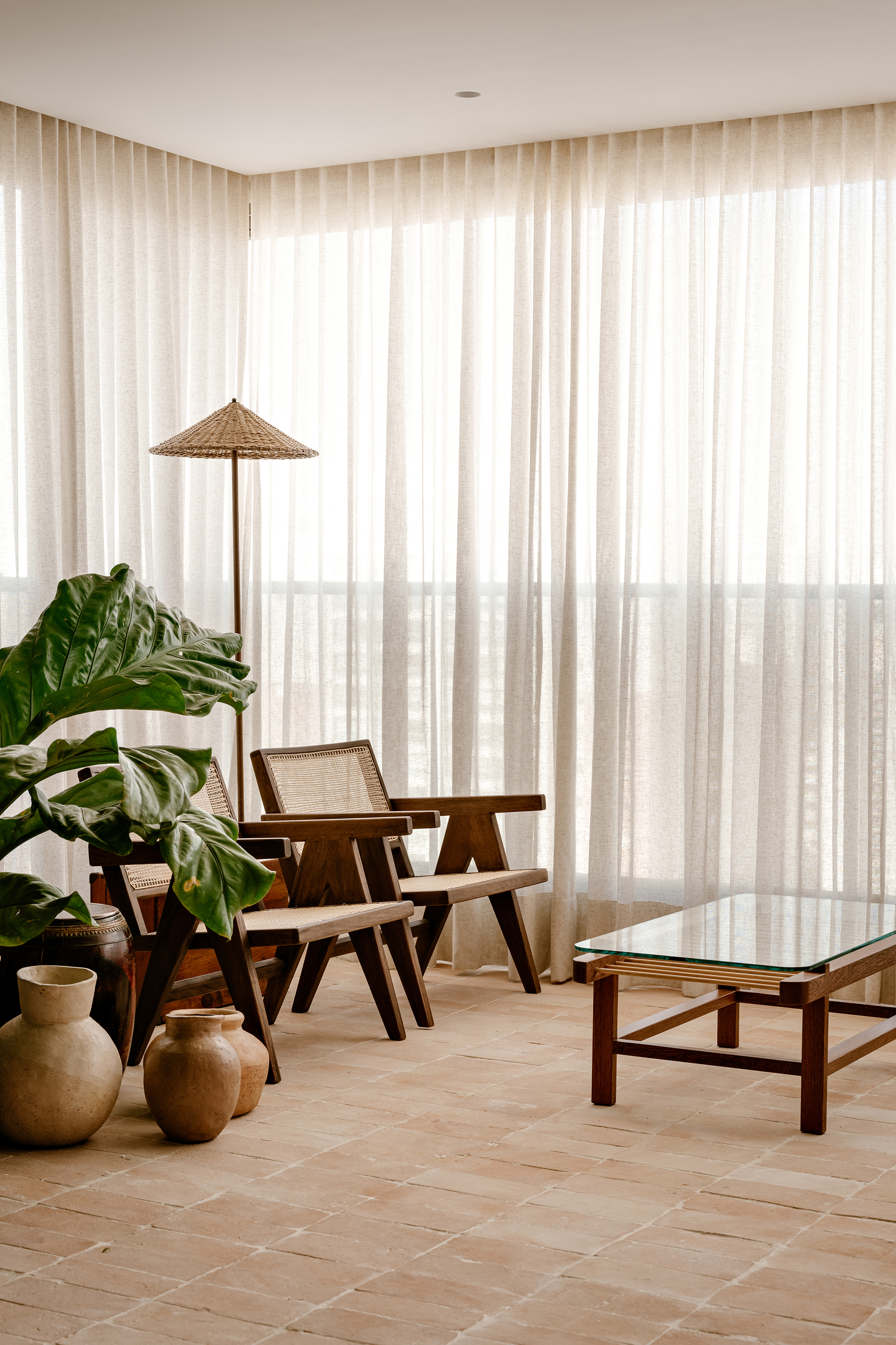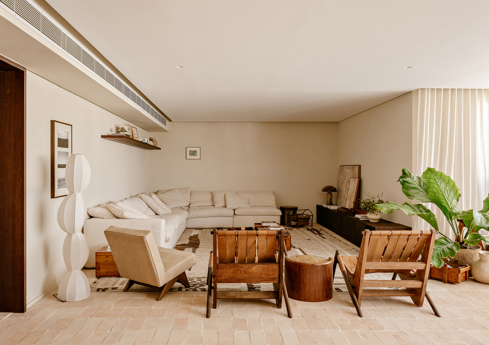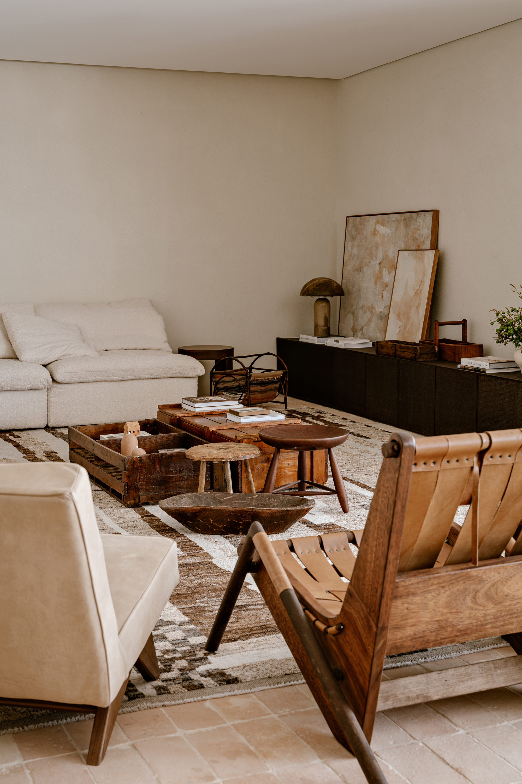 The color palette, rooted in earthy tones, unfolds through complementary textures: wood, stone, natural fibers, and fabrics. This composition creates a timeless and cohesive environment, moving subtly between rustic and contemporary. Natural light, filtered through translucent linen curtains, enhances the lightness of the whole while revealing the interplay between bright surfaces and denser volumes.