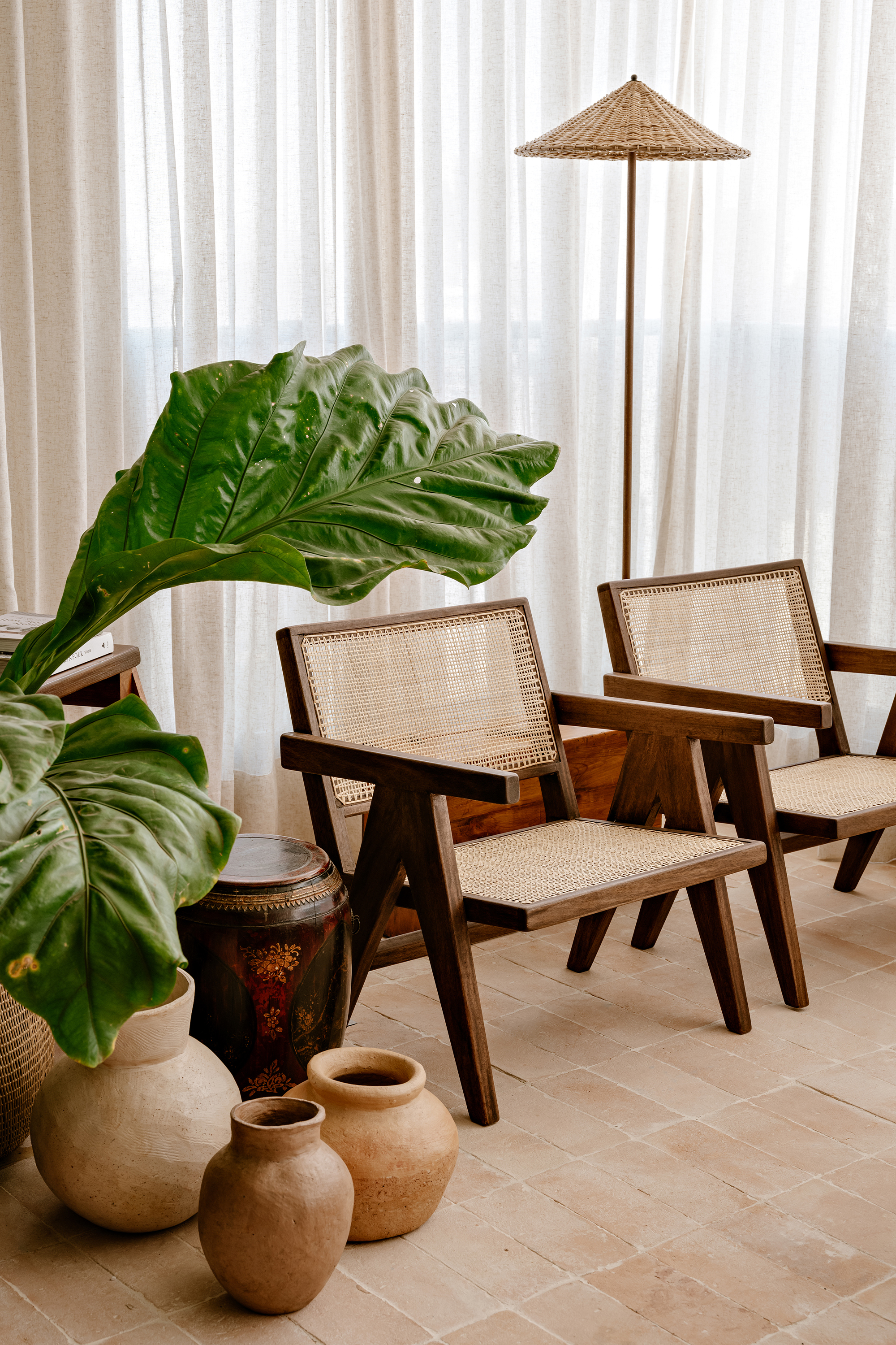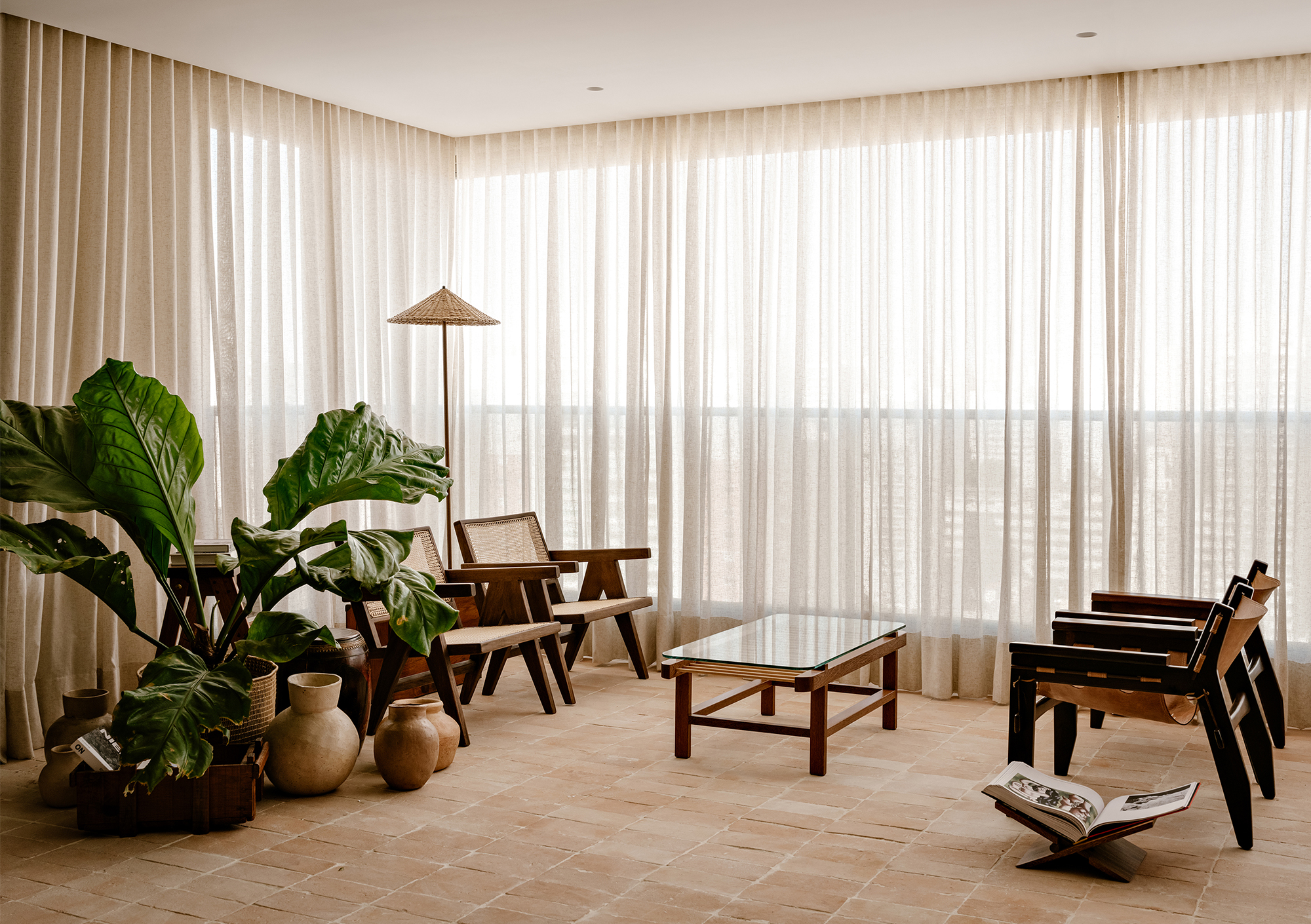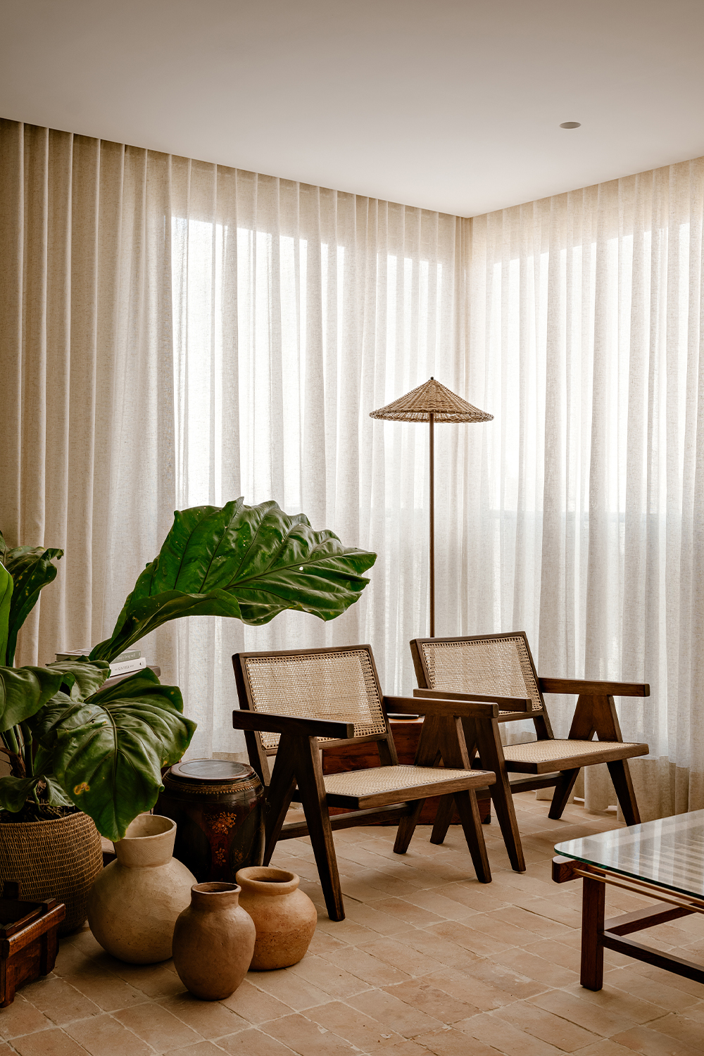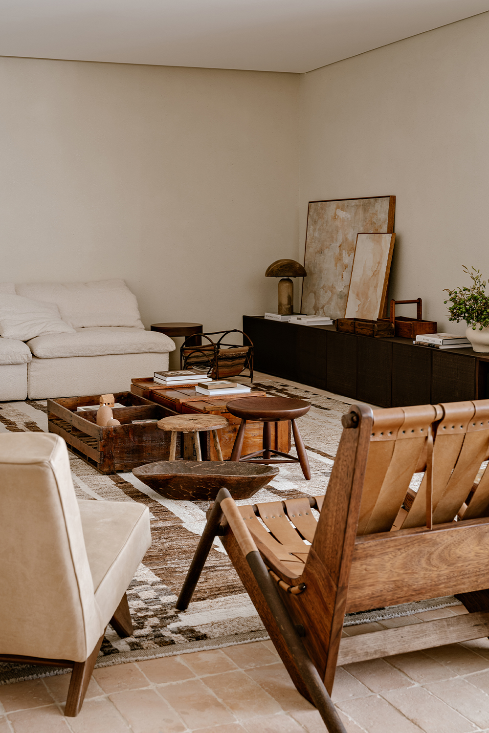 The color palette, rooted in earthy tones, unfolds through complementary textures: wood, stone, natural fibers, and fabrics. This composition creates a timeless and cohesive environment, moving subtly between rustic and contemporary. Natural light, filtered through translucent linen curtains, enhances the lightness of the whole while revealing the interplay between bright surfaces and denser volumes.