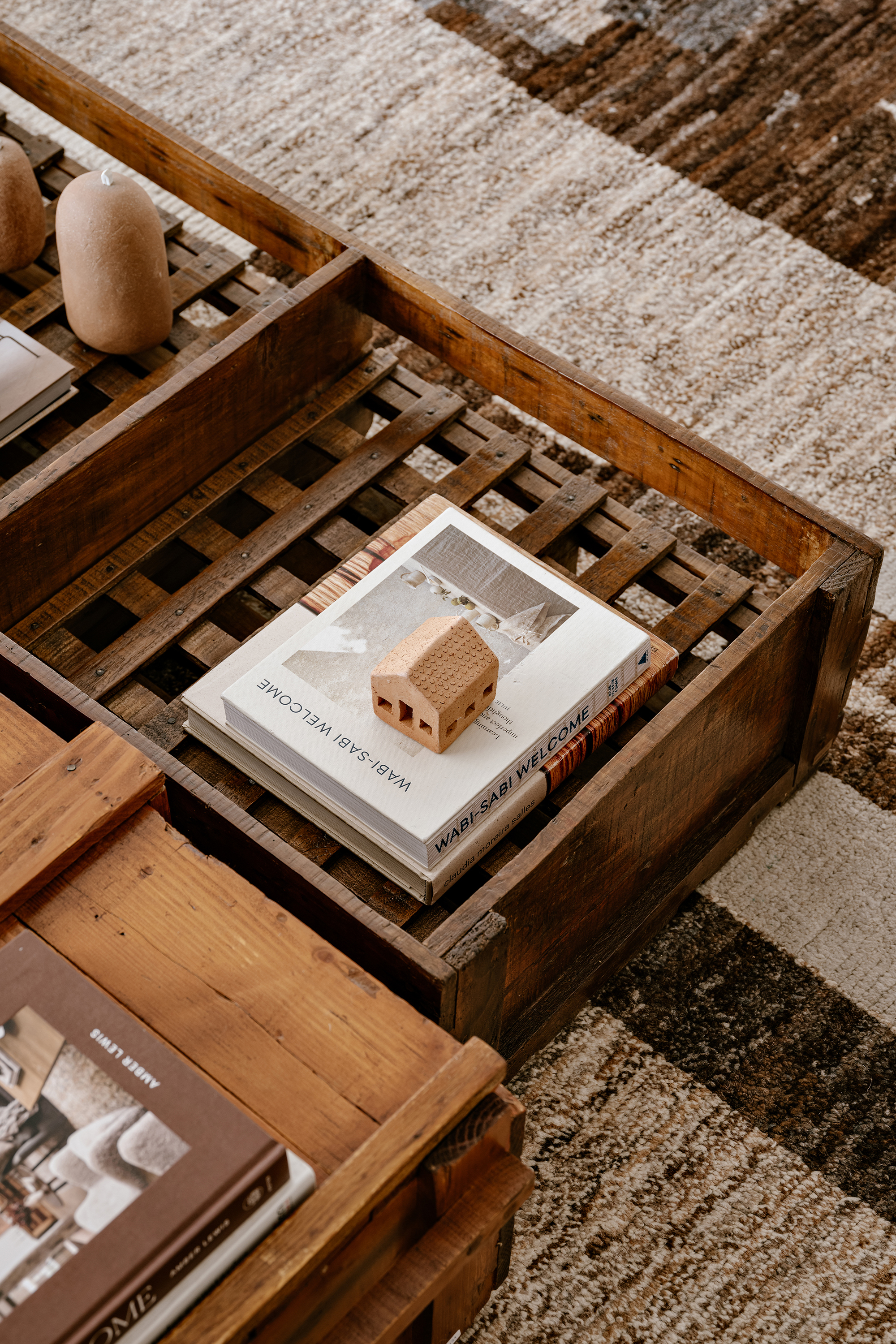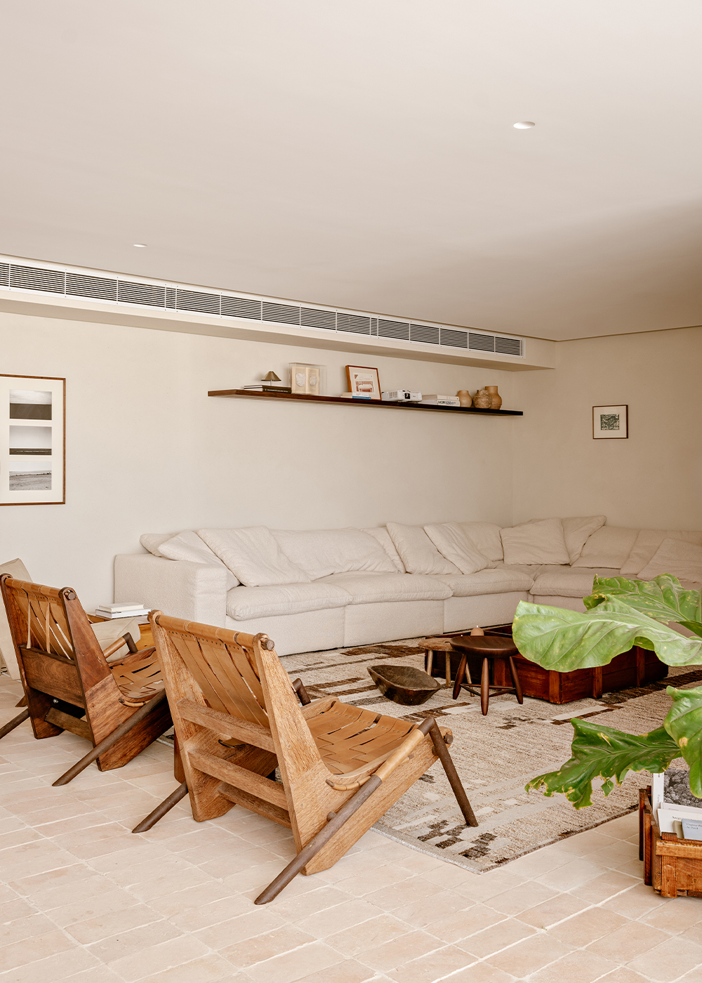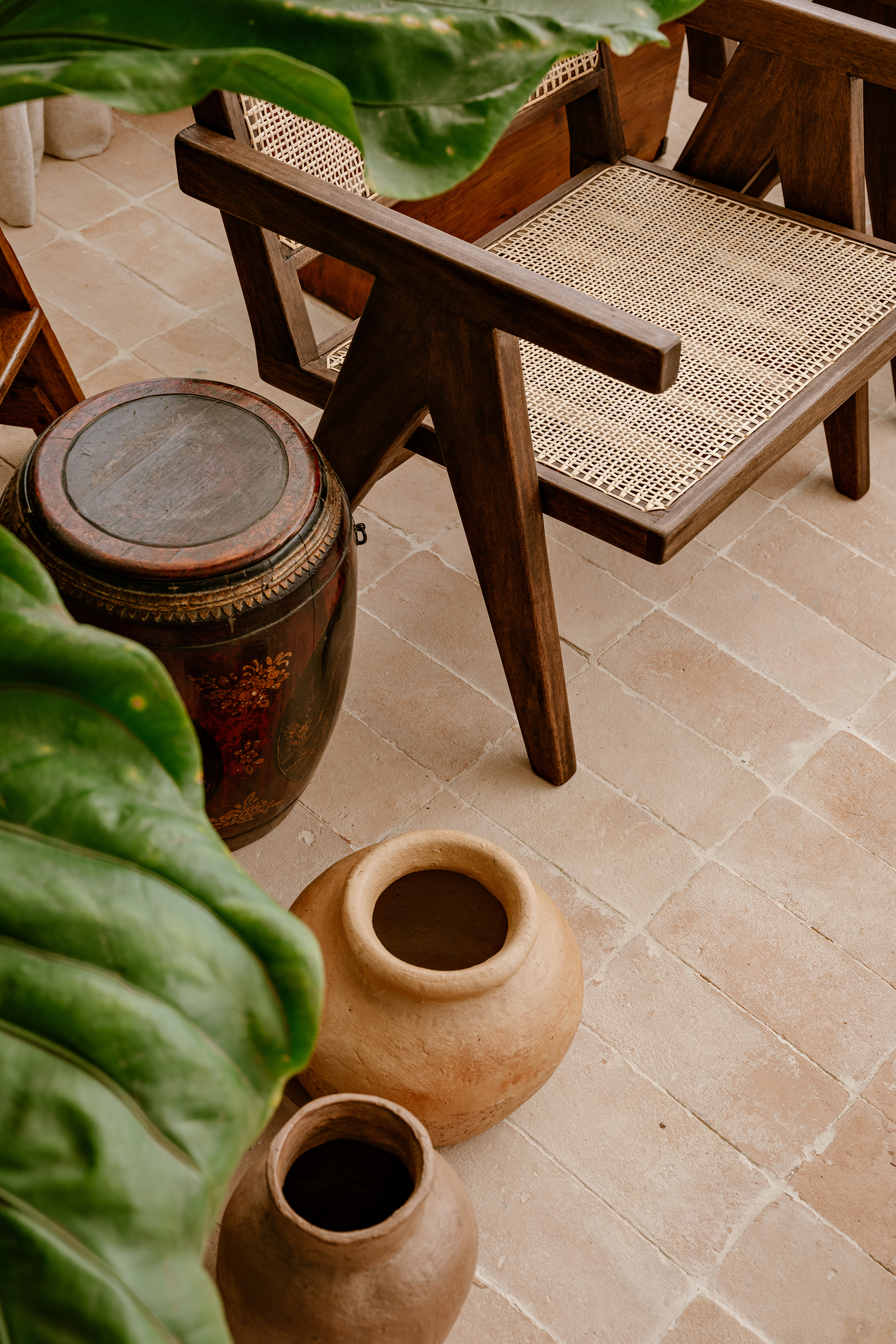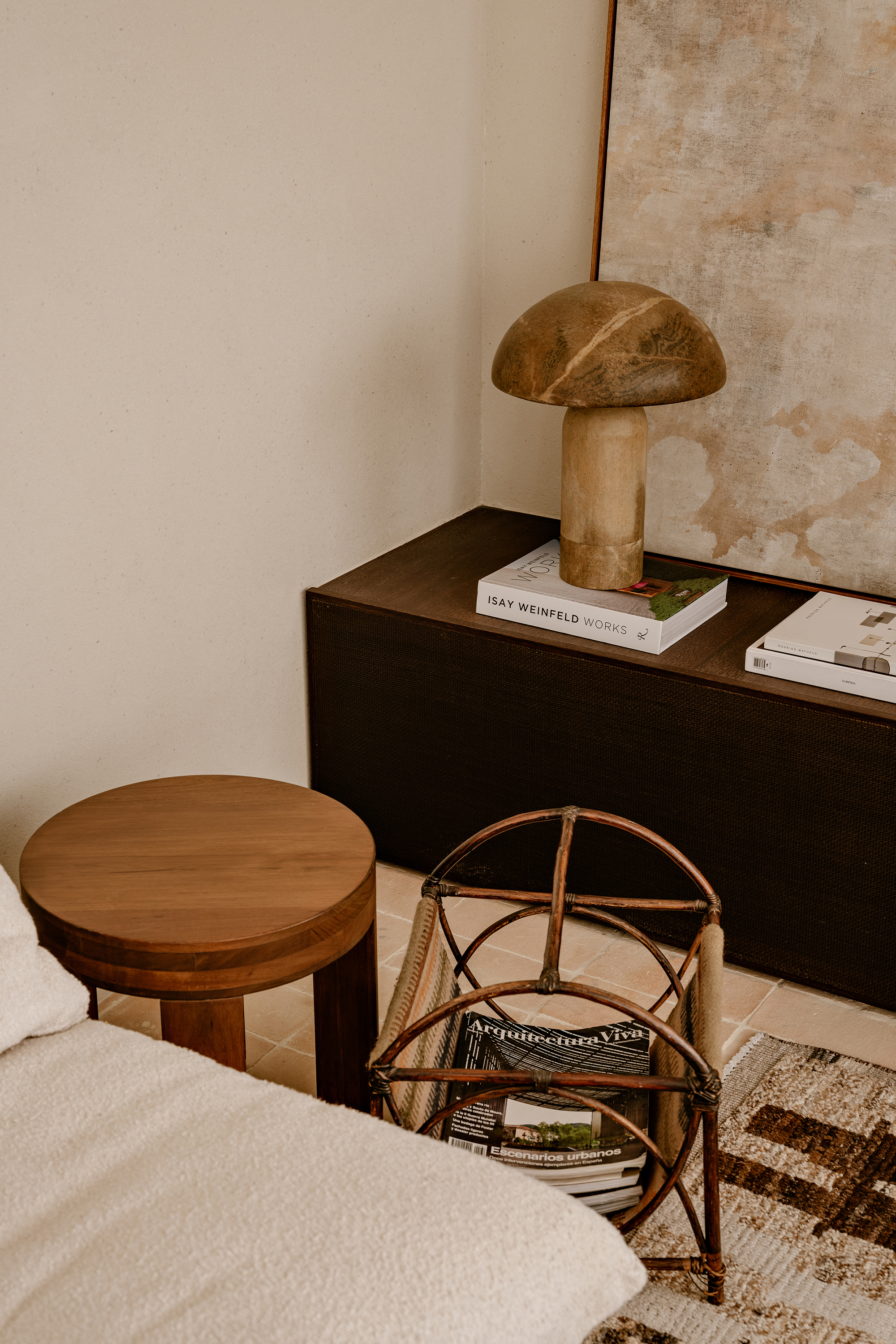 The color palette, rooted in earthy tones, unfolds through complementary textures: wood, stone, natural fibers, and fabrics. This composition creates a timeless and cohesive environment, moving subtly between rustic and contemporary. Natural light, filtered through translucent linen curtains, enhances the lightness of the whole while revealing the interplay between bright surfaces and denser volumes.